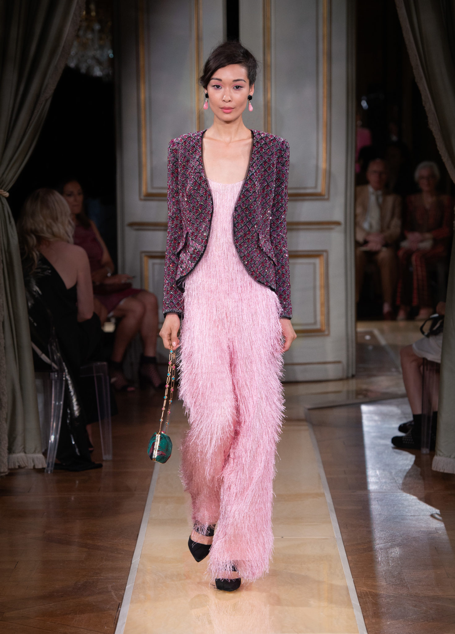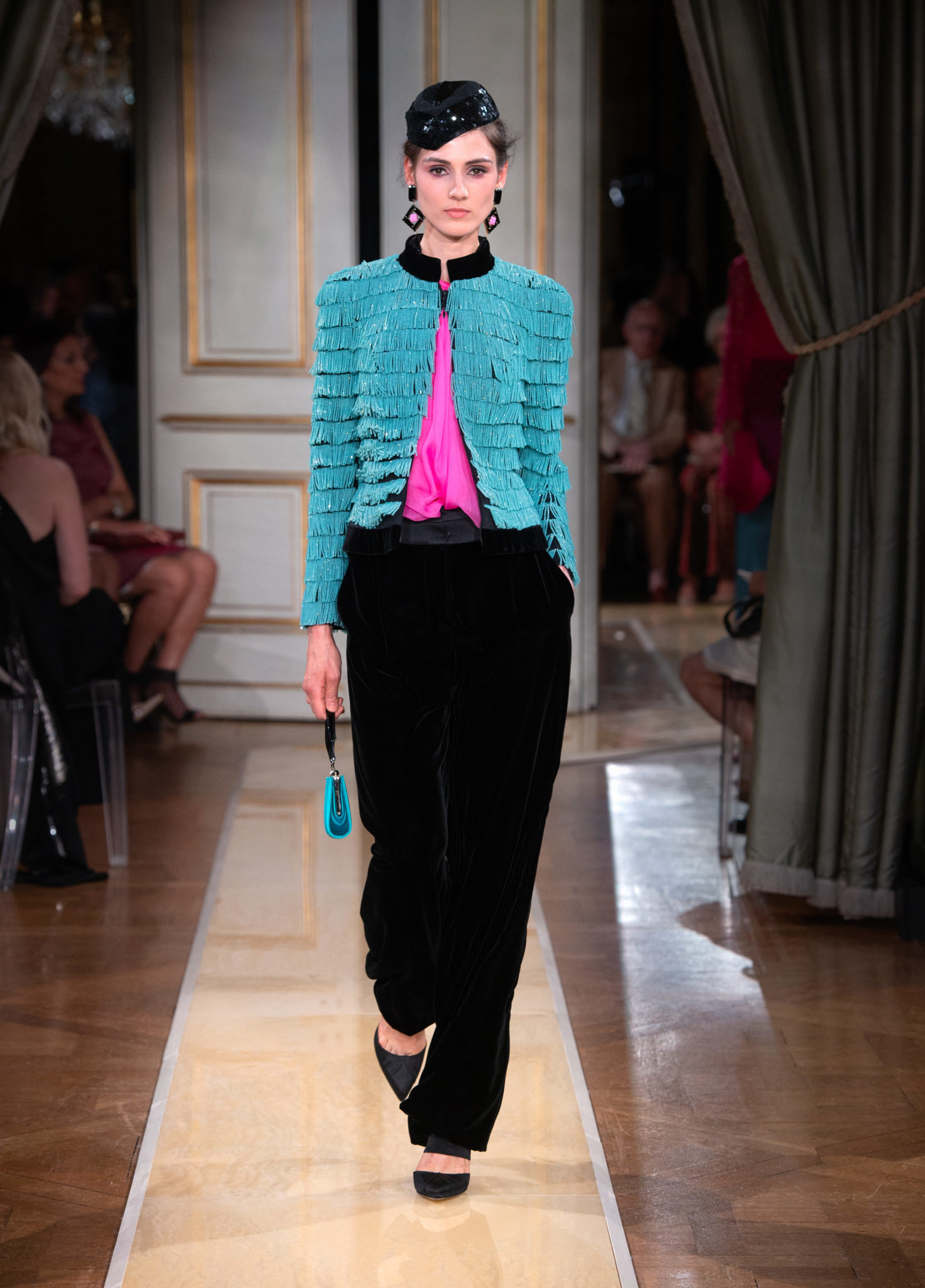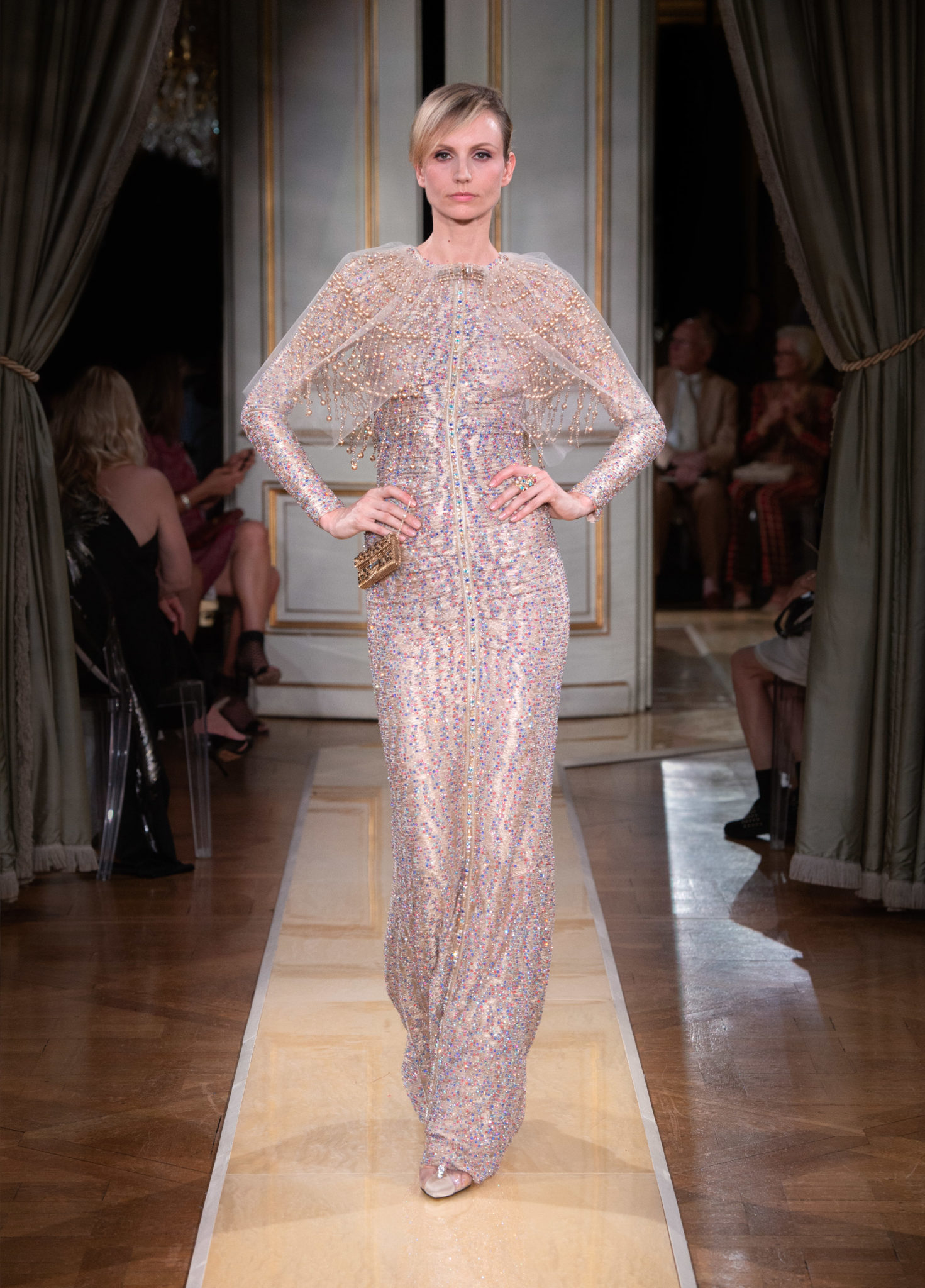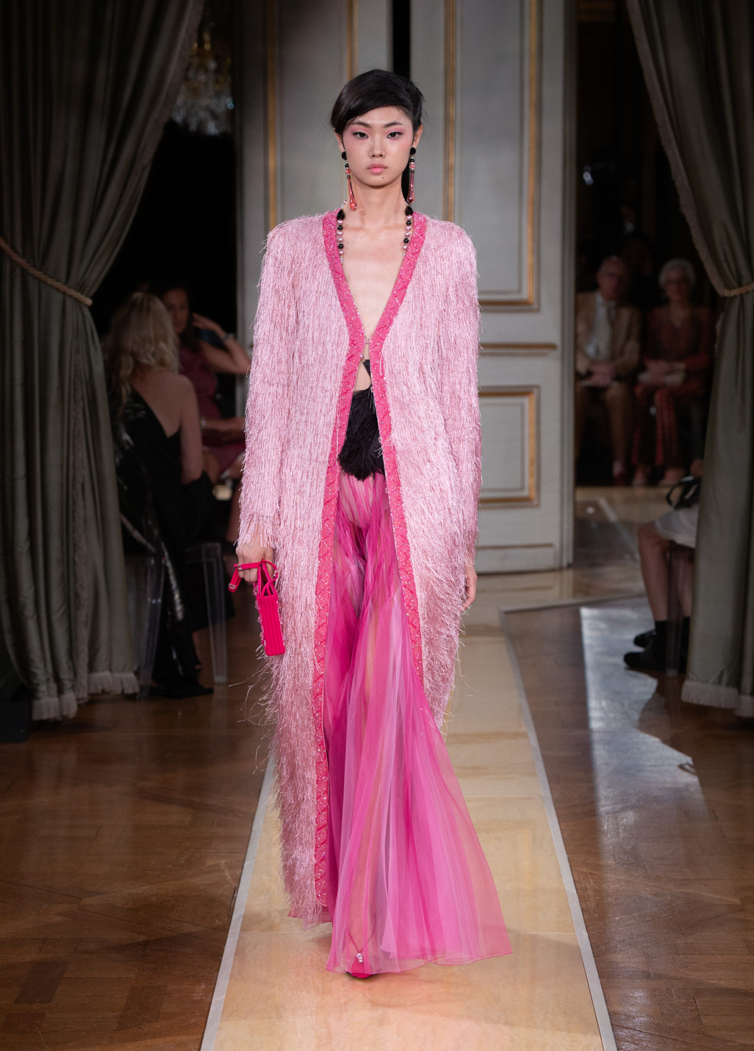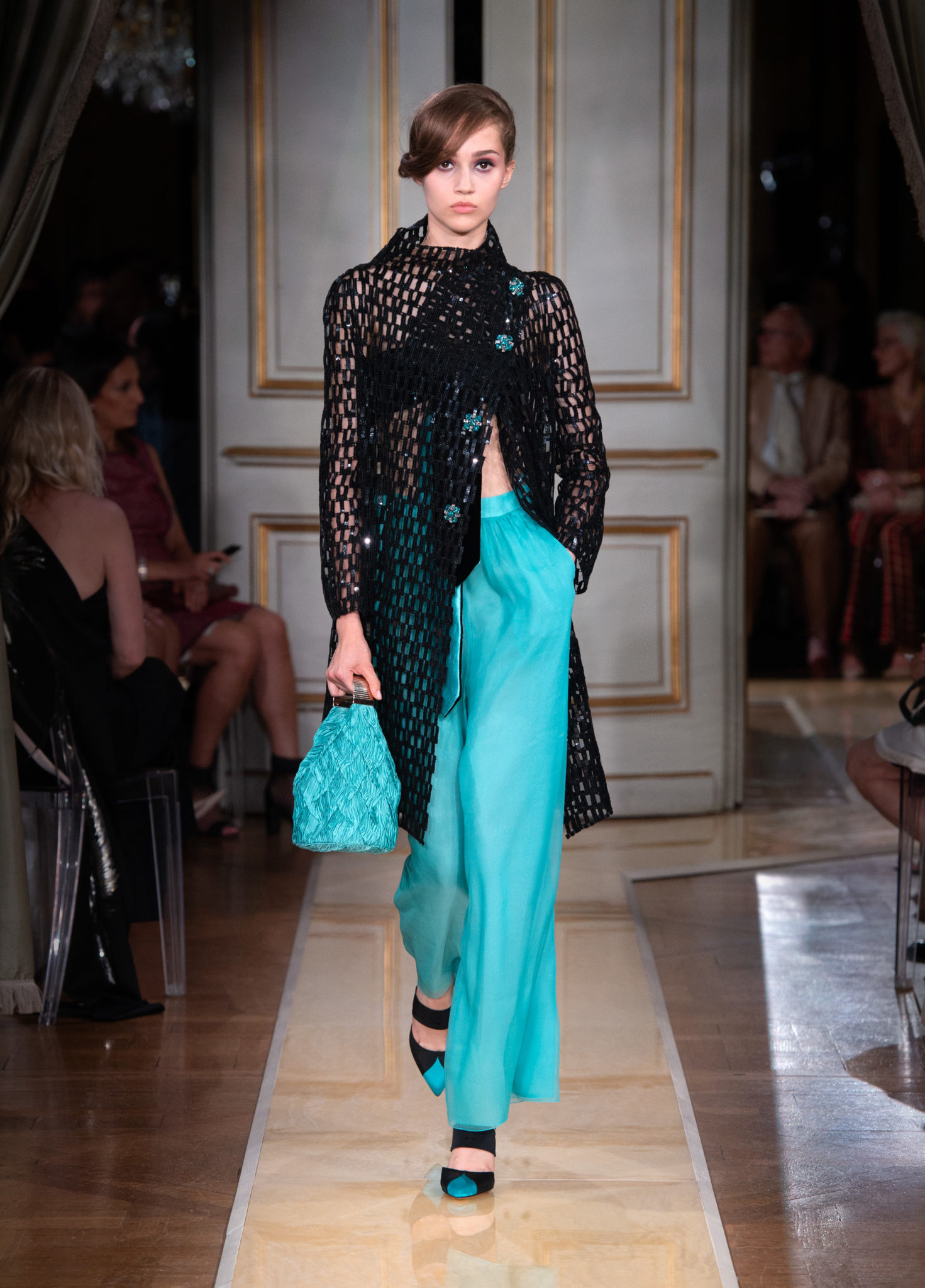 CHEF-D’ŒUVRE À MI-CHEMIN ENTRE NATURE ET CULTURE, LA ROBE BUSTIER EN TULLE BRODÉ EST ASSOCIÉE À UNE AMPLE JUPE DE PLUMES. LA SÉQUENCE DES COULEURS EST UN RAVISSEMENT. ROSE DANS TOUTES SES NUANCES, DE LA DÉLICATE TEINTE CHAIR AU ROSE SHOCKING, VERT JADE, TURQUOISE INTENSE ET BLEU SAPHIR: L’ARC-EN-CIEL DES PIERRES PRÉCIEUSES. DES FILS BRILLANTS DE CRISTAUX ROSE, CIEL ET OR SE FAUFILENT ICI ET LÀ. FLUIDITÉ ET ÉQUILIBRE DÉFINISSENT LES VESTES DÉSTRUCTURÉES ET LES PANS DES MANTEAUX QUI ONDULENT SUR LE CORPS. DES TISSUS HABILEMENT ASSORTIS AU LUXUEUX CRÊPE CADY, DES COUPES FRANCHES, DES DÉTAILS DE PASSEMENTERIE, DE PRÉCIEUSES BRODERIES SUR LE TULLE RÉVÈLENT LE TRAVAIL RAFFINÉ DE L’ATELIER, LA MINUTIE, L’EXCELLENCE, ET LE SAVOIR-FAIRE DU DESIGNER. UN VENT DE LIBERTÉ ET D’INDÉPENDANCE, PROFONDÉMENT ARMANI, CARACTÉRISE LES ACCESSOIRES: DES MOCASSINS SPORTIFS, TRÈS ÉLÉGANTS ALTERNÉS DE CHAUSSURES À TALONS HAUTS. LES SACS EN FILET PRENNENT UNE FORME ALLONGÉE. LES BIJOUX SONT COUVERTS DE TULLE POUR FILTRER L’ÉCLAT DES PIERRES. LES PETITES TOQUES LÉGÈREMENT OVALES AJOUTENT UNE POINTE D’ÉLÉGANCE À L’ENSEMBLE. LES ÉTOLES ET LES ÉCHARPES EN TULLE DOUBLÉ SCULPTENT LE CORPS ET SES GESTES.