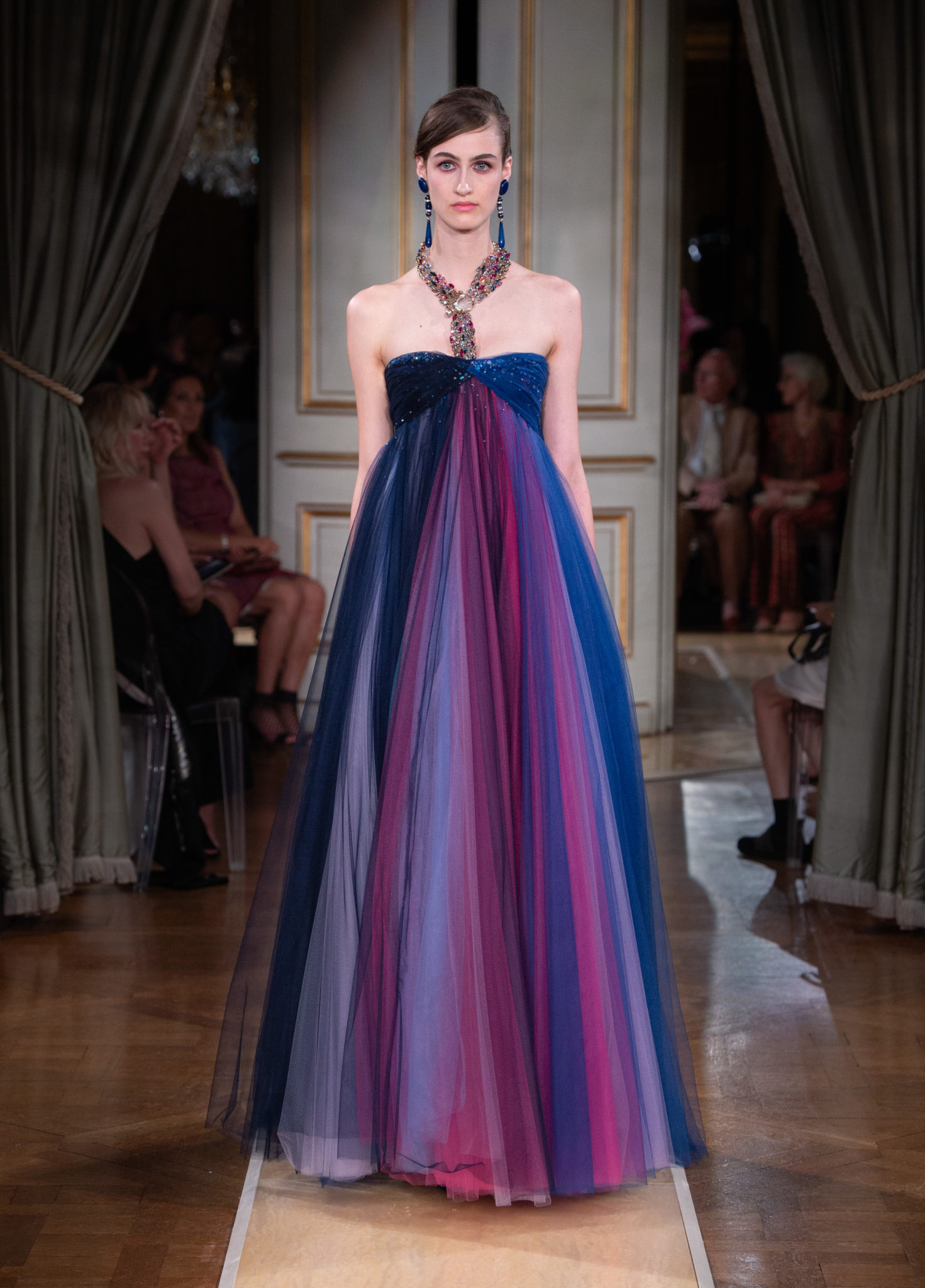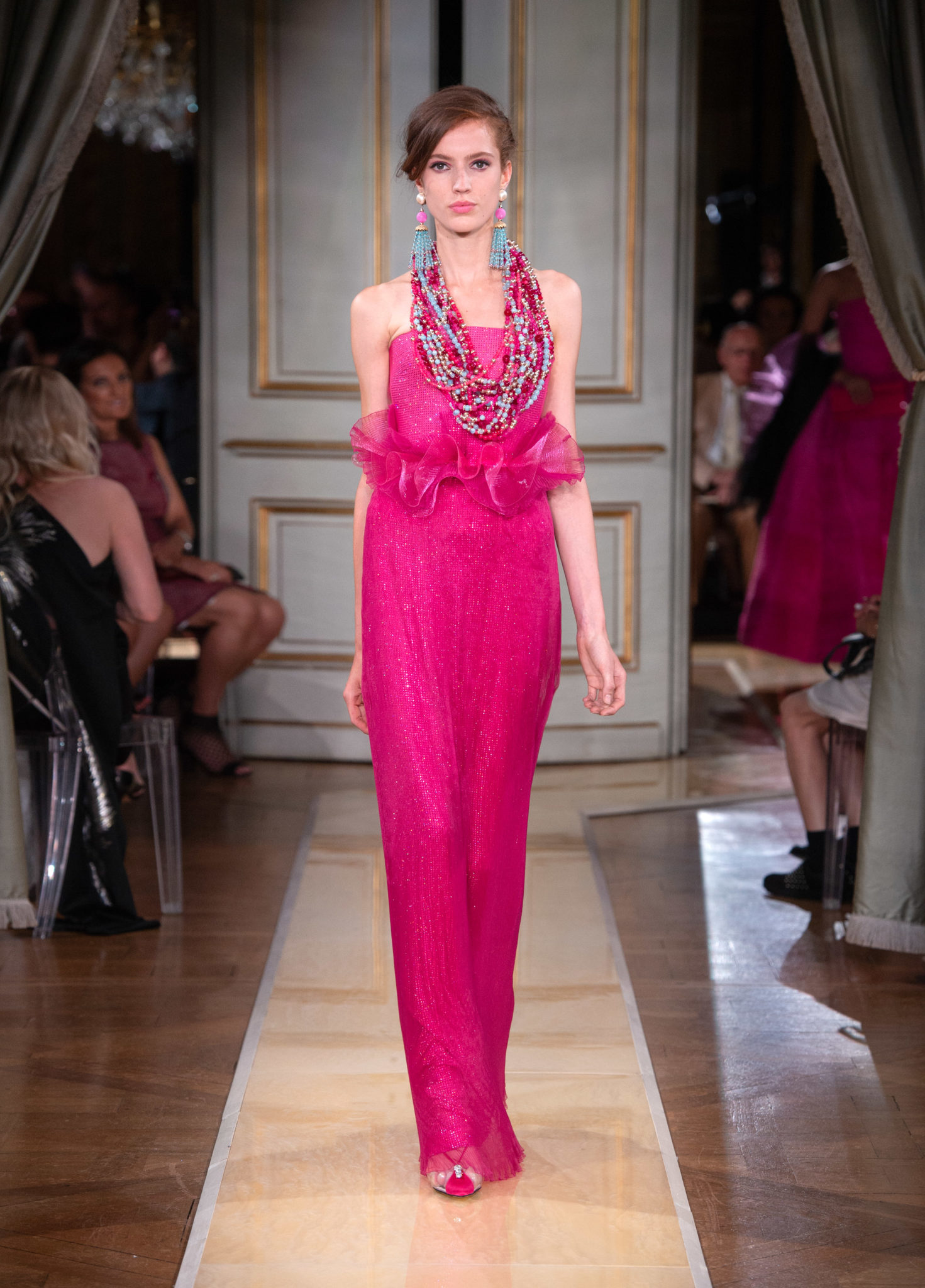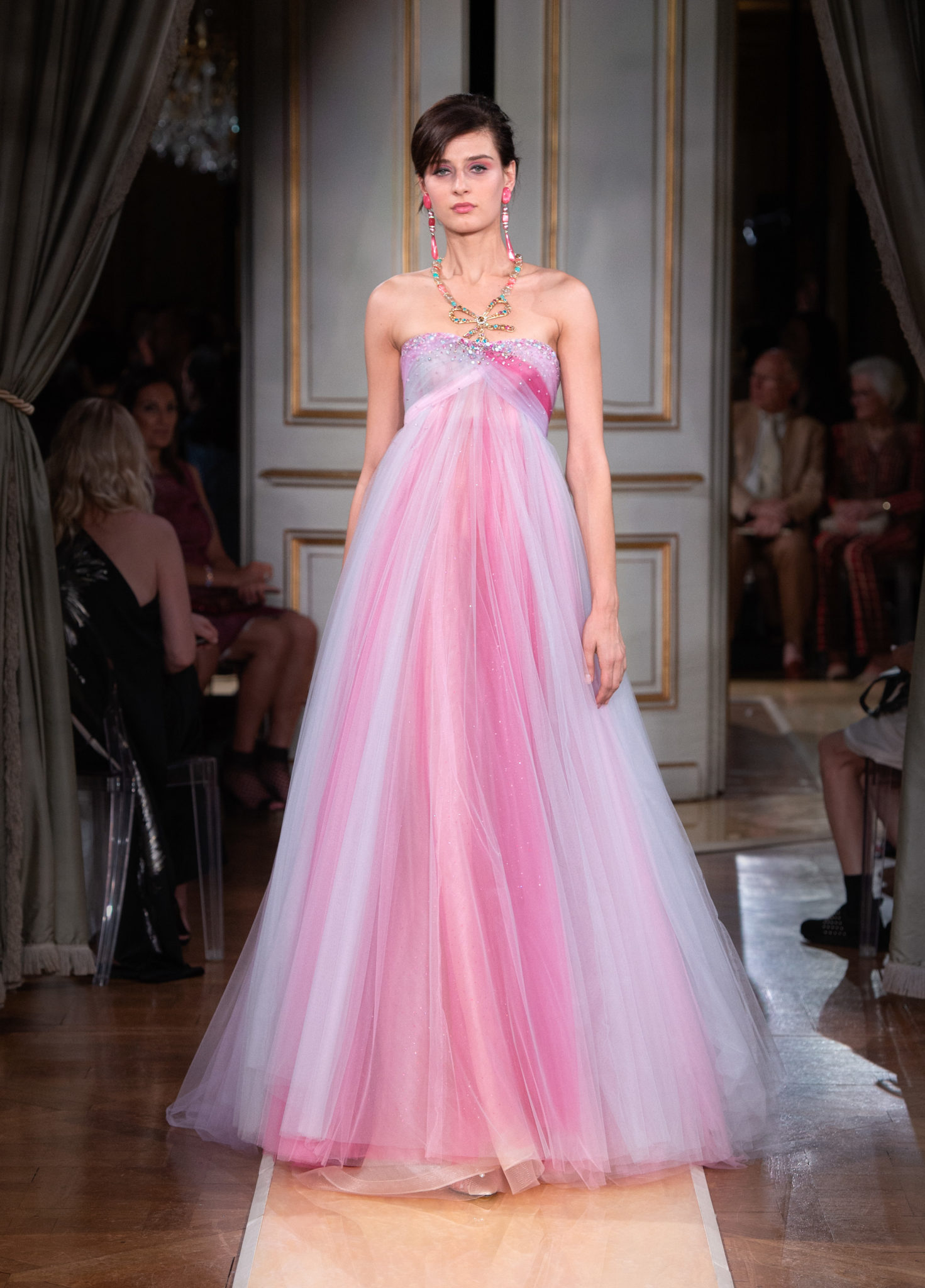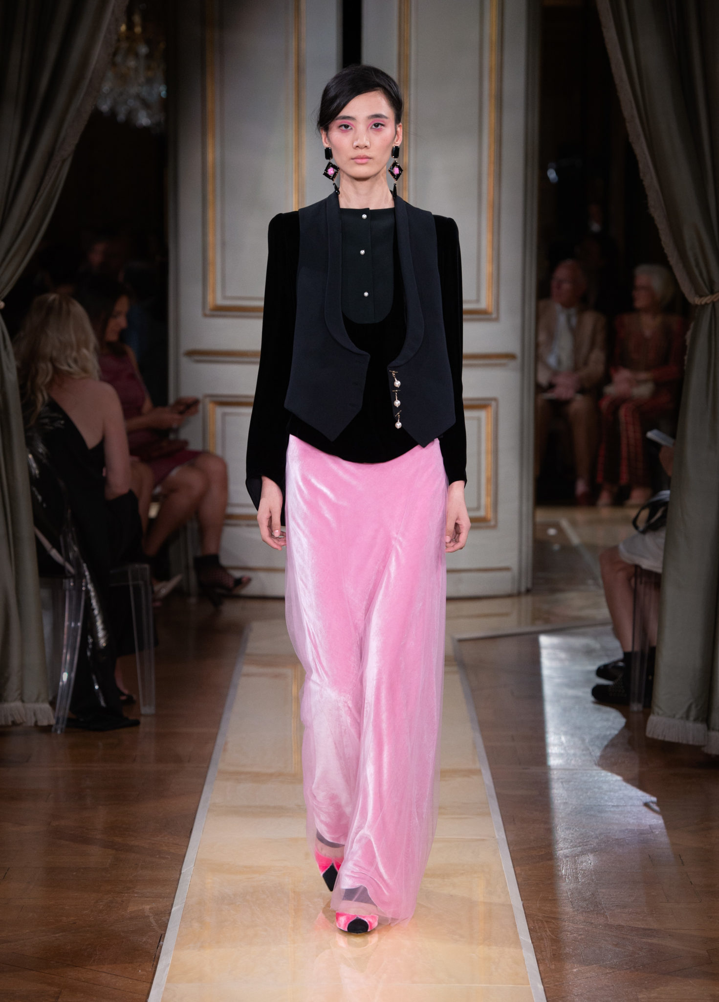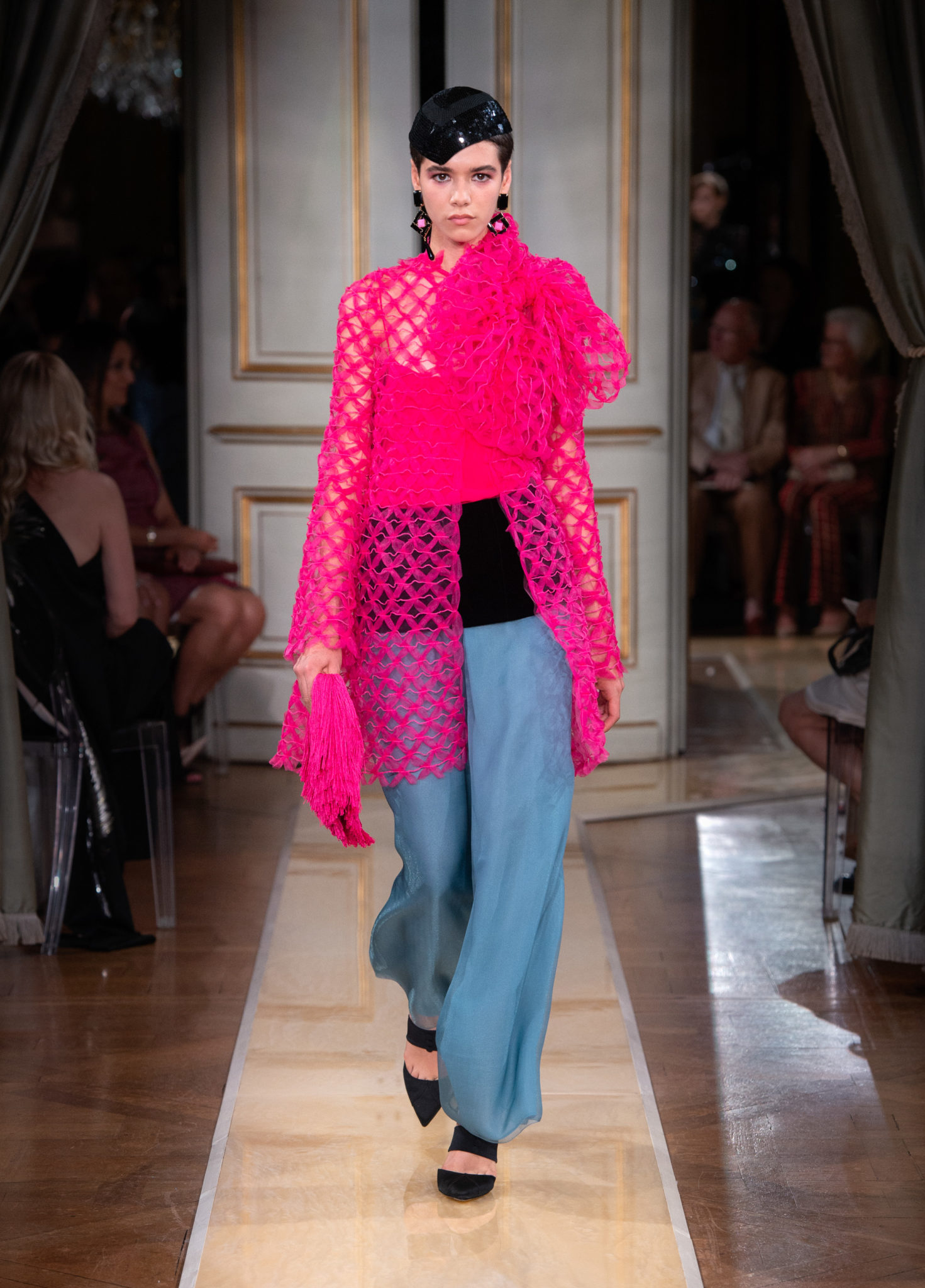 CHEF-D’ŒUVRE À MI-CHEMIN ENTRE NATURE ET CULTURE, LA ROBE BUSTIER EN TULLE BRODÉ EST ASSOCIÉE À UNE AMPLE JUPE DE PLUMES. LA SÉQUENCE DES COULEURS EST UN RAVISSEMENT. ROSE DANS TOUTES SES NUANCES, DE LA DÉLICATE TEINTE CHAIR AU ROSE SHOCKING, VERT JADE, TURQUOISE INTENSE ET BLEU SAPHIR: L’ARC-EN-CIEL DES PIERRES PRÉCIEUSES. DES FILS BRILLANTS DE CRISTAUX ROSE, CIEL ET OR SE FAUFILENT ICI ET LÀ. FLUIDITÉ ET ÉQUILIBRE DÉFINISSENT LES VESTES DÉSTRUCTURÉES ET LES PANS DES MANTEAUX QUI ONDULENT SUR LE CORPS. DES TISSUS HABILEMENT ASSORTIS AU LUXUEUX CRÊPE CADY, DES COUPES FRANCHES, DES DÉTAILS DE PASSEMENTERIE, DE PRÉCIEUSES BRODERIES SUR LE TULLE RÉVÈLENT LE TRAVAIL RAFFINÉ DE L’ATELIER, LA MINUTIE, L’EXCELLENCE, ET LE SAVOIR-FAIRE DU DESIGNER. UN VENT DE LIBERTÉ ET D’INDÉPENDANCE, PROFONDÉMENT ARMANI, CARACTÉRISE LES ACCESSOIRES: DES MOCASSINS SPORTIFS, TRÈS ÉLÉGANTS ALTERNÉS DE CHAUSSURES À TALONS HAUTS. LES SACS EN FILET PRENNENT UNE FORME ALLONGÉE. LES BIJOUX SONT COUVERTS DE TULLE POUR FILTRER L’ÉCLAT DES PIERRES. LES PETITES TOQUES LÉGÈREMENT OVALES AJOUTENT UNE POINTE D’ÉLÉGANCE À L’ENSEMBLE. LES ÉTOLES ET LES ÉCHARPES EN TULLE DOUBLÉ SCULPTENT LE CORPS ET SES GESTES.
