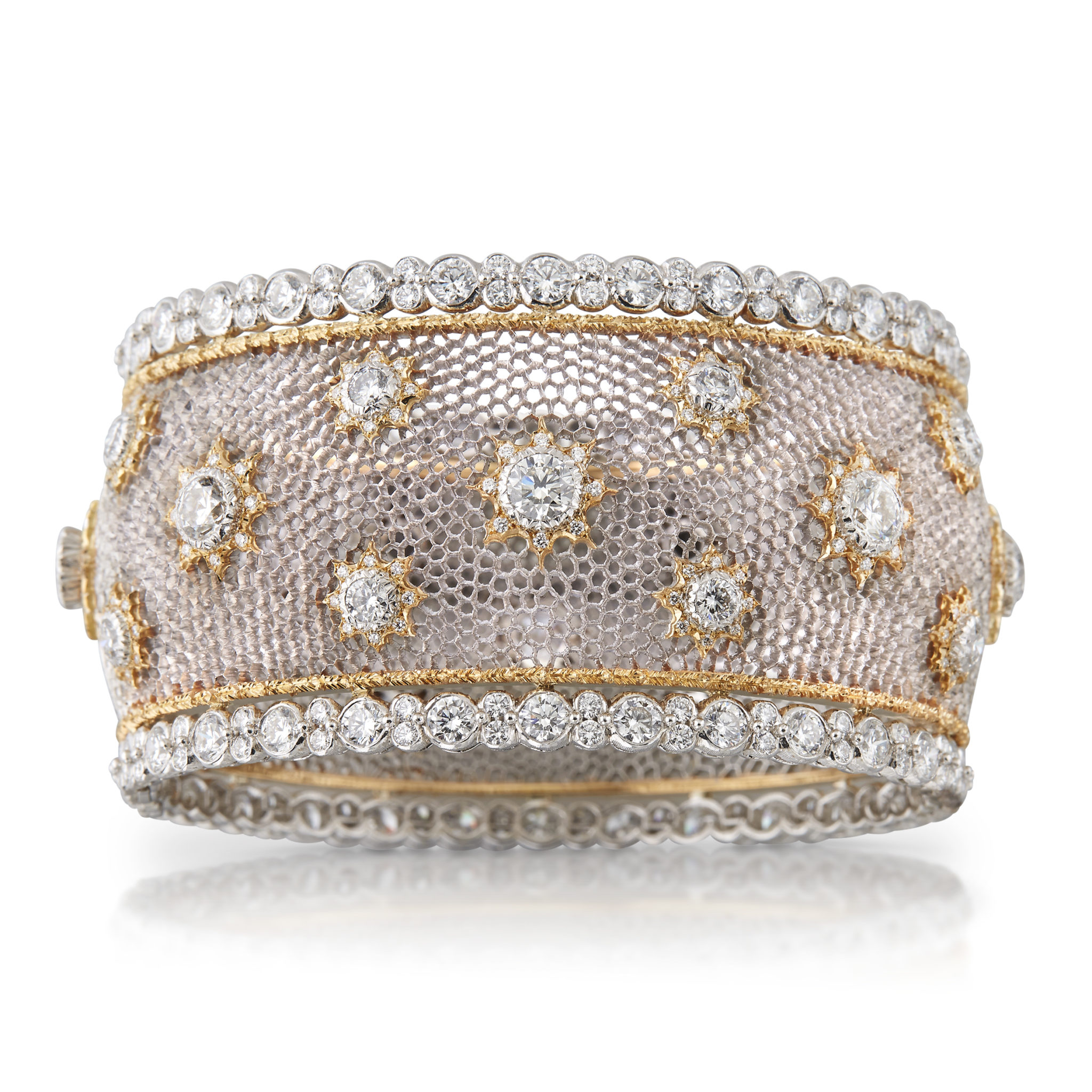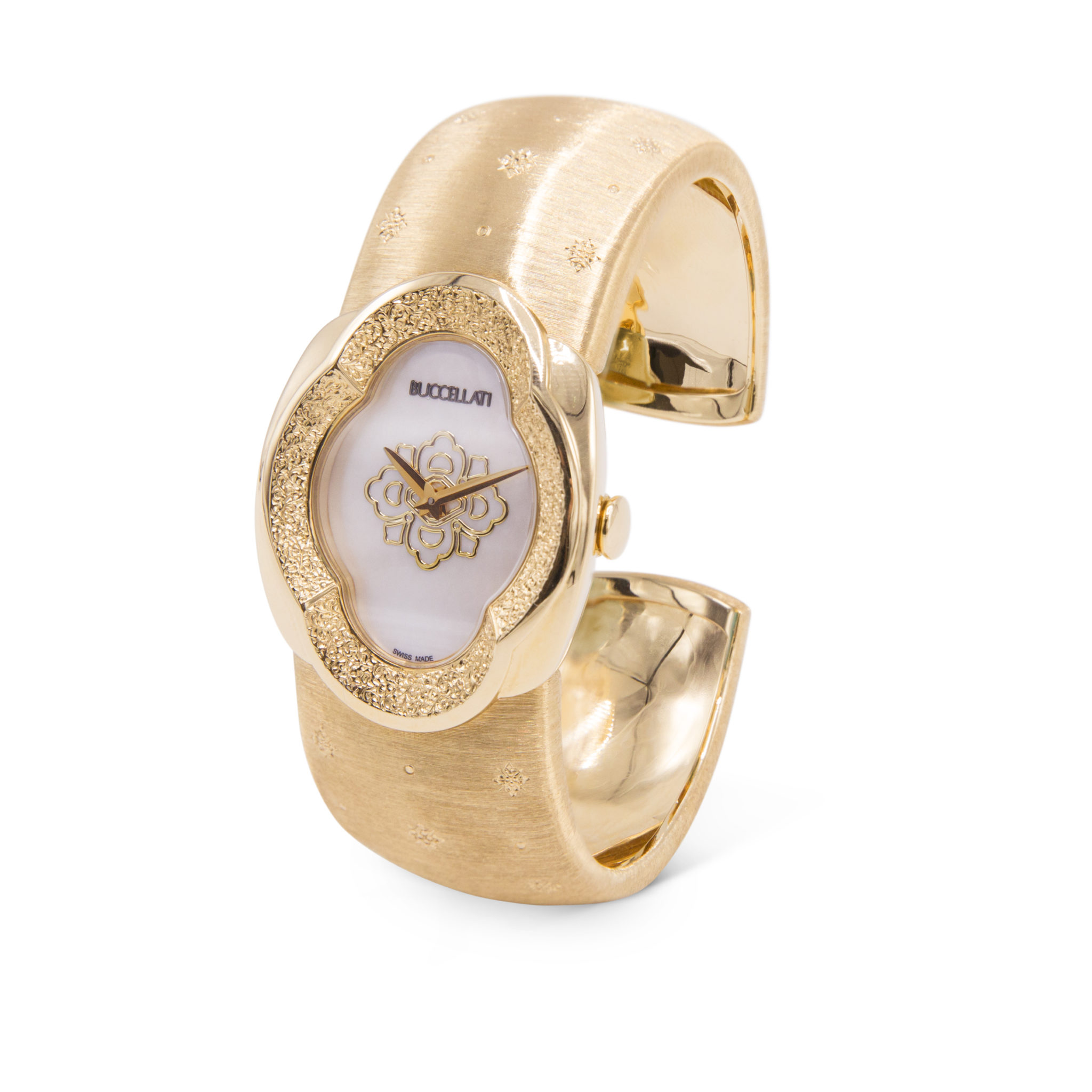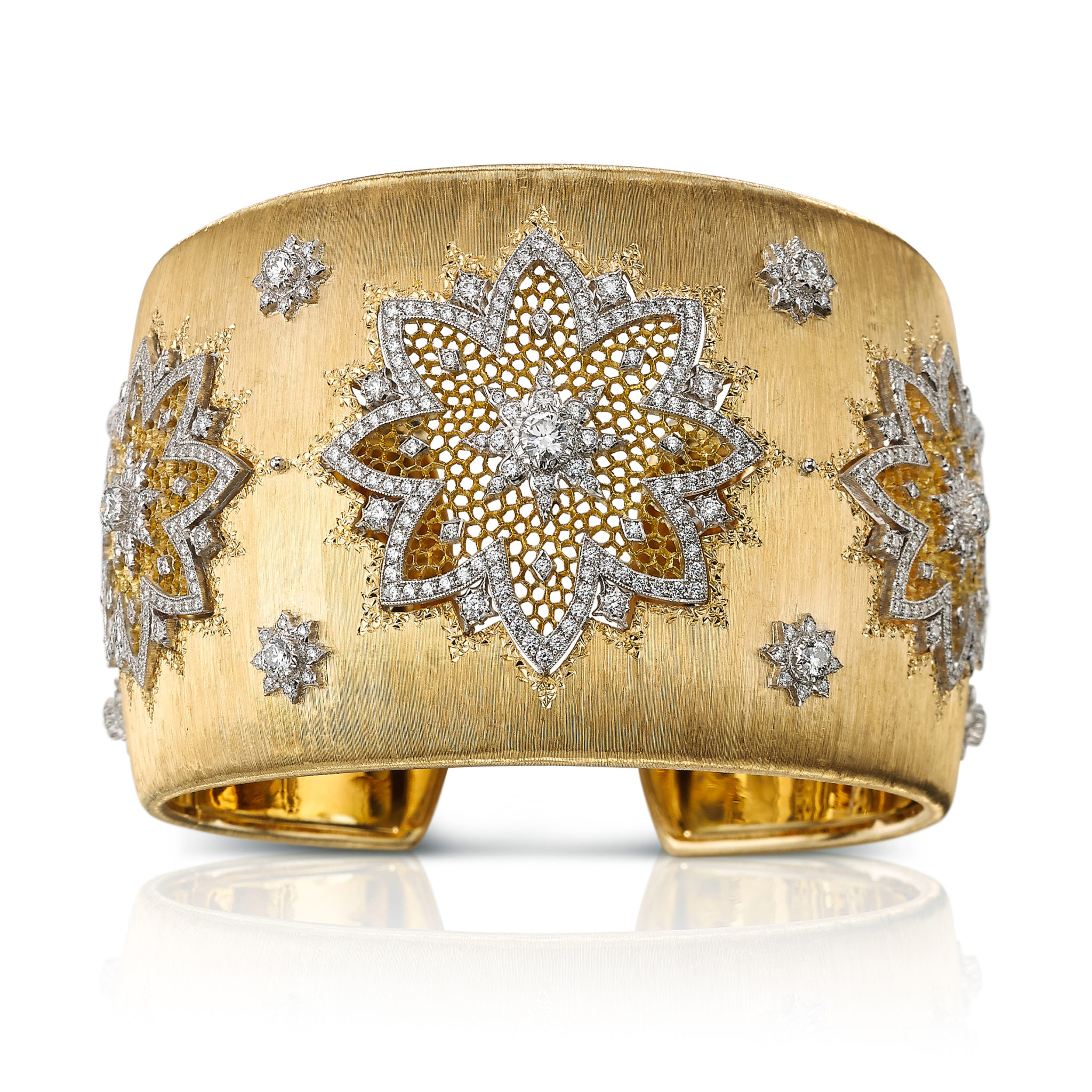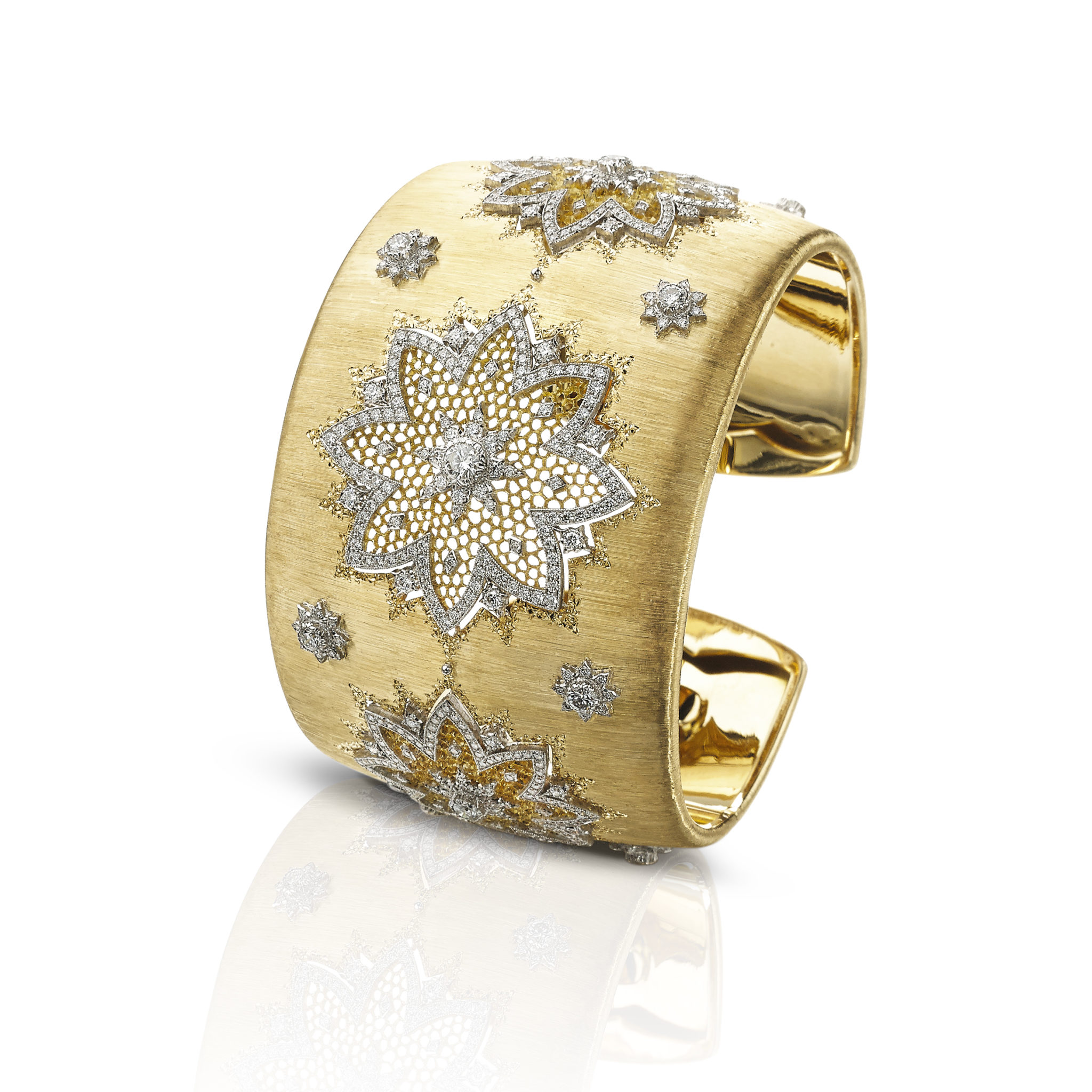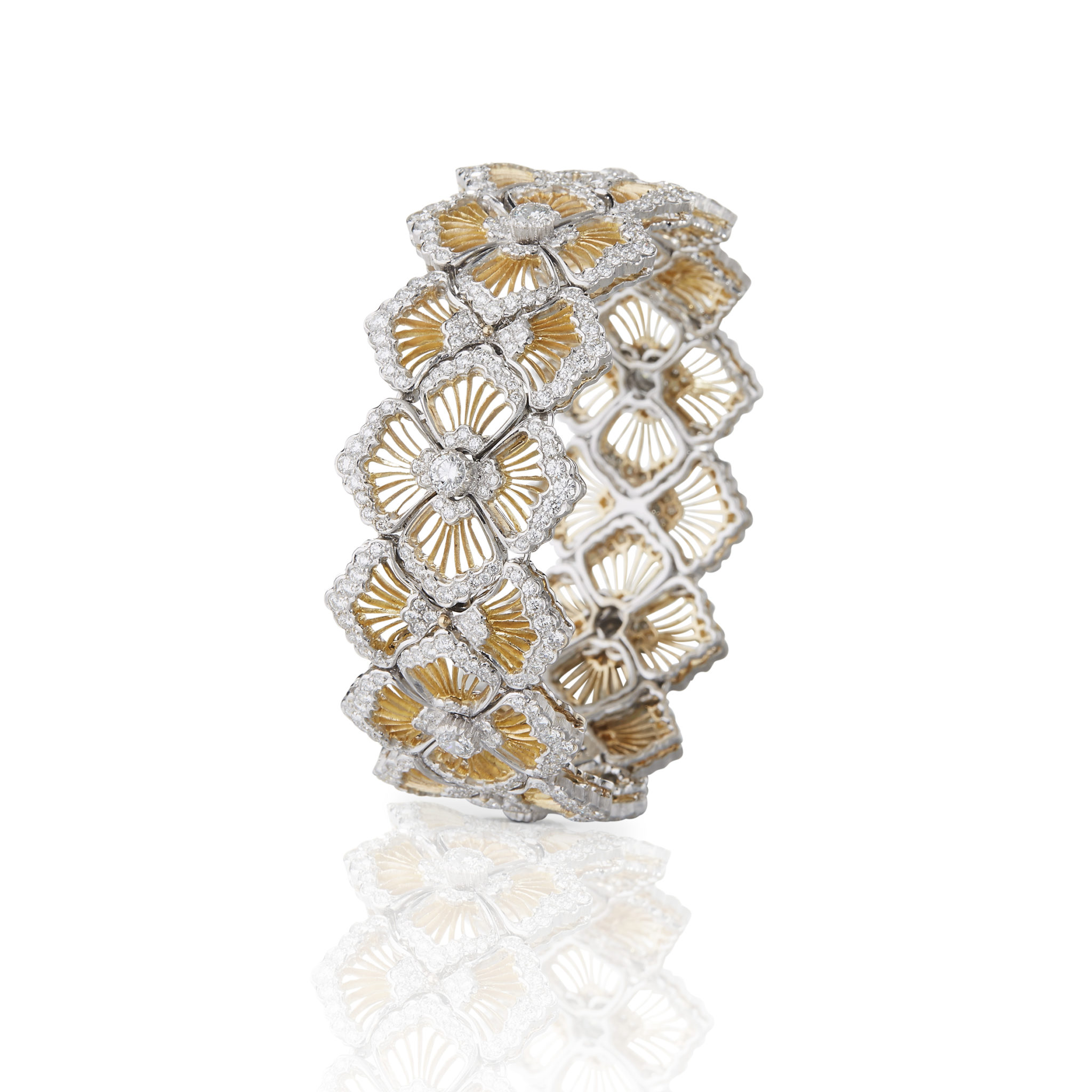 La prouesse artisanale que représentent les bijoux Buccellati évoque la plus délicate des dentelles. Le créateur trouve son inspiration dans les précieuses dentelles de Venise, de Bruges et de Valenciennes. Les artisans, fidèles aux esquisses d’Andrea Buccellati, percent à la main de fines feuilles d’or sur lesquelles le motif de dentelle est ensuite tracé. Puis, avec patience et grande dextérité, ils percent à nouveau et percent encore pour obtenir le plus petit et le plus délicat des motifs. Un ciseau d’orfèvre qui dérape, et tout est à recommencer. Un talent transmis de génération en génération, aujourd’hui encore parfaitement maîtrisé par les artisans hautement compétents de la Maison, héritiers des techniques ancestrales et du savoir-faire de la Renaissance.
