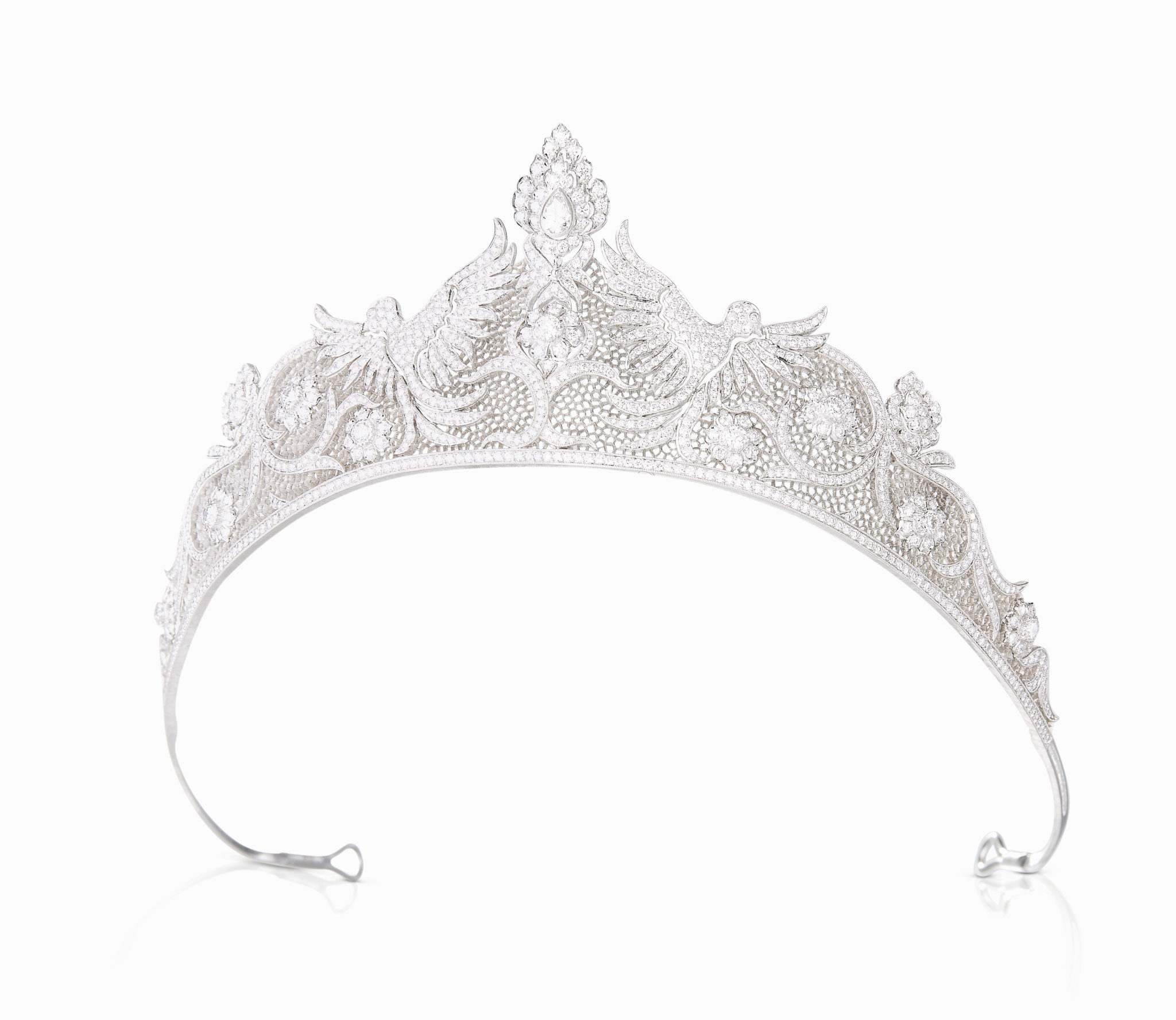 Après le succès de la tiare « Carlotta », la saison dernière, Buccellati présente sa nouvelle tiare « Phoenix », ornée de subtils motifs de fleurs et d’oiseaux en dentelle d’or blanc et diamants.