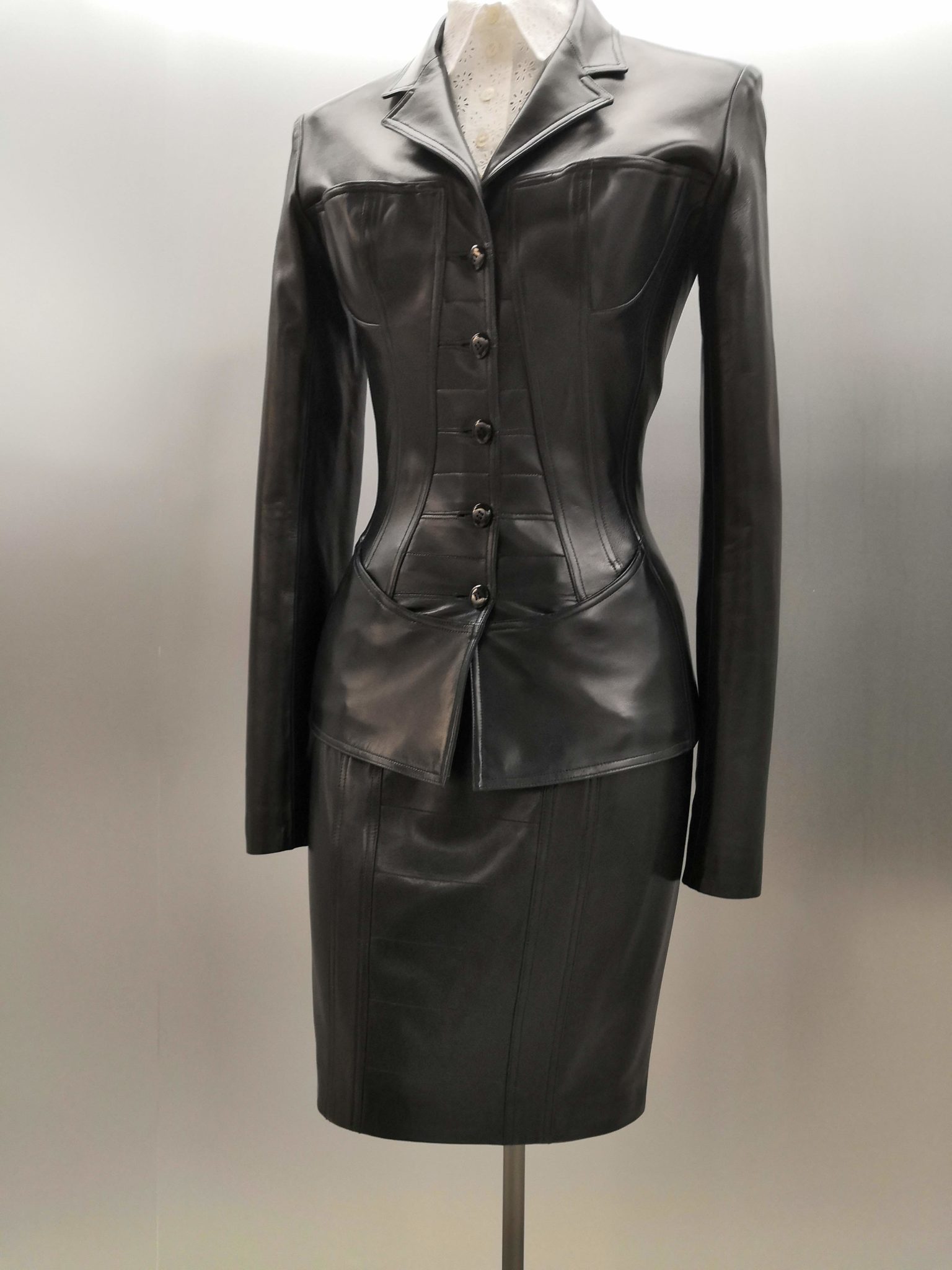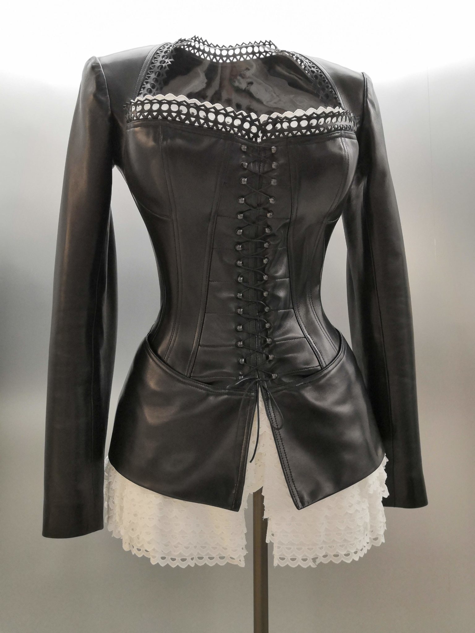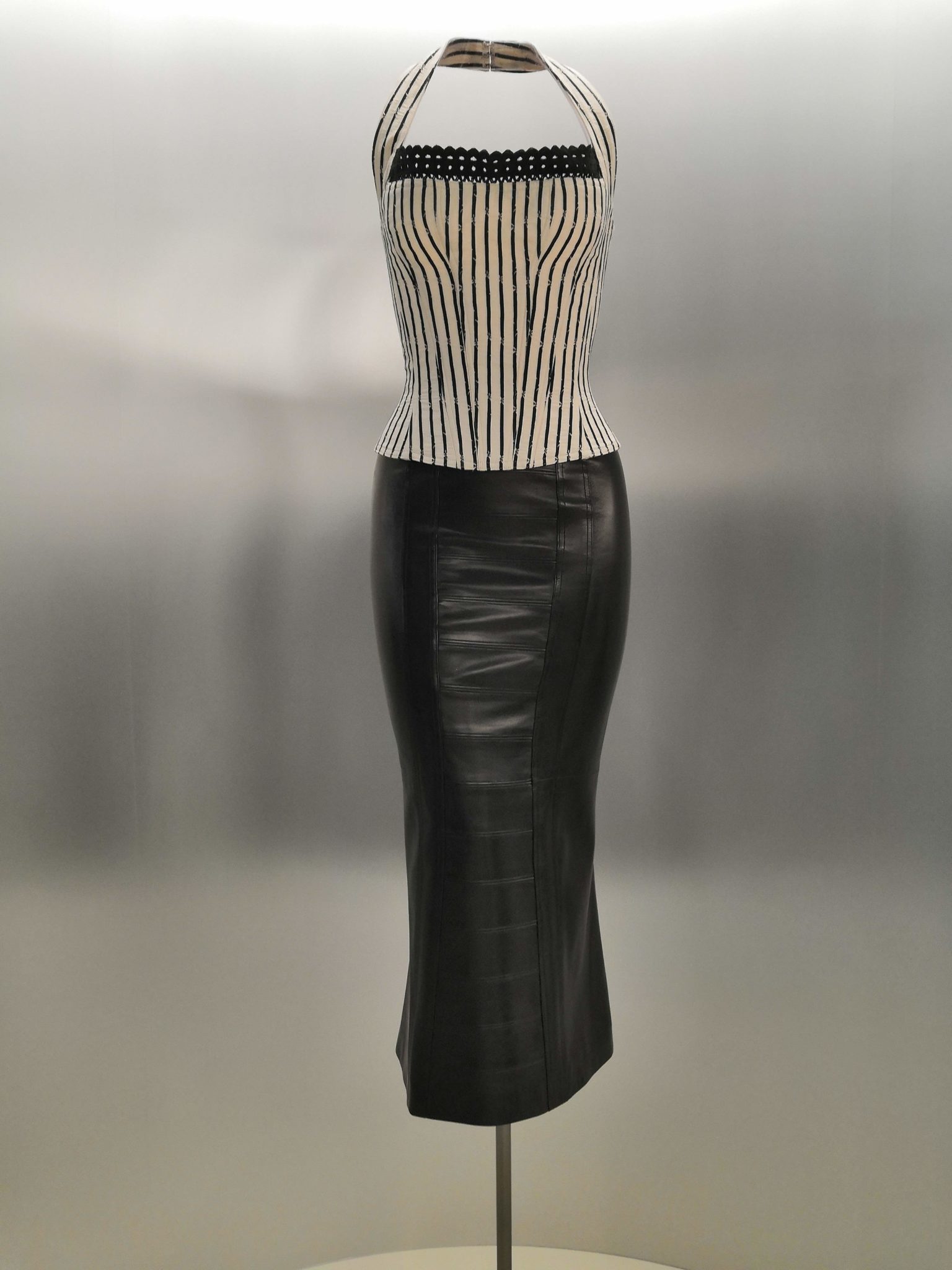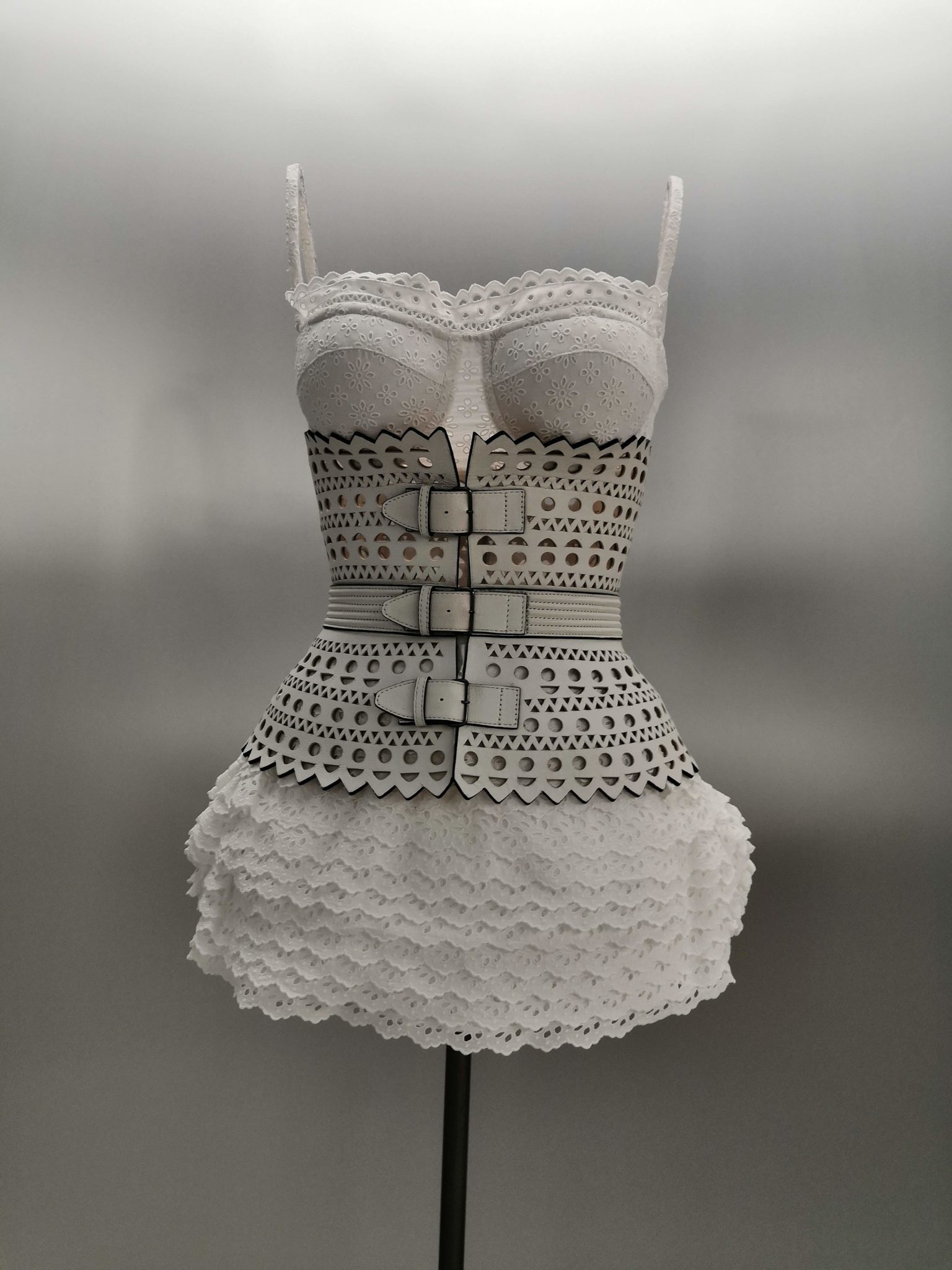 En 1991 Azzedine Alaïa s’installe avec Christoph von Weyhe au 18 rue de la Verrerie. L’année suivante, la collection printemps-été 1992 est la première qu’il conçoit dans ses nouveaux espaces. Elle est faite de références à la Marquise de Pompadour et à la cour de Versailles. Elle est aussi l’une des plus importantes que le couturier ait jamais créées. Le défilé ne compta pas moins de 115 passages. Sous des jupes longues et étroites, les broderies anglaises bordent les ourlets, soulignent les revers d’une veste et les coupes rigoureuses, elles ourlent les jupes courtes et les balconnets pigeonnants. Mais c’est avec le cuir qu’il donne l’interprétation la plus étonnante de sa vision de la grande mode du XVIIIe siècle. Perforée, dentelée, la matière brute devient dentelle et forme des bustiers, des ceintures et des corsets qui soulignent les tailles. Sur des robes en maille, il pose des motifs d’entrelacs là où s’arrête le regard, ou des rubans en trompe-l’œil ornés d’un “mon cœur est à papa”, un tatouage doux pour des robes aux décolletés audacieux.