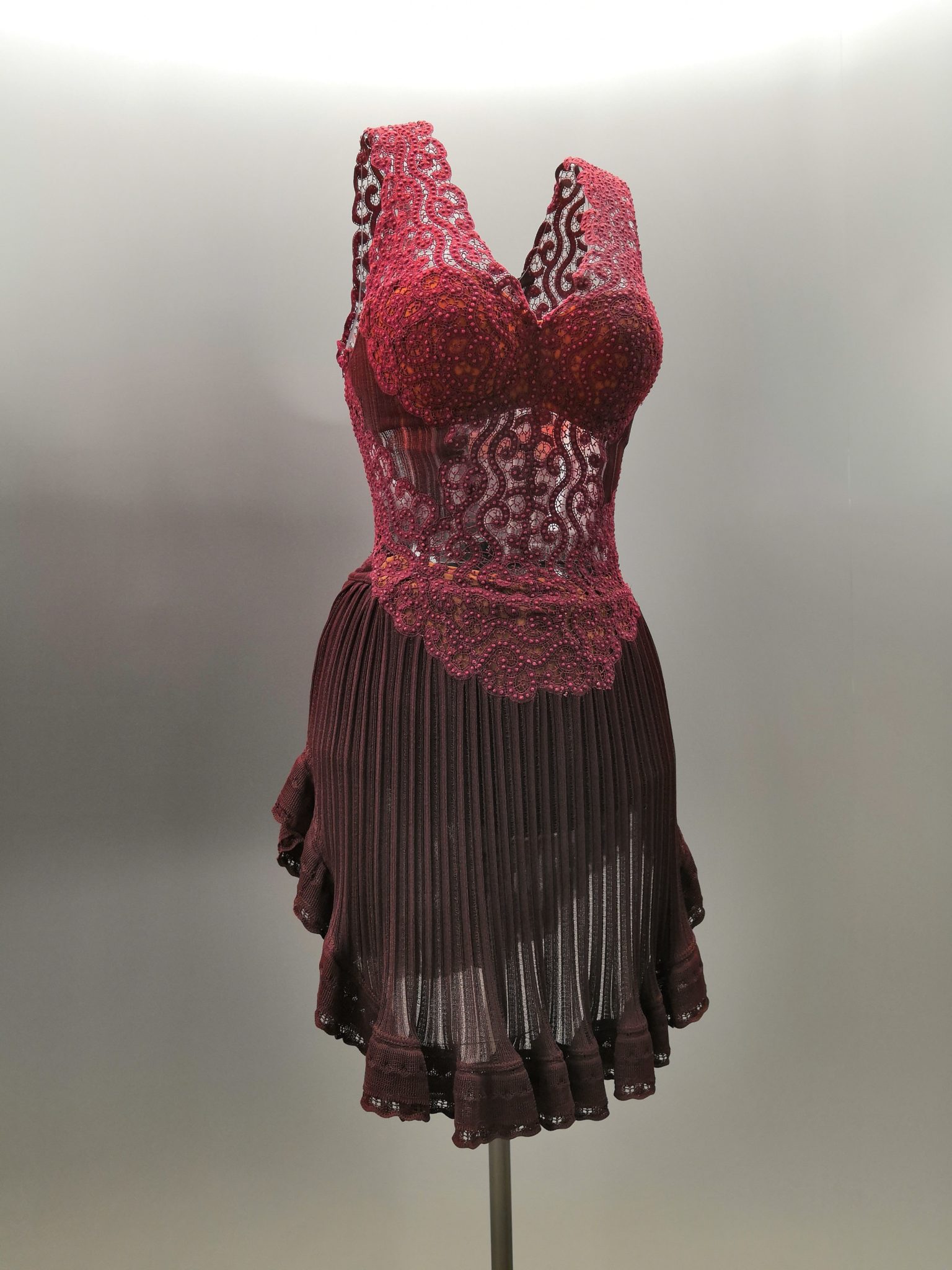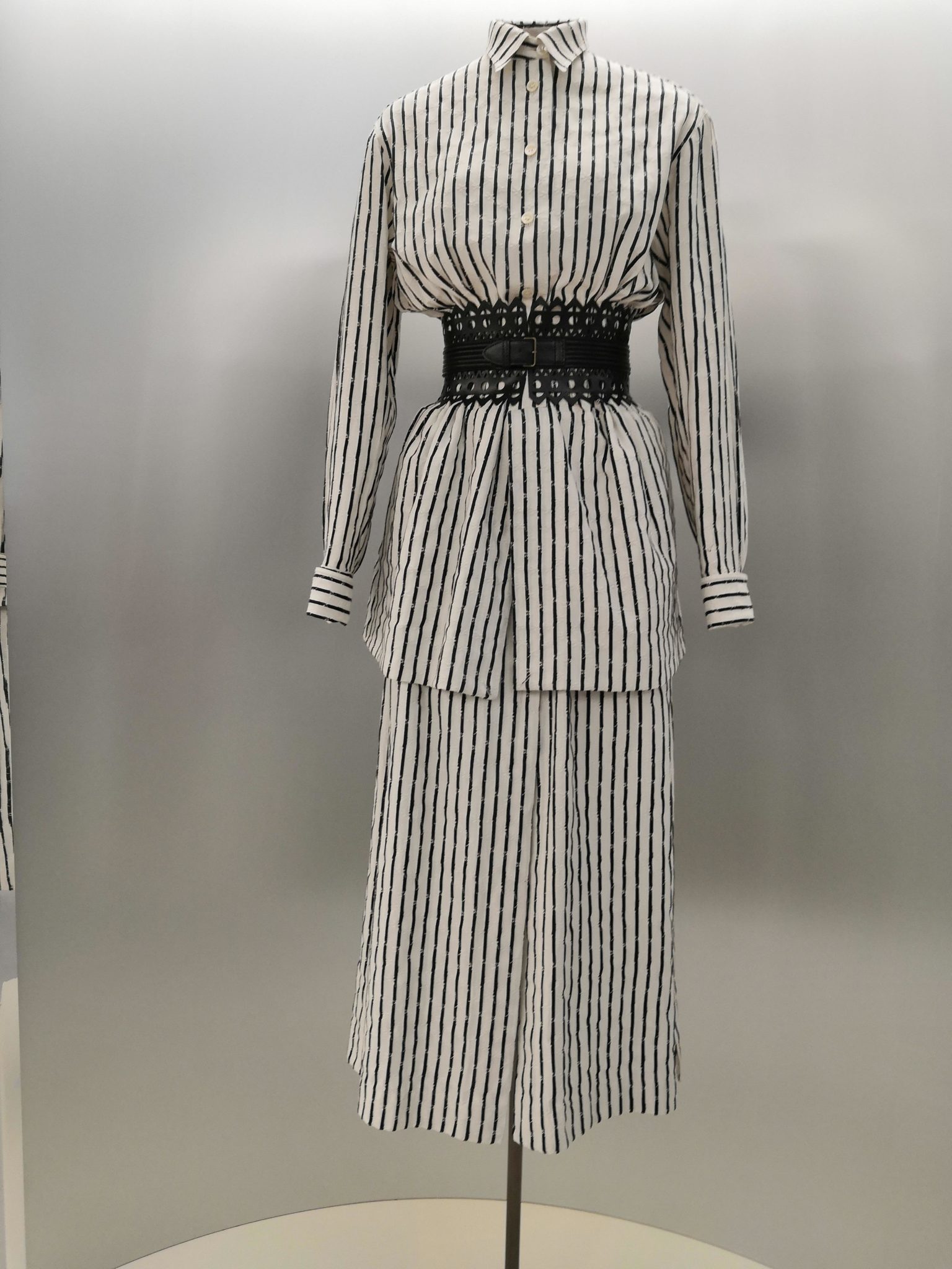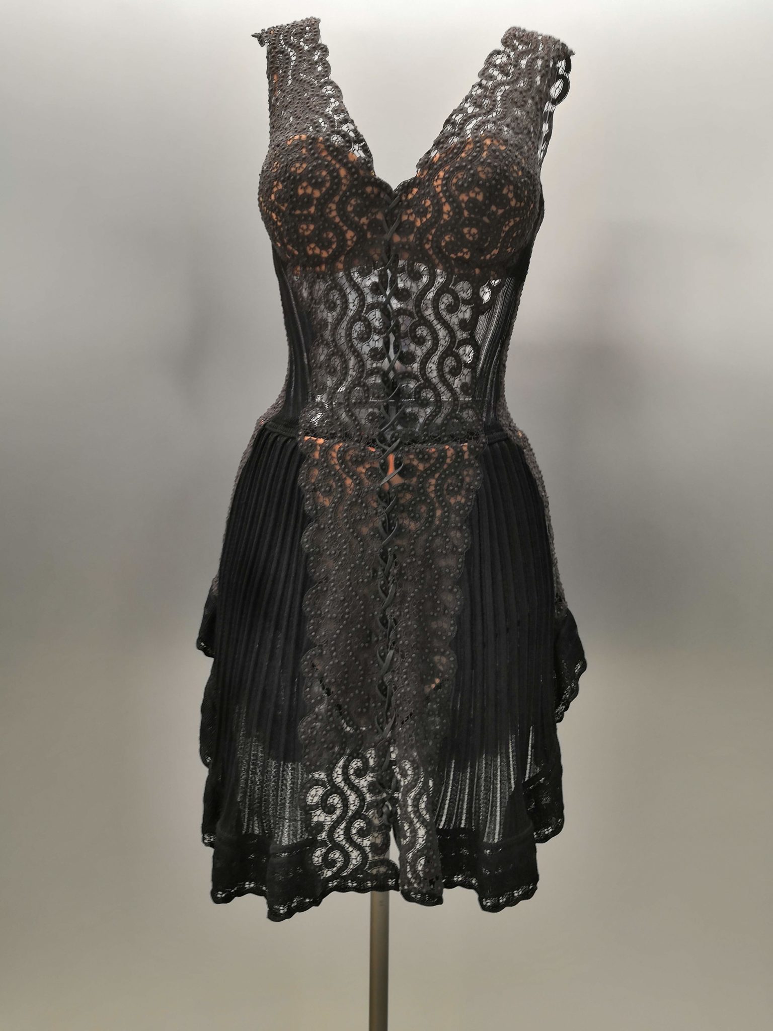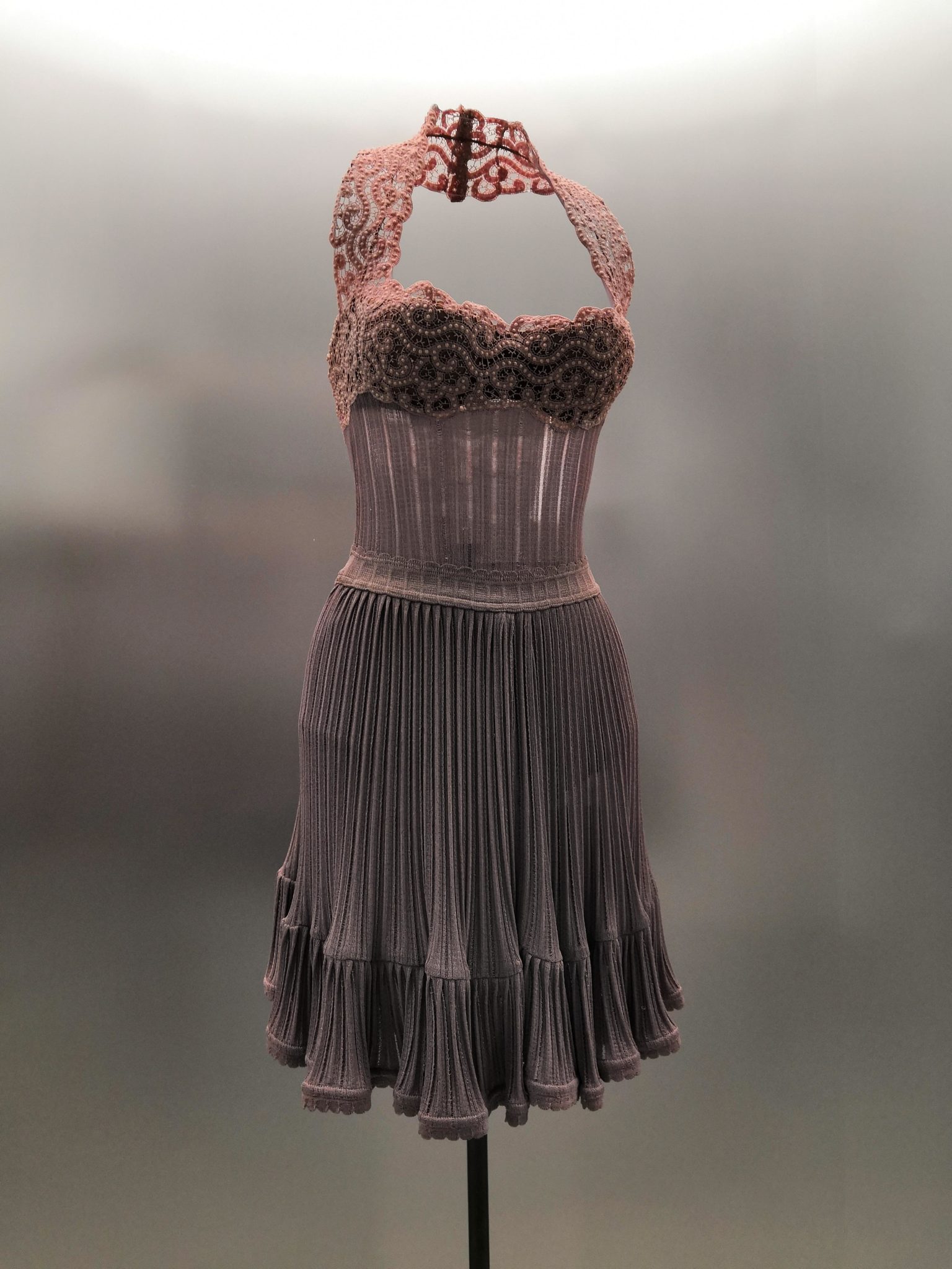 En 1991 Azzedine Alaïa s’installe avec Christoph von Weyhe au 18 rue de la Verrerie. L’année suivante, la collection printemps-été 1992 est la première qu’il conçoit dans ses nouveaux espaces. Elle est faite de références à la Marquise de Pompadour et à la cour de Versailles. Elle est aussi l’une des plus importantes que le couturier ait jamais créées. Le défilé ne compta pas moins de 115 passages. Sous des jupes longues et étroites, les broderies anglaises bordent les ourlets, soulignent les revers d’une veste et les coupes rigoureuses, elles ourlent les jupes courtes et les balconnets pigeonnants. Mais c’est avec le cuir qu’il donne l’interprétation la plus étonnante de sa vision de la grande mode du XVIIIe siècle. Perforée, dentelée, la matière brute devient dentelle et forme des bustiers, des ceintures et des corsets qui soulignent les tailles. Sur des robes en maille, il pose des motifs d’entrelacs là où s’arrête le regard, ou des rubans en trompe-l’œil ornés d’un “mon cœur est à papa”, un tatouage doux pour des robes aux décolletés audacieux.
