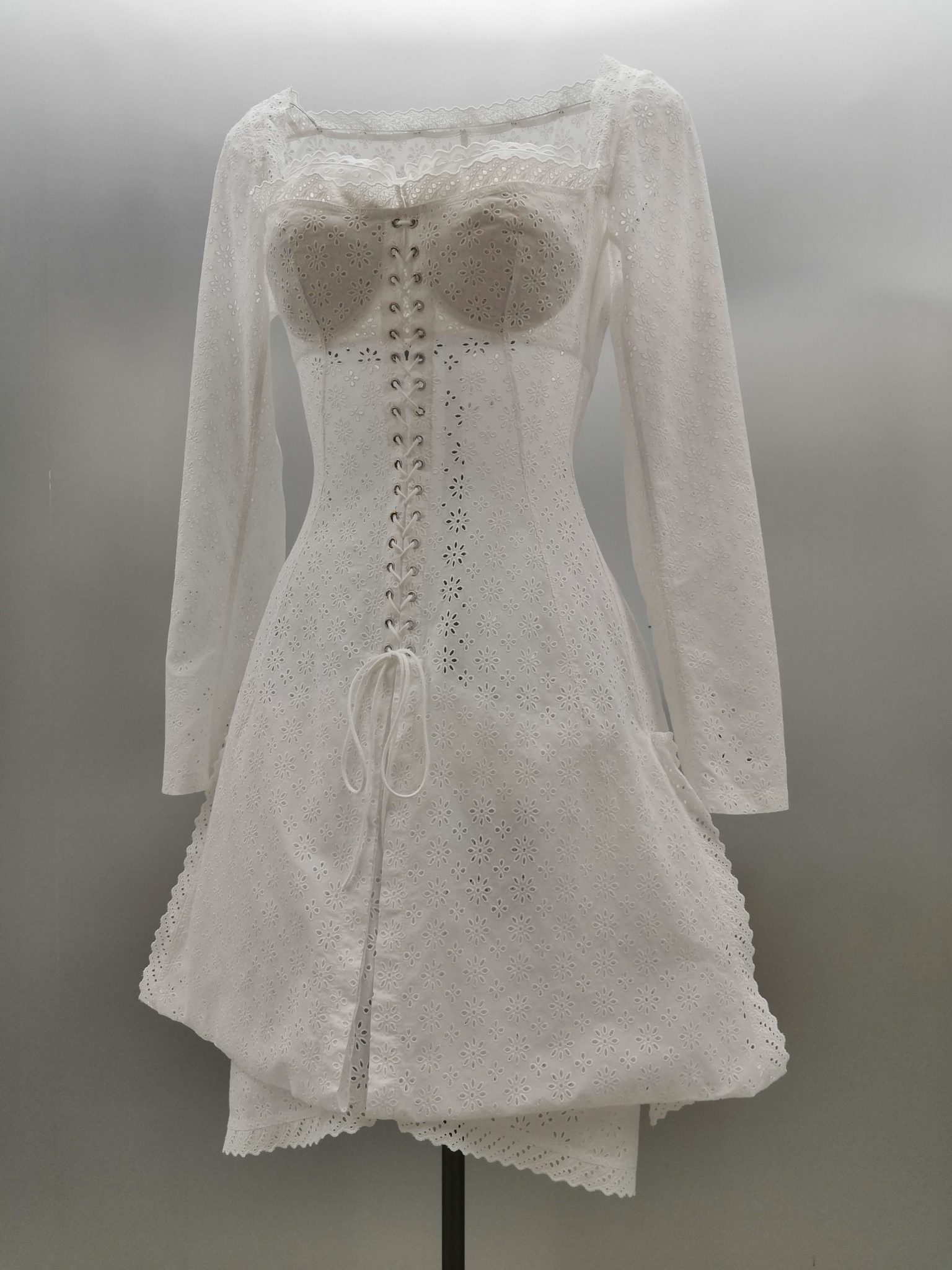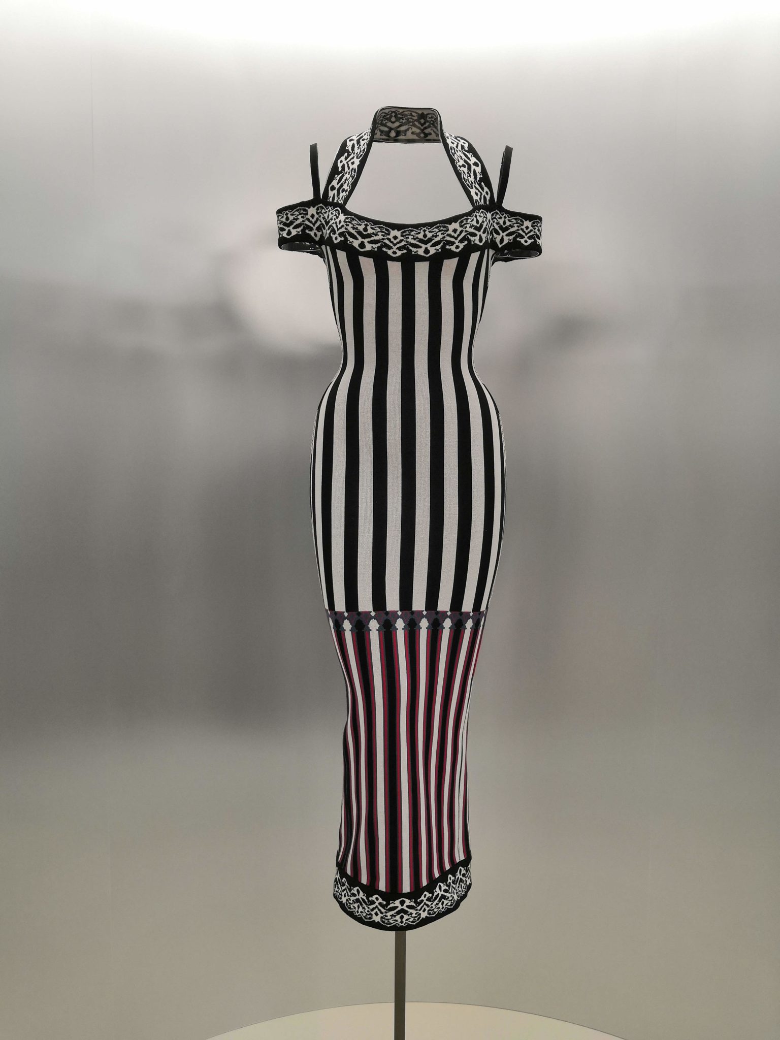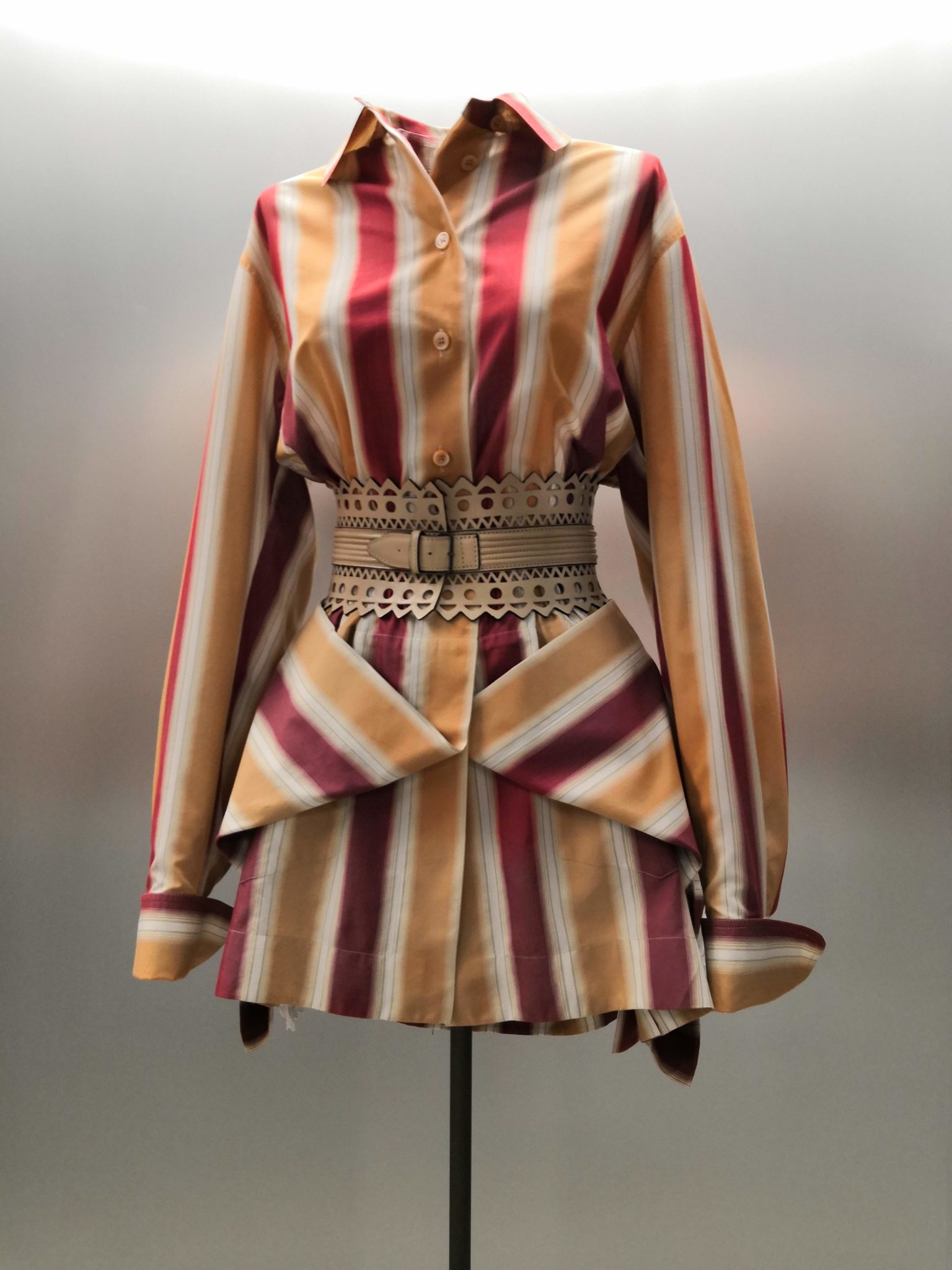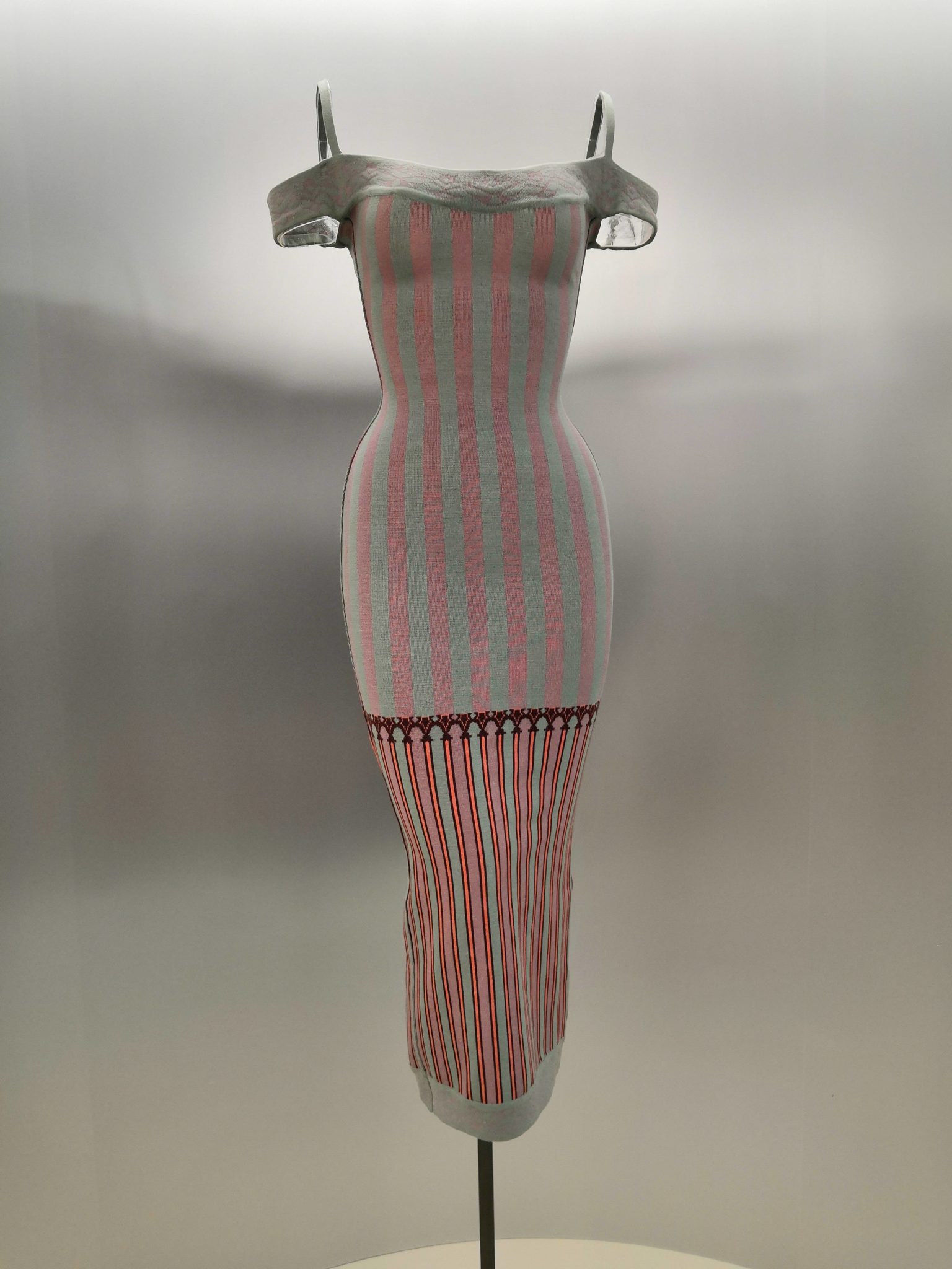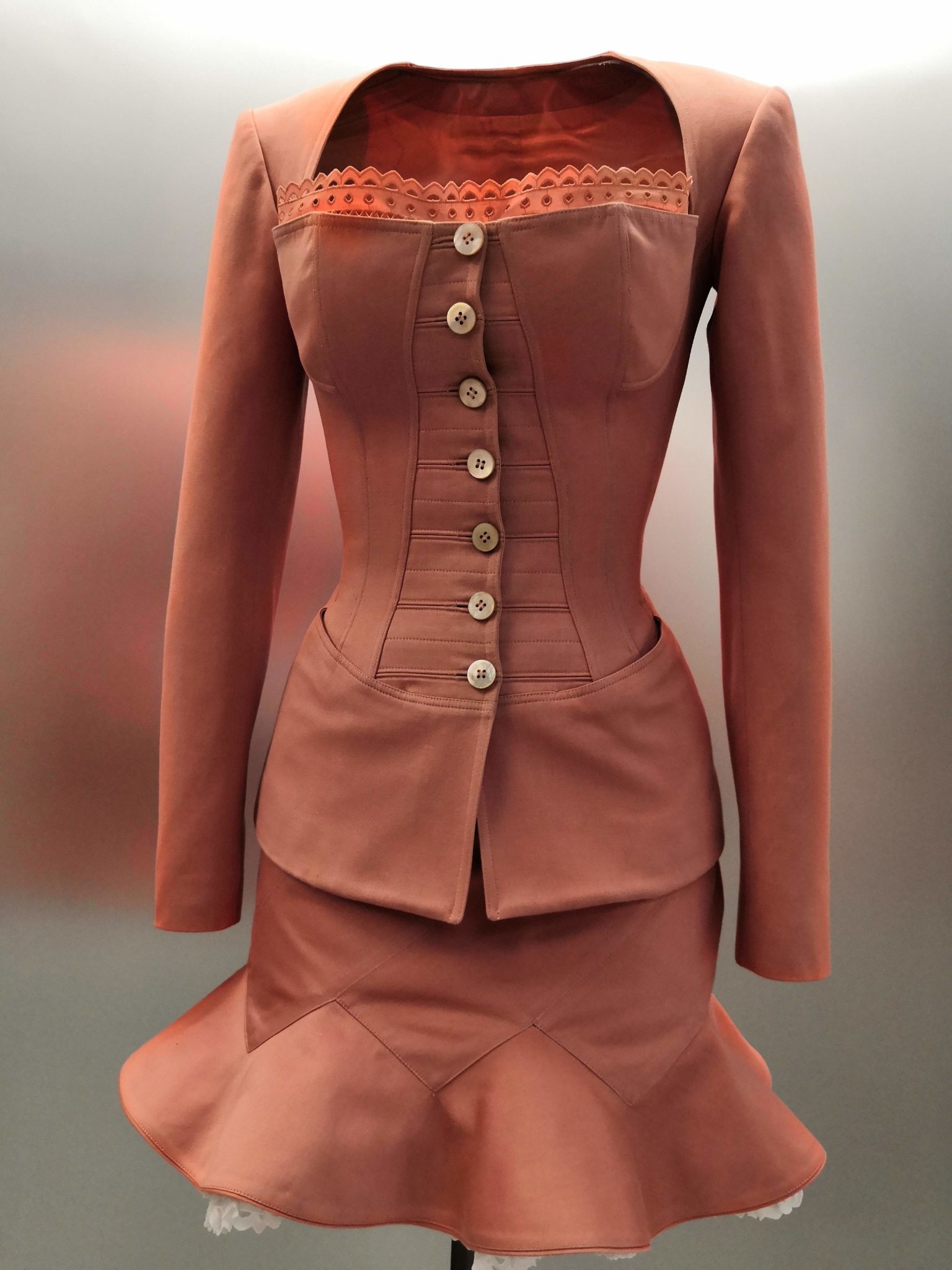 En 1991 Azzedine Alaïa s’installe avec Christoph von Weyhe au 18 rue de la Verrerie. L’année suivante, la collection printemps-été 1992 est la première qu’il conçoit dans ses nouveaux espaces. Elle est faite de références à la Marquise de Pompadour et à la cour de Versailles. Elle est aussi l’une des plus importantes que le couturier ait jamais créées. Le défilé ne compta pas moins de 115 passages. Sous des jupes longues et étroites, les broderies anglaises bordent les ourlets, soulignent les revers d’une veste et les coupes rigoureuses, elles ourlent les jupes courtes et les balconnets pigeonnants. Mais c’est avec le cuir qu’il donne l’interprétation la plus étonnante de sa vision de la grande mode du XVIIIe siècle. Perforée, dentelée, la matière brute devient dentelle et forme des bustiers, des ceintures et des corsets qui soulignent les tailles. Sur des robes en maille, il pose des motifs d’entrelacs là où s’arrête le regard, ou des rubans en trompe-l’œil ornés d’un “mon cœur est à papa”, un tatouage doux pour des robes aux décolletés audacieux.