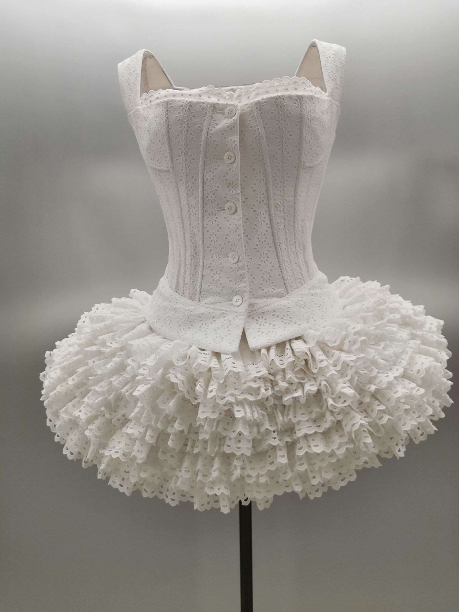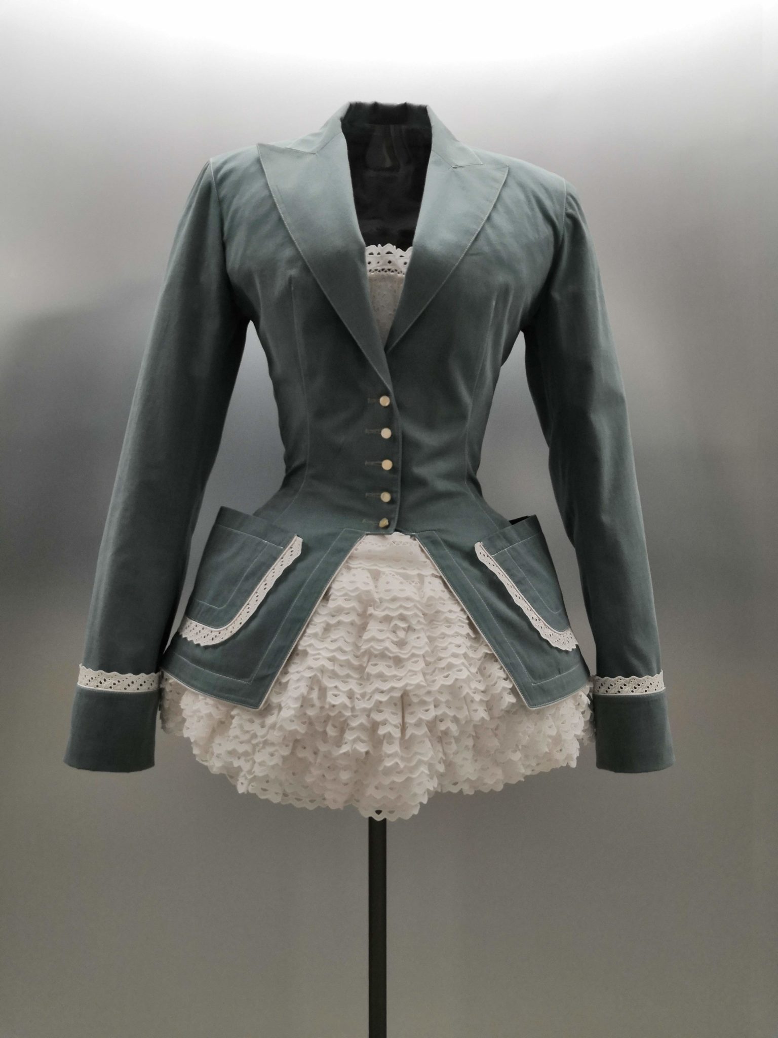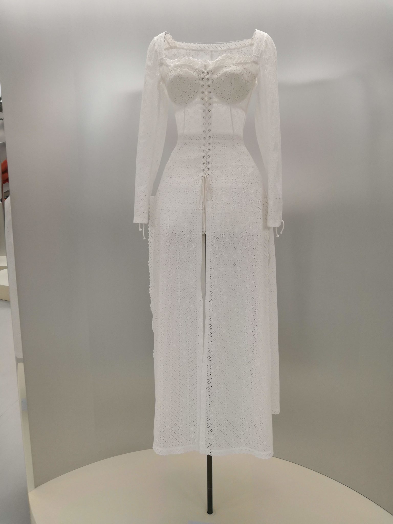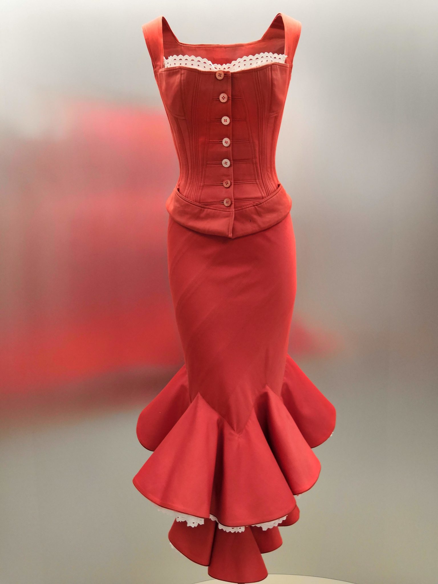 En 1991 Azzedine Alaïa s’installe avec Christoph von Weyhe au 18 rue de la Verrerie. L’année suivante, la collection printemps-été 1992 est la première qu’il conçoit dans ses nouveaux espaces. Elle est faite de références à la Marquise de Pompadour et à la cour de Versailles. Elle est aussi l’une des plus importantes que le couturier ait jamais créées. Le défilé ne compta pas moins de 115 passages. Sous des jupes longues et étroites, les broderies anglaises bordent les ourlets, soulignent les revers d’une veste et les coupes rigoureuses, elles ourlent les jupes courtes et les balconnets pigeonnants. Mais c’est avec le cuir qu’il donne l’interprétation la plus étonnante de sa vision de la grande mode du XVIIIe siècle. Perforée, dentelée, la matière brute devient dentelle et forme des bustiers, des ceintures et des corsets qui soulignent les tailles. Sur des robes en maille, il pose des motifs d’entrelacs là où s’arrête le regard, ou des rubans en trompe-l’œil ornés d’un “mon cœur est à papa”, un tatouage doux pour des robes aux décolletés audacieux.