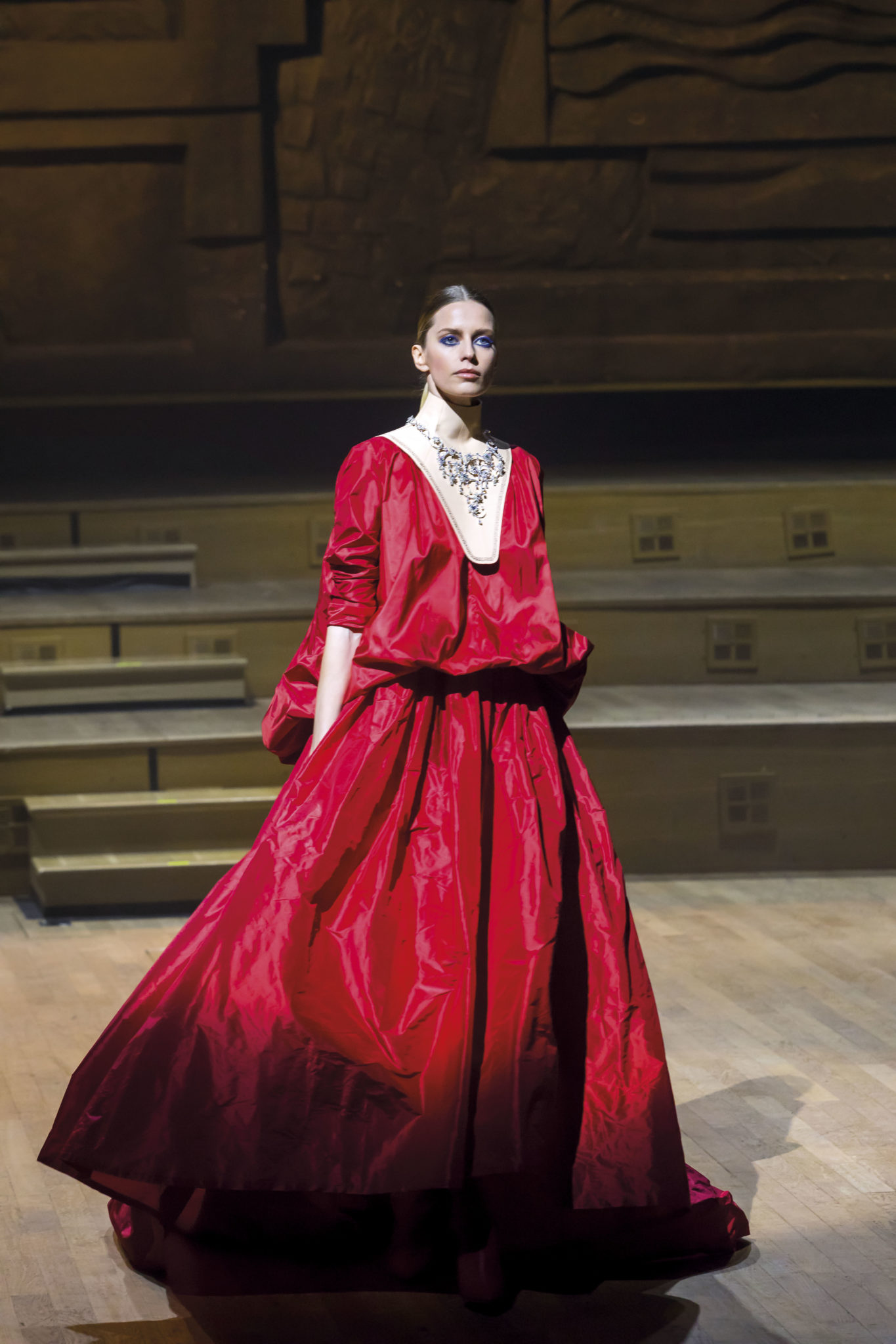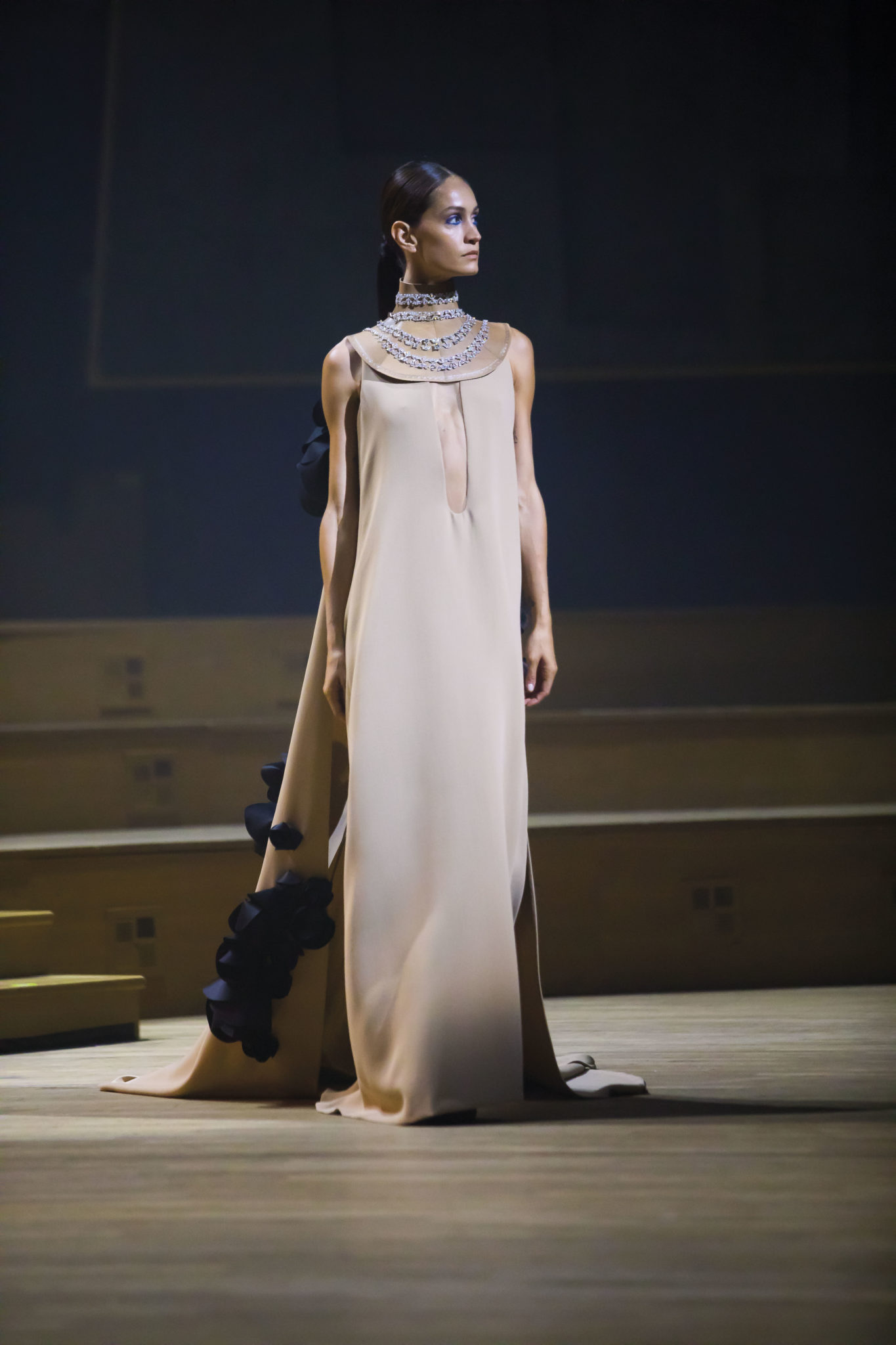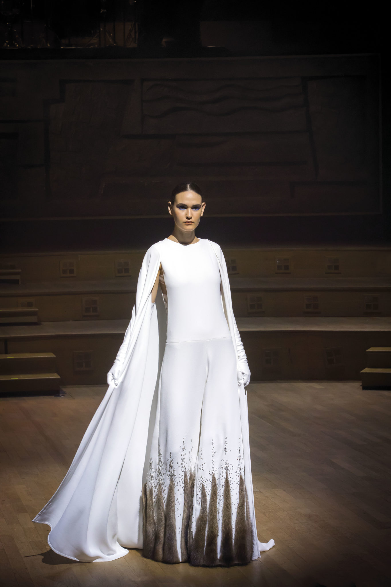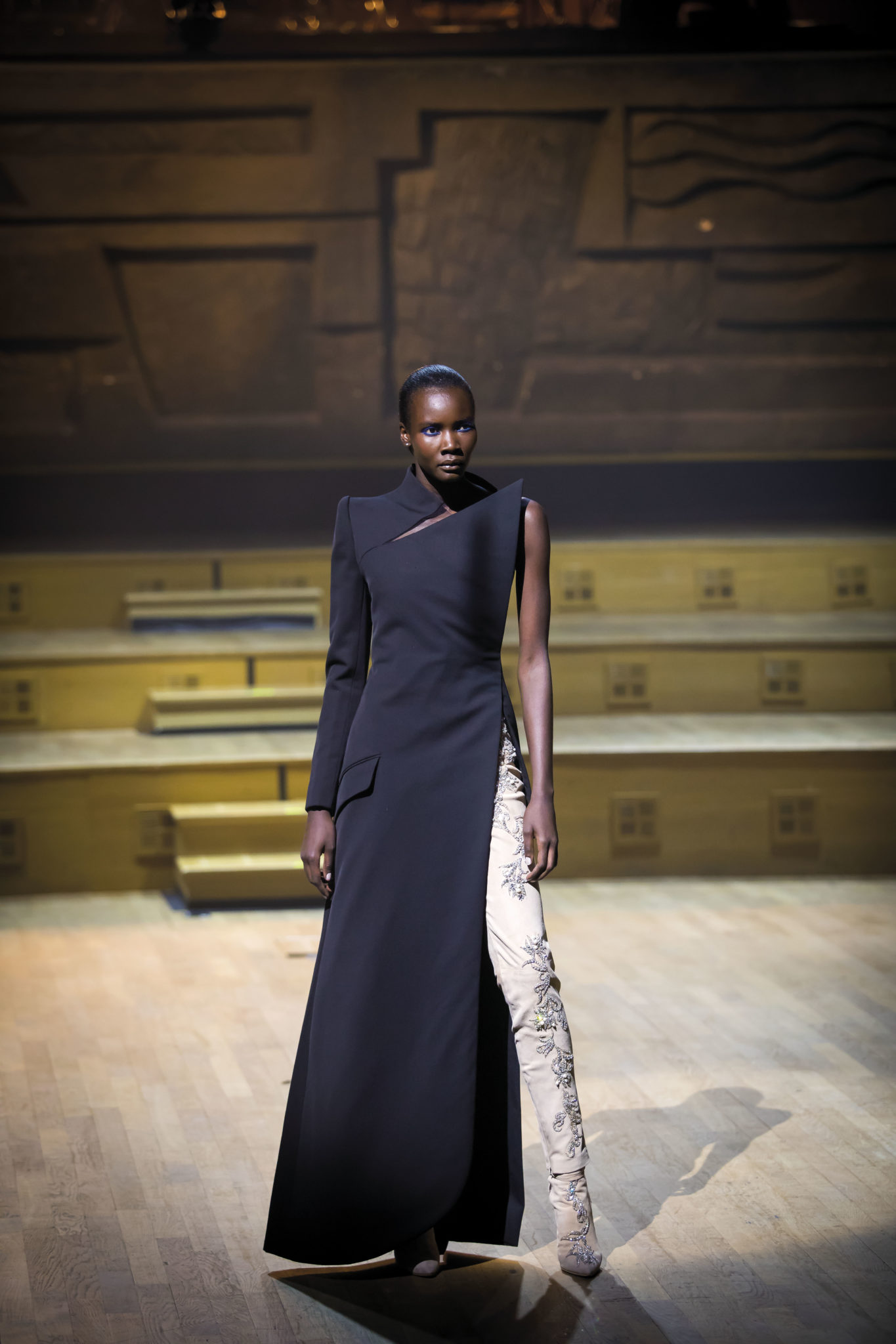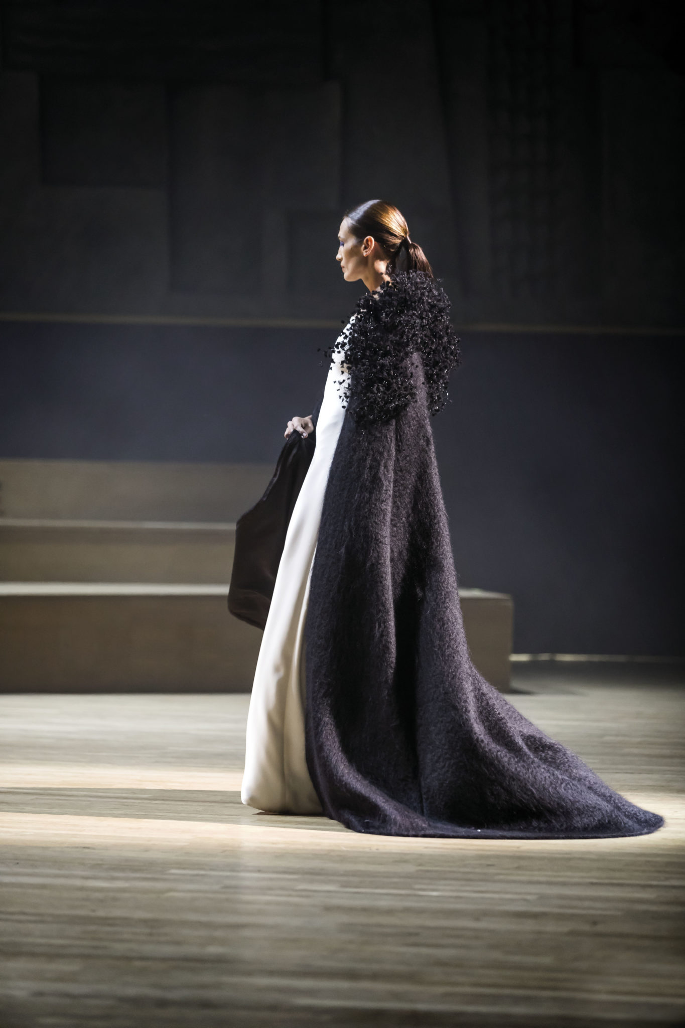 Un hiver comme un long voyage. Un nomadisme où les racines culturelles et artistiques pérennisent une esthétique nouvelle. Deux maître-mots : ergonomie et opulence. Une prestance naturelle détachée de toutes contraintes. Le mouvement est libéré et généreux. Confort et sensualité, les matières sont riches et sensorielles. Larges combinaisons-pyjamas en drap de soie, bombers en jersey à cols de cachemire, demitailleur en vigogne porté en écharpe, robe-gilet enroulée en crêpe de cachemire, manteau maxi en mohair tabac brodé de nacre, pull en daim brodé de cristal et gandoura et voile de cachemire… La sensualité des matières s’harmonise à la générosité des volumes. Les jambes, gainées de daim brodé de parures anciennes, comme un tatouage précieux, et rompent l’équilibre de grandes robes de bal en doupion. Un accessoire, le sac écrin, réalisé par le maître gainier Philippe Martial, se porte en ceinture et en manchette. Enfin, raffinement ultime : posés sur des cols de cuir, quatre parures et un diadème d’exception sont signés Boghossian