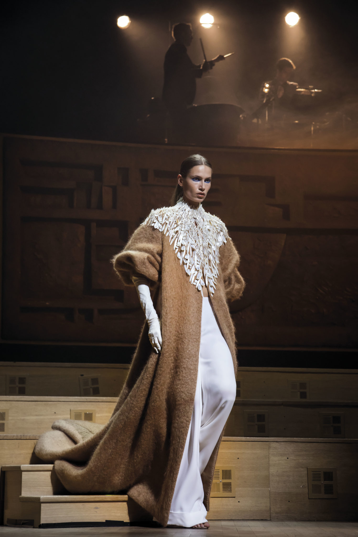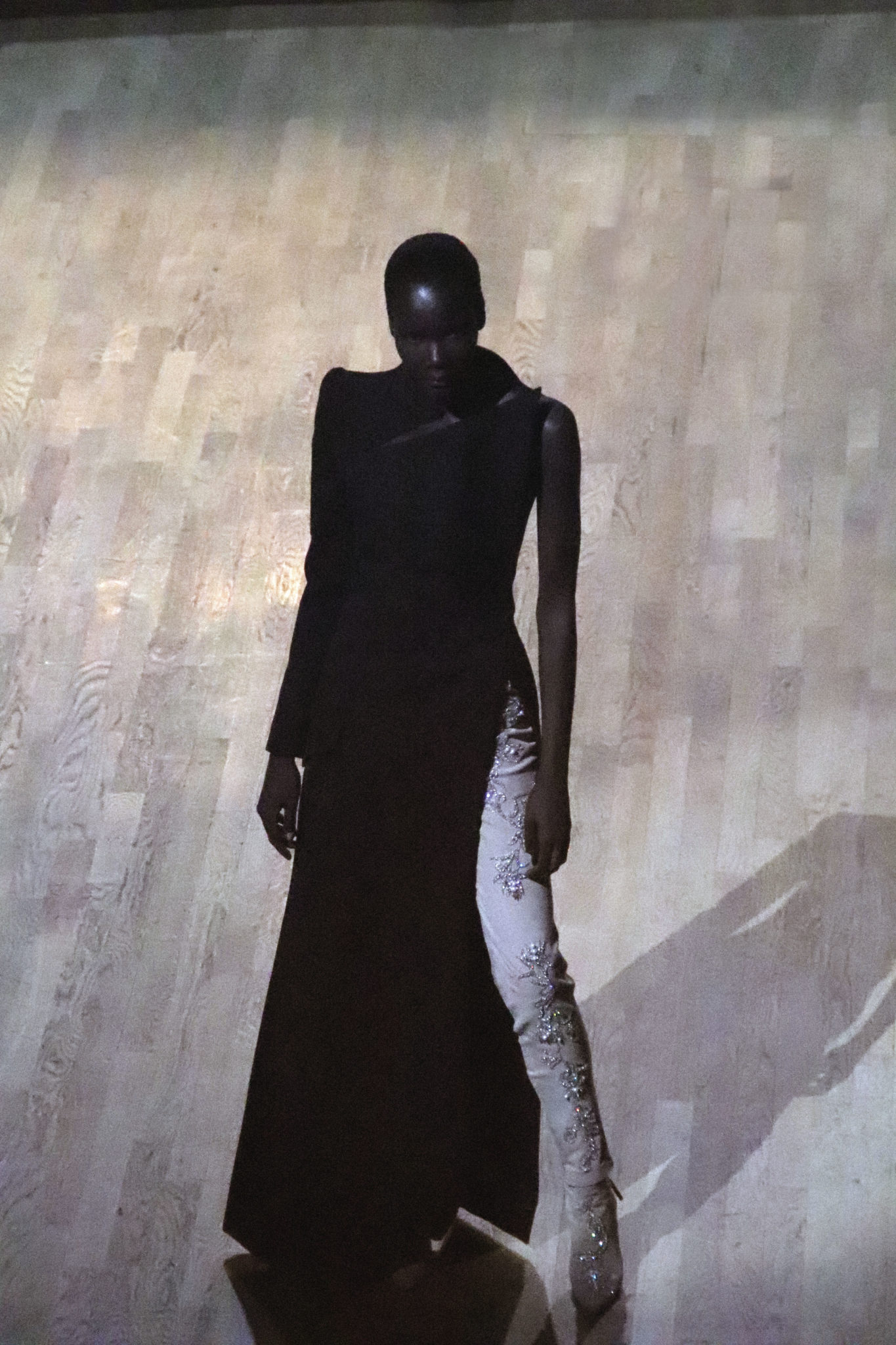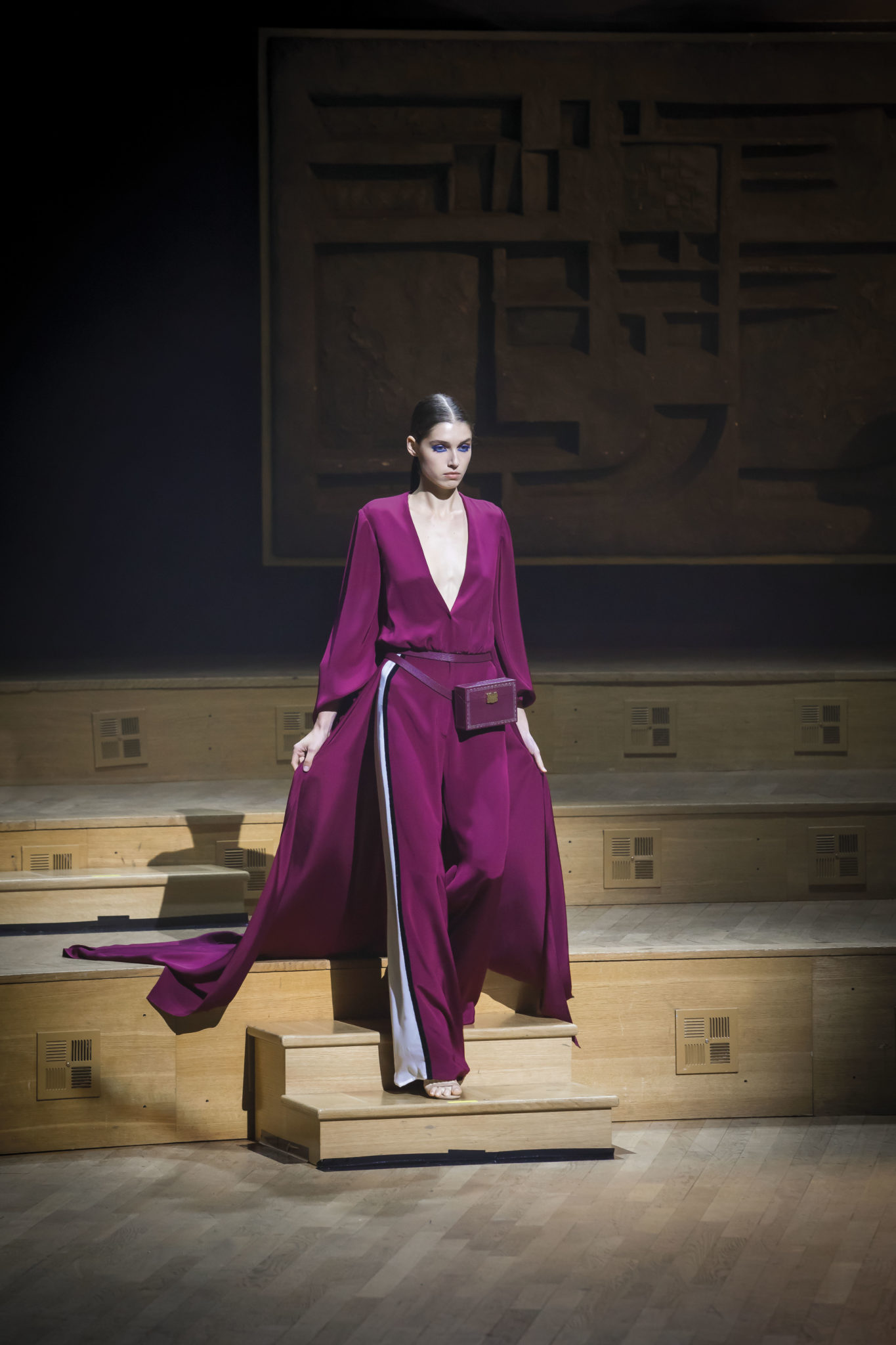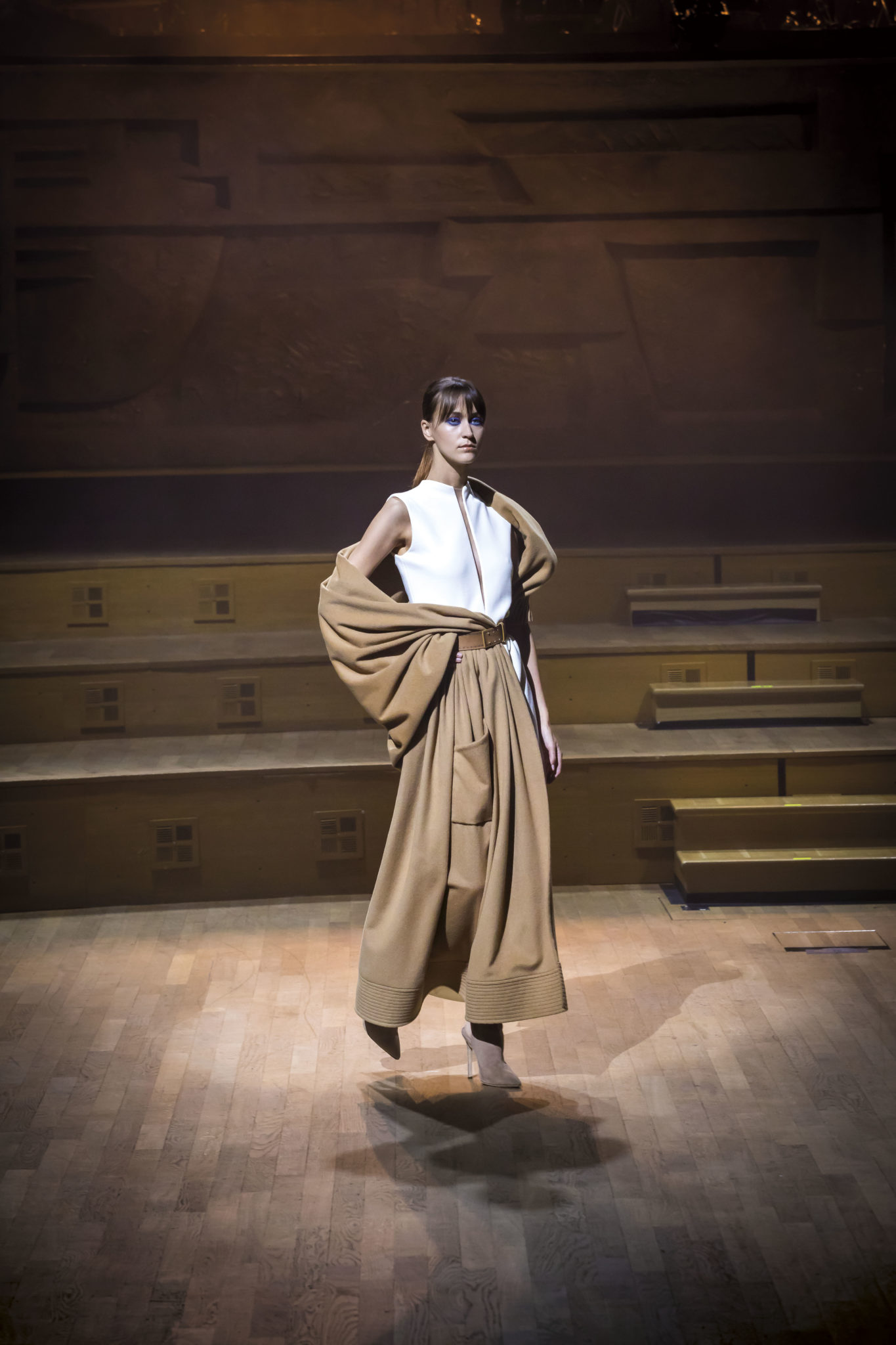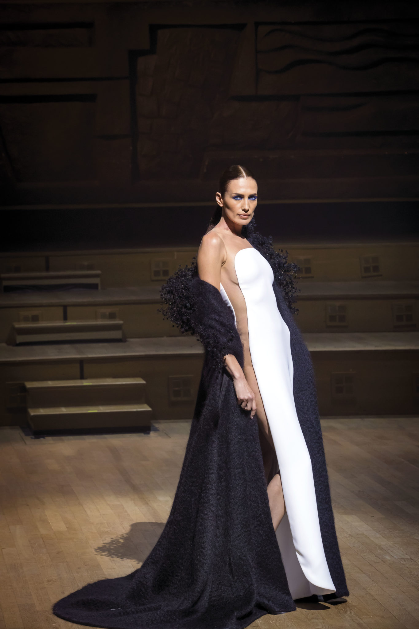 Un hiver comme un long voyage. Un nomadisme où les racines culturelles et artistiques pérennisent une esthétique nouvelle. Deux maître-mots : ergonomie et opulence. Une prestance naturelle détachée de toutes contraintes. Le mouvement est libéré et généreux. Confort et sensualité, les matières sont riches et sensorielles. Larges combinaisons-pyjamas en drap de soie, bombers en jersey à cols de cachemire, demitailleur en vigogne porté en écharpe, robe-gilet enroulée en crêpe de cachemire, manteau maxi en mohair tabac brodé de nacre, pull en daim brodé de cristal et gandoura et voile de cachemire… La sensualité des matières s’harmonise à la générosité des volumes. Les jambes, gainées de daim brodé de parures anciennes, comme un tatouage précieux, et rompent l’équilibre de grandes robes de bal en doupion. Un accessoire, le sac écrin, réalisé par le maître gainier Philippe Martial, se porte en ceinture et en manchette. Enfin, raffinement ultime : posés sur des cols de cuir, quatre parures et un diadème d’exception sont signés Boghossian