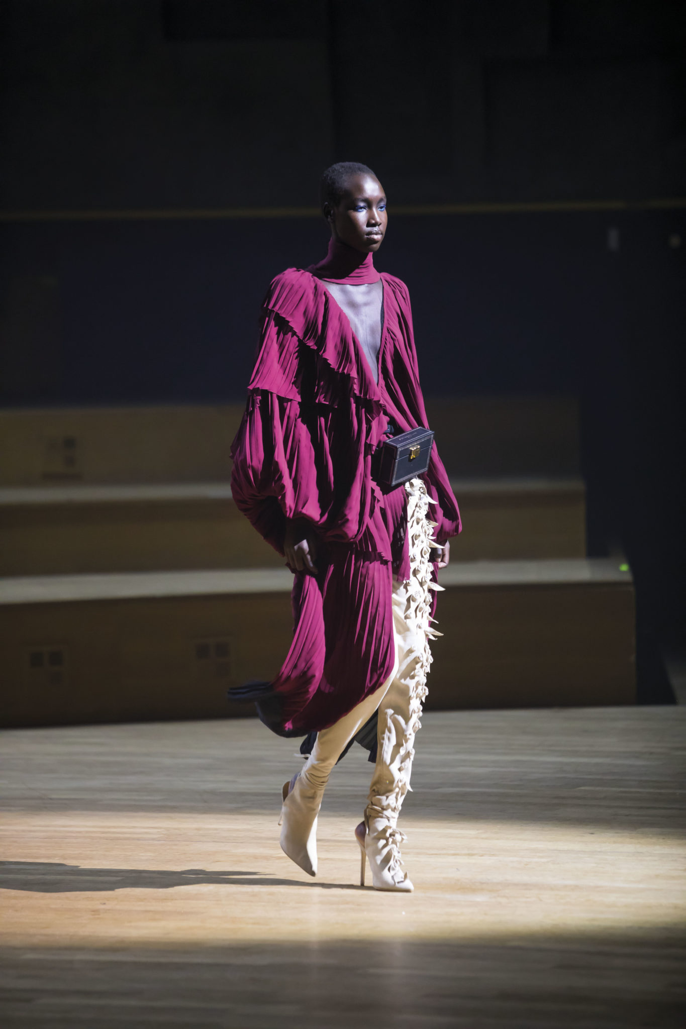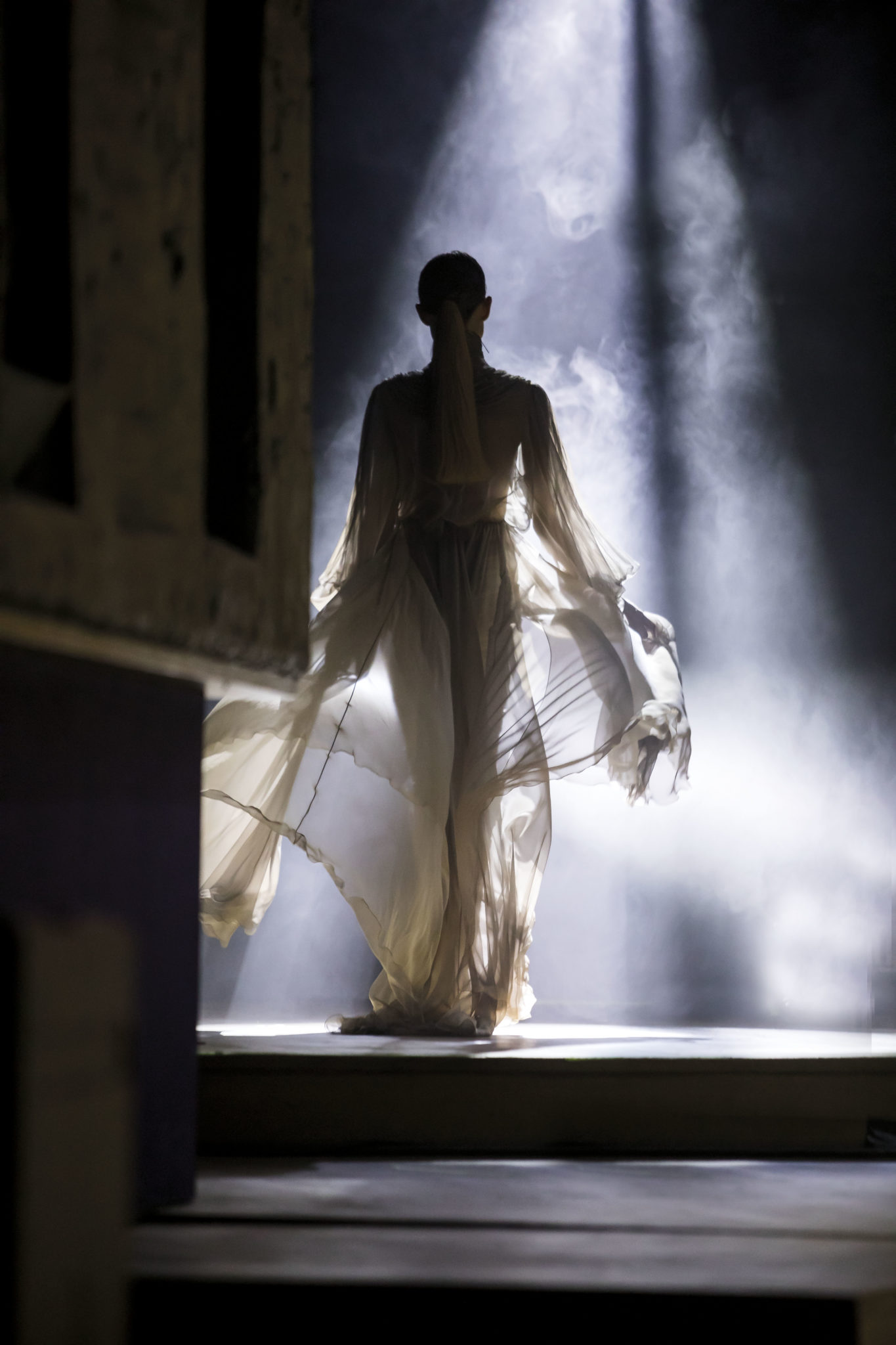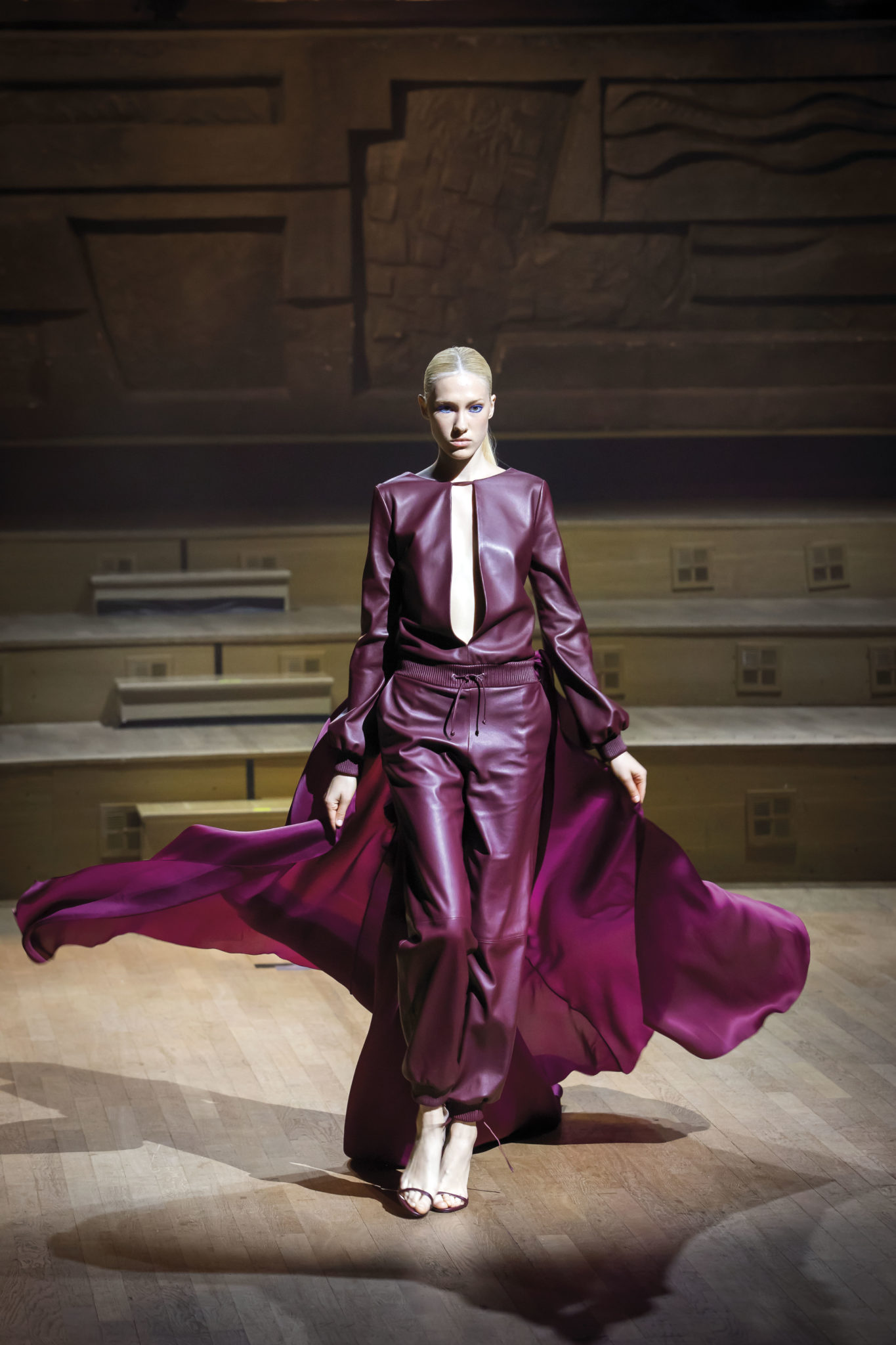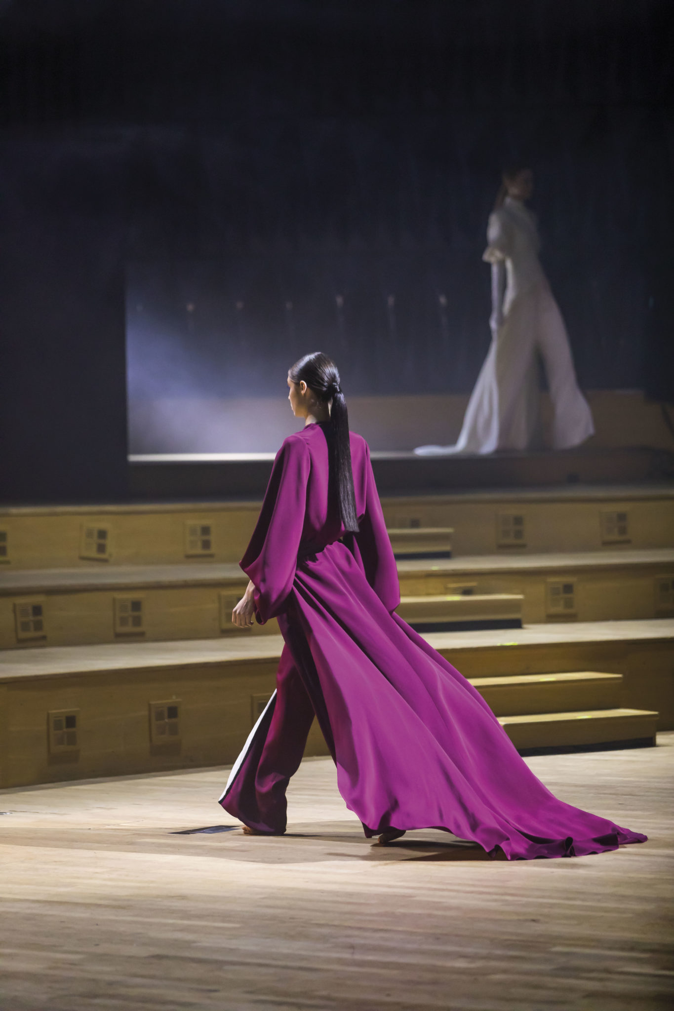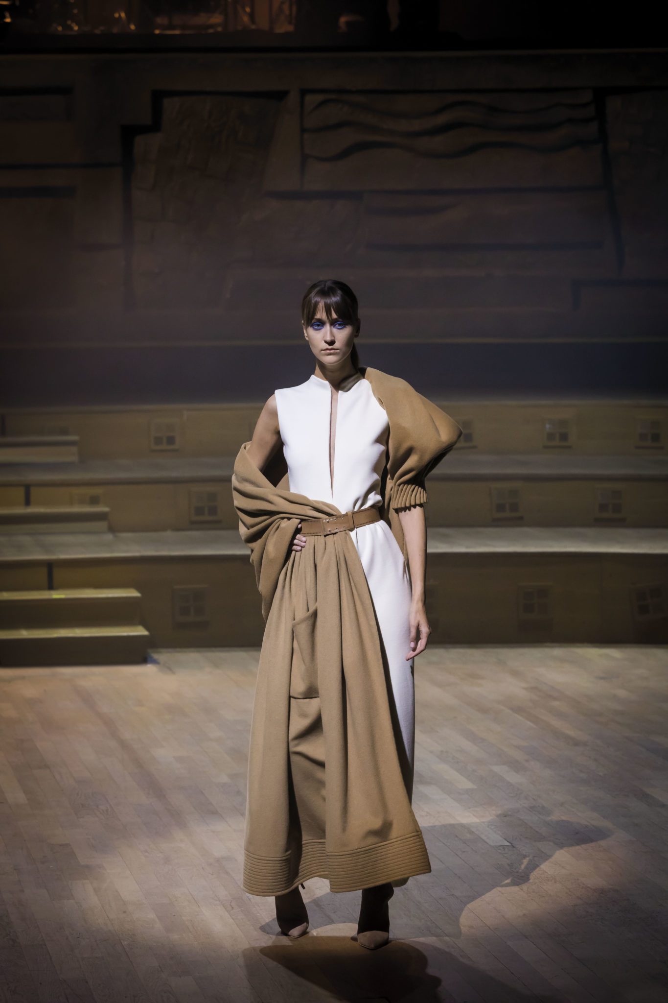 Un hiver comme un long voyage. Un nomadisme où les racines culturelles et artistiques pérennisent une esthétique nouvelle. Deux maître-mots : ergonomie et opulence. Une prestance naturelle détachée de toutes contraintes. Le mouvement est libéré et généreux. Confort et sensualité, les matières sont riches et sensorielles. Larges combinaisons-pyjamas en drap de soie, bombers en jersey à cols de cachemire, demitailleur en vigogne porté en écharpe, robe-gilet enroulée en crêpe de cachemire, manteau maxi en mohair tabac brodé de nacre, pull en daim brodé de cristal et gandoura et voile de cachemire… La sensualité des matières s’harmonise à la générosité des volumes. Les jambes, gainées de daim brodé de parures anciennes, comme un tatouage précieux, et rompent l’équilibre de grandes robes de bal en doupion. Un accessoire, le sac écrin, réalisé par le maître gainier Philippe Martial, se porte en ceinture et en manchette. Enfin, raffinement ultime : posés sur des cols de cuir, quatre parures et un diadème d’exception sont signés Boghossian