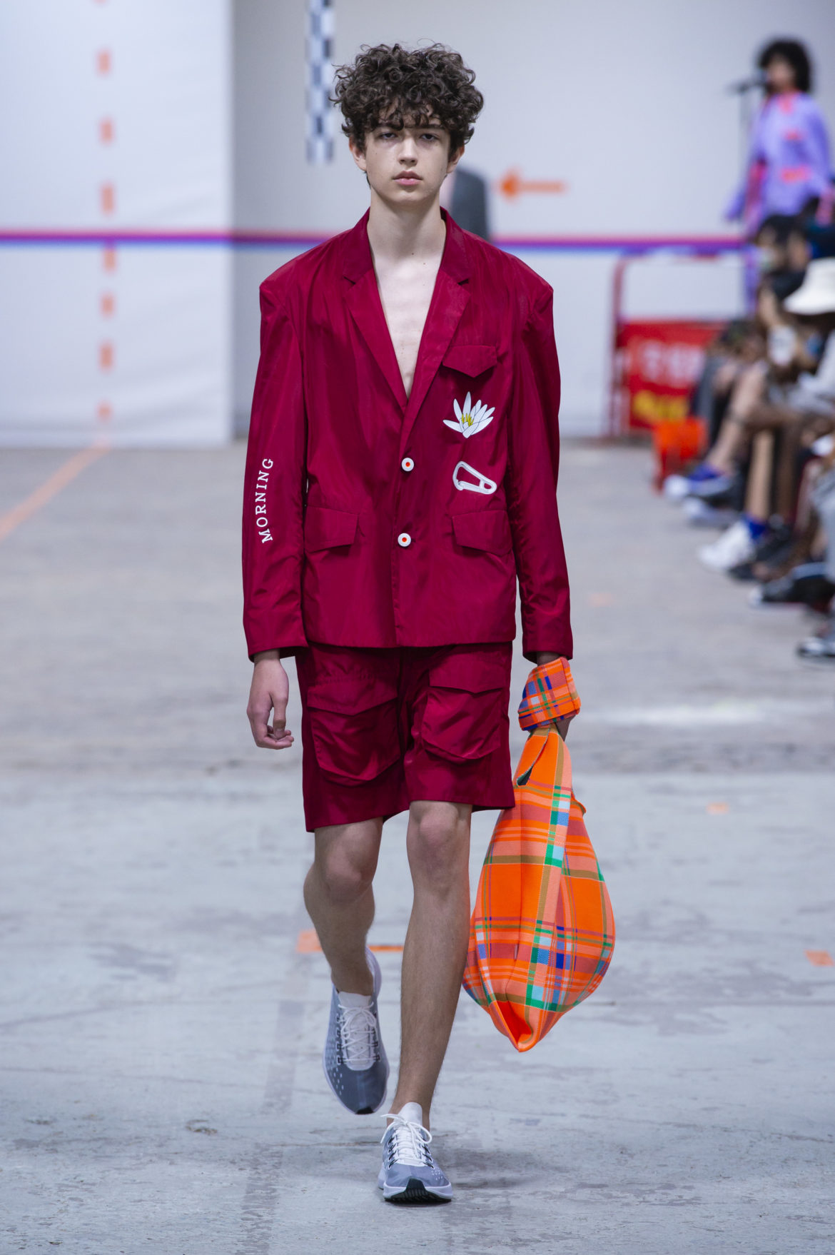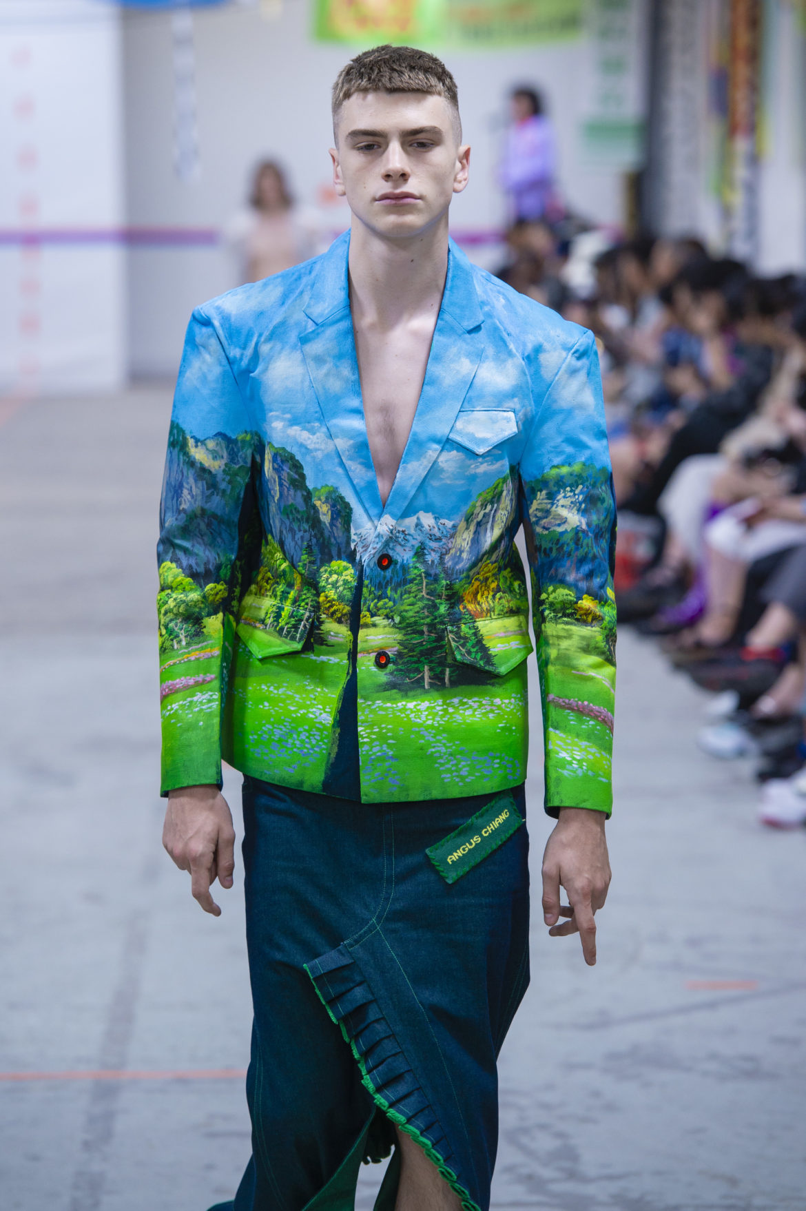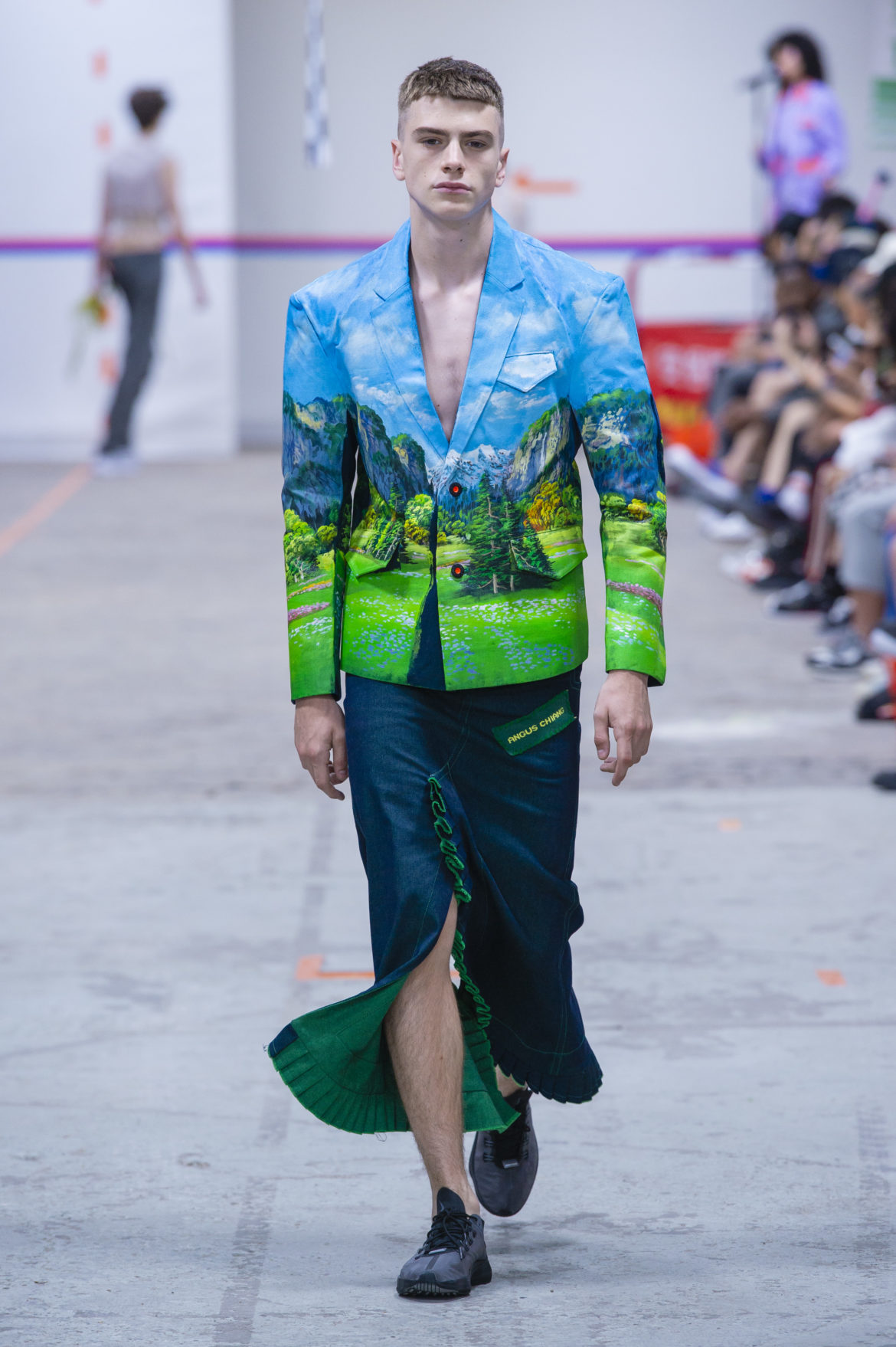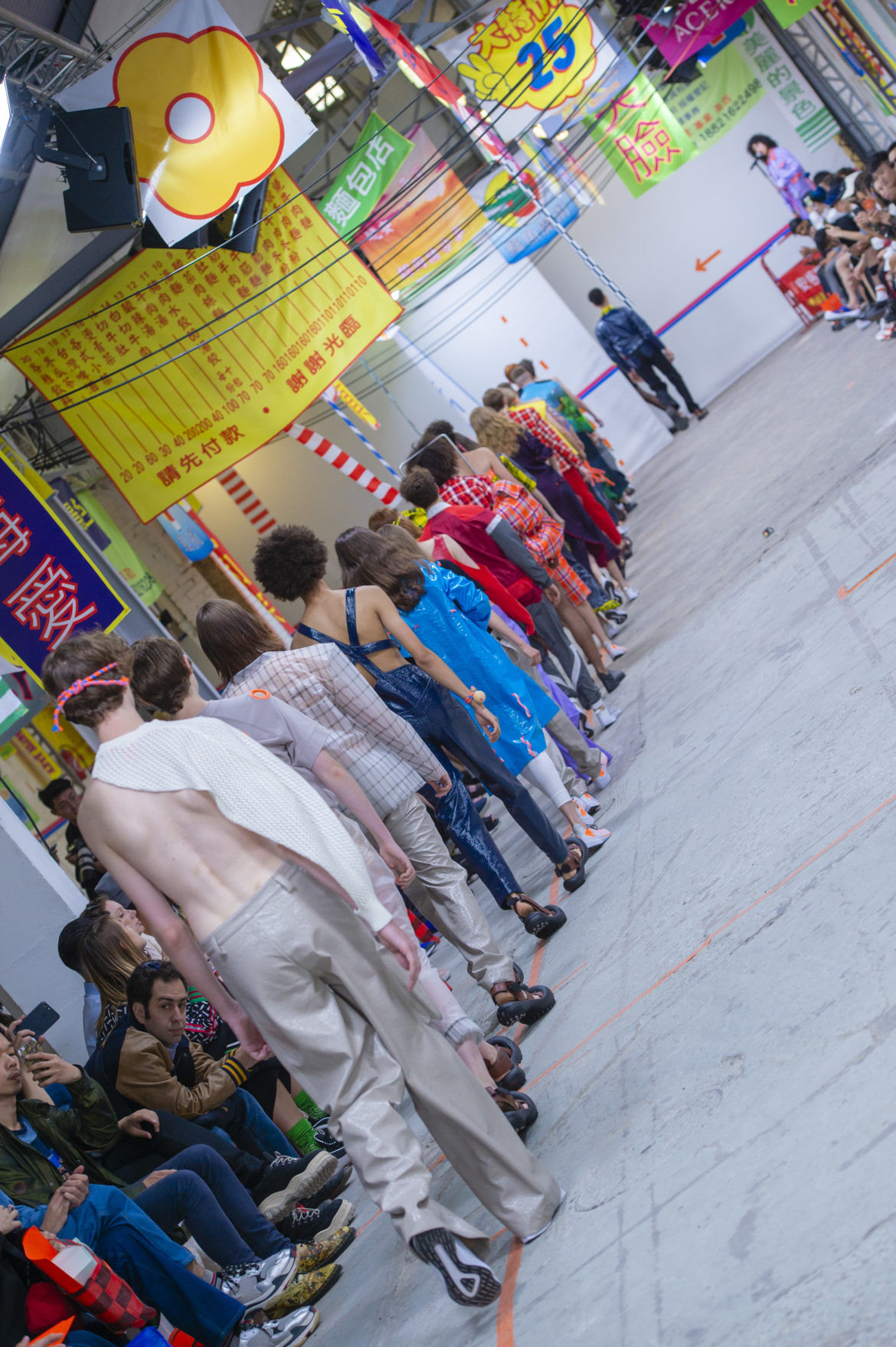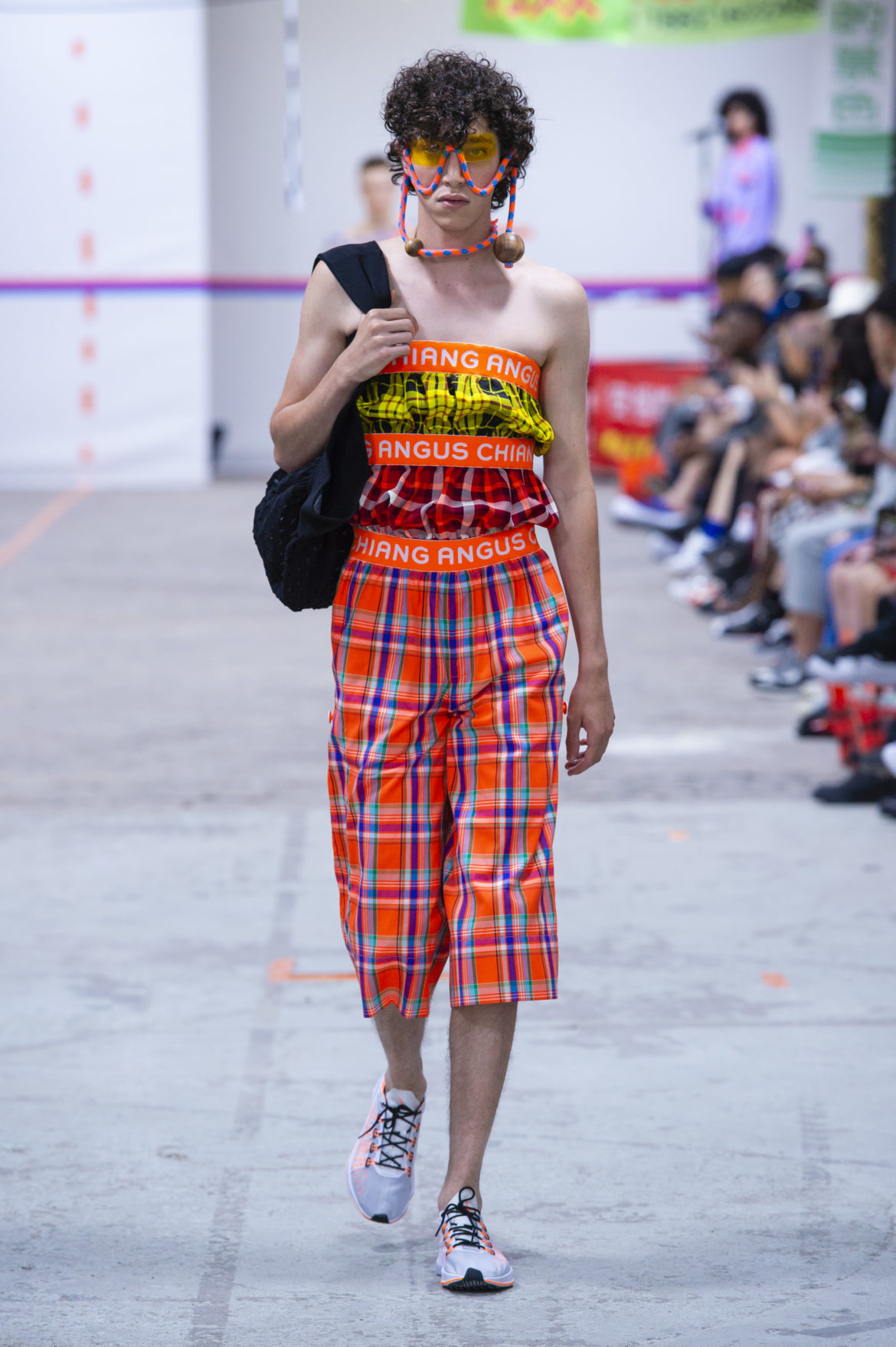 Angus Chiang’s SS19 collection focuses on the older generations preserved idea of city life. This image revolves around street art in Taiwan’s city corners known as the ‘transformer box’. The ‘transformer box’ holds much ambiguity within Taiwan, with many feeling that the presence is a hindrance whilst others argue that it allows an ageless, creative freedom. Aesthetics from each era compete with one another; each poster is patch-worked with something new, creating a masterpiece that precedes generations. Angus Chiang uses this to create a collage of Taiwan. The SS19 collection attempts to understand each individual’s story whilst viewing a new generation coexisting within an old. Looking at the everyday clothing of Aunts and Uncles at the local community centre, polo shirts, cropped pants and fake two pieces tops are reimagined in fun, youthful concepts. Chiang uses a hemming technique to interpret unruly lines and silhouettes. Through SS19, Chiang obscures gender, adding typically female elements such as strapless, backless and flounce into his collection and ‘breaking conventional wisdom’. The soft, warm, core colour comes from landscape paintings on ‘transformer boxes’. Chiang also creates a three-dimensional element through his use of denim and transparent fabric. Chiang not only explores the theme of spirit, but also has a strong focus on durability for SS19, adding leather and a plaid-print, materialized from 100% paper. Shoes are based on elders’ favorite cheap, plastic slippers and leather sandals. Combining the brand’s classic loafers and selected Leather, Chiang reinvents a fashion shoe for the elders through a fun and lively perspective. Classic pieces are re-announced in SS19, such as elastic band and outdoor climbing rope. The Taiwanese theme of ‘all in one’ also becomes a main design concept in which native’s are known to mix and match. SS19 introduces the multifunctional accessories through the ‘glasses necklace’ and ‘sling earrings’. Chiang’s SS19 collection is a multi-generational nod to Taiwanese culture. Notes to Editor As a further expression of Taiwanese culture, ANGUS CHIANG has worked with popular local brands: Wang De Chuan, PineApple Hill and Acera. Wang De Chuan’s Jinxuan Anshang Oolong Tea, PineApple Hill’s pure Chiayi pineapple cake and Acera’s yellow ceramic travel mug are placed together in the « Taiwanese Ga Ji La » retro bag echoing a warm-hearted and gift giving culture. Additionally, continuing the brands year’s fifth season, January Paris Fashion Week and March’s collaboration with NIKE at Shanghai Fashion Week, ANGUS CHIANG has selected NIKE EXP-X14 to echo with the main theme and add highlights to the show. Credits Taiwanese artists and National treasures: Jui-Chin Chiu and Wang-Hao Chang have both played a pivotal role in ANGUS CHIANG’s SS19 collection. Chiu is an artist who paints on transformer boxes and is the only Taiwanese citizen invited by the Swiss Alpine Museum to paint the transformer boxes in Bern, Switzerland. Chiu’s landscape paintings inspired the colours and reinterpretation seen throughout Chiang’s SS19 collection. Chang, who is often known as ‘information Grandpa’ for his work, teaching elders in local communities to use computers has lead groups of elders to create unique greeting graphics. Through this, Chang is narrowing the generation’s age gap. For SS19, ANGUS CHIANG will introduce a new music style, working with Taiwan Golden Melody Awards nominated Hip-Hop, Jazz Band, LE037+SOSS and Soul, Jazz vocalist 9m88. The SS19 catwalk will include a live performance by 9m88. Taiwanese artist, John Yuyi, is known for her unique tattooing. As SS19’s guest visional stylist, Yuyi will convey a different level of conflicting aesthetics through her distinctive perspective and taste. 9m88 and John Yuyi’s participation in the SS19 catwalk show creates a new-generation reunion, in which the former classmates have come together to complete SS19’s core concept and showcase the collaborative work of past generations.