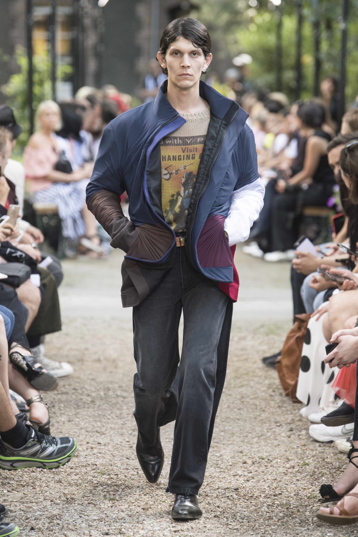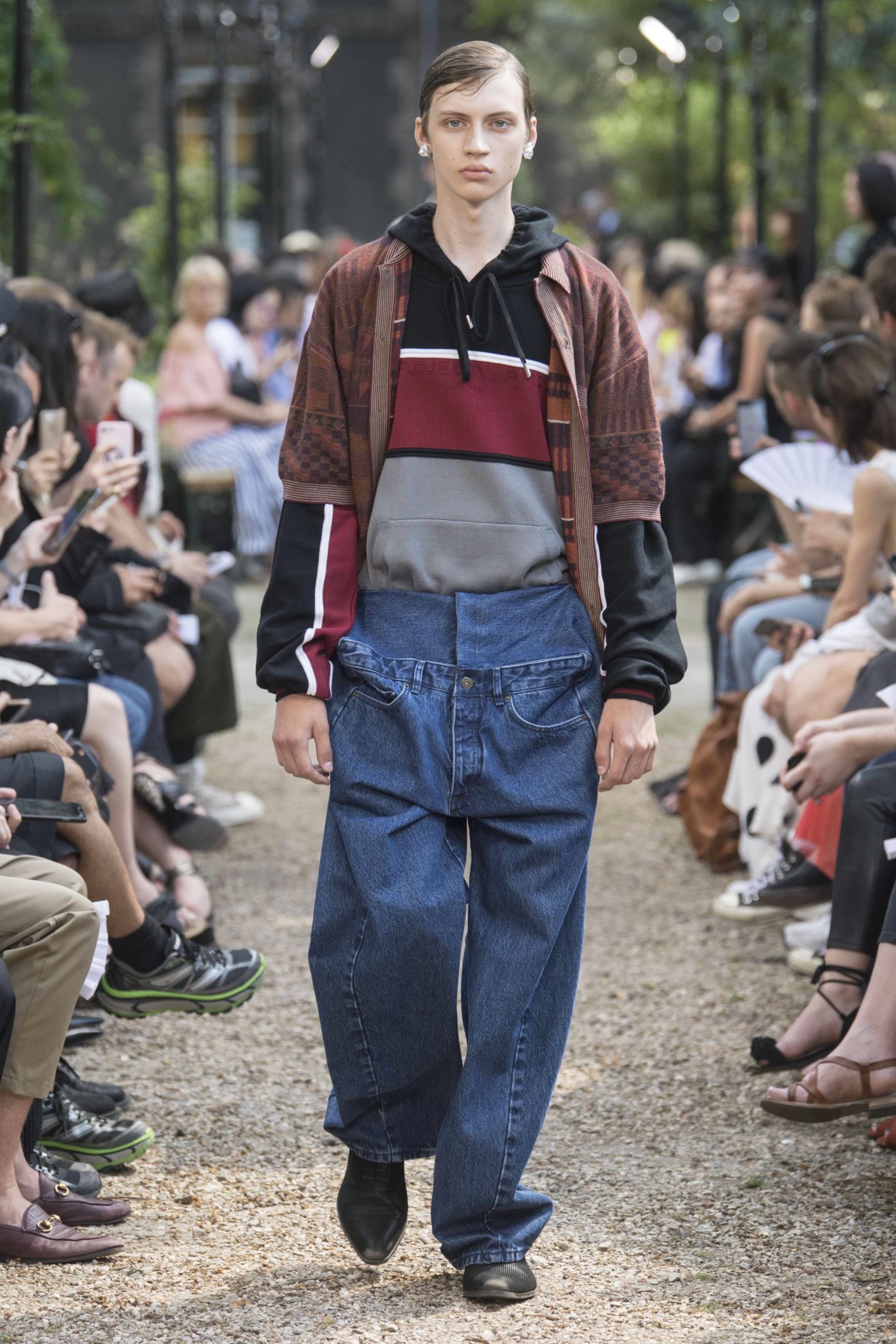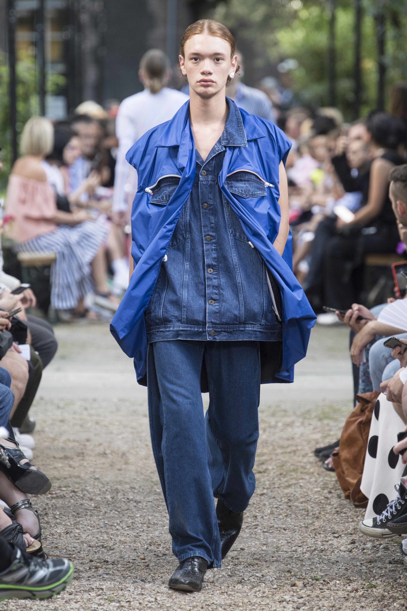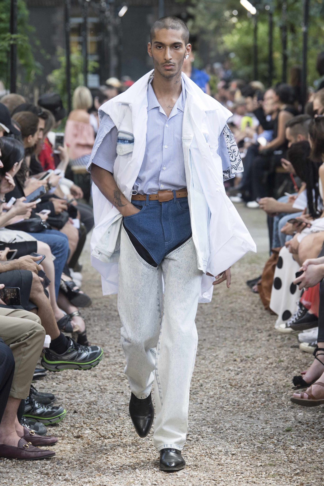 La collection SS19 introduit également une nouvelle technique de travail des volumes, avec des constructions 3D « pop out » sur les vestes en denim et jeans. Des tissus polychromes sont retravaillés à la main, percés par des clous décoratifs.