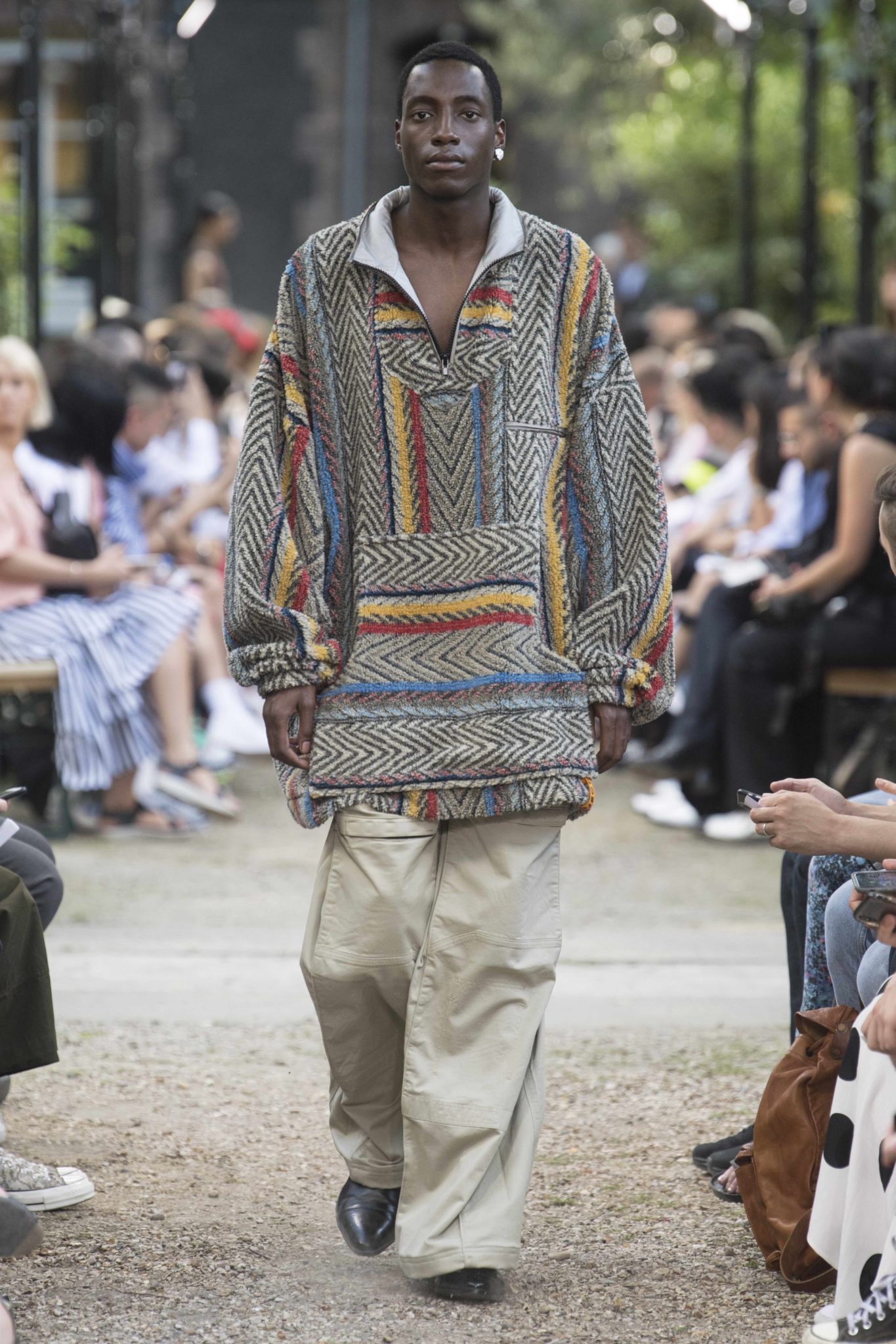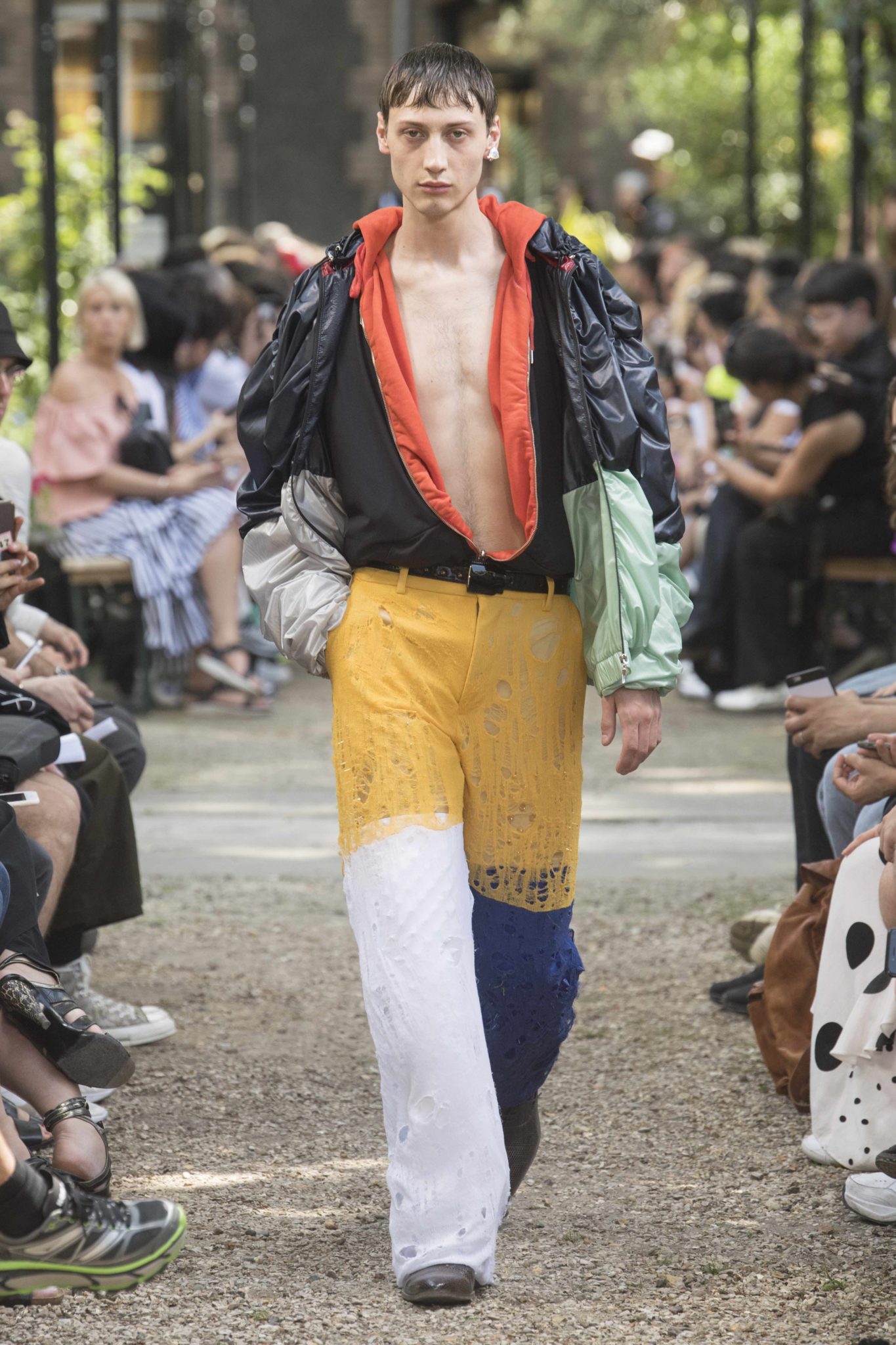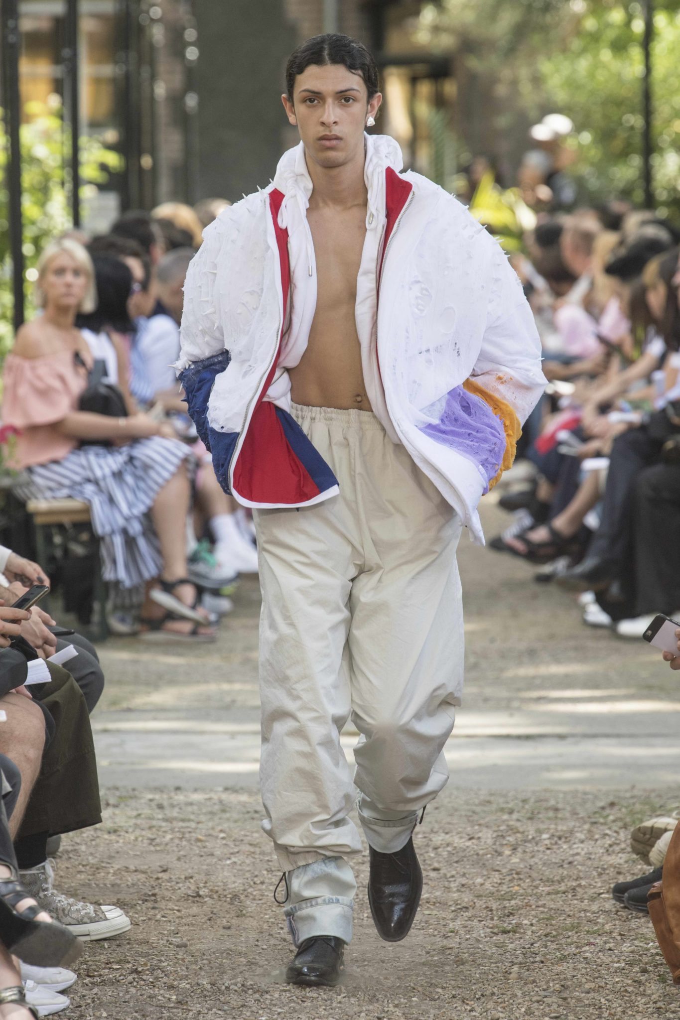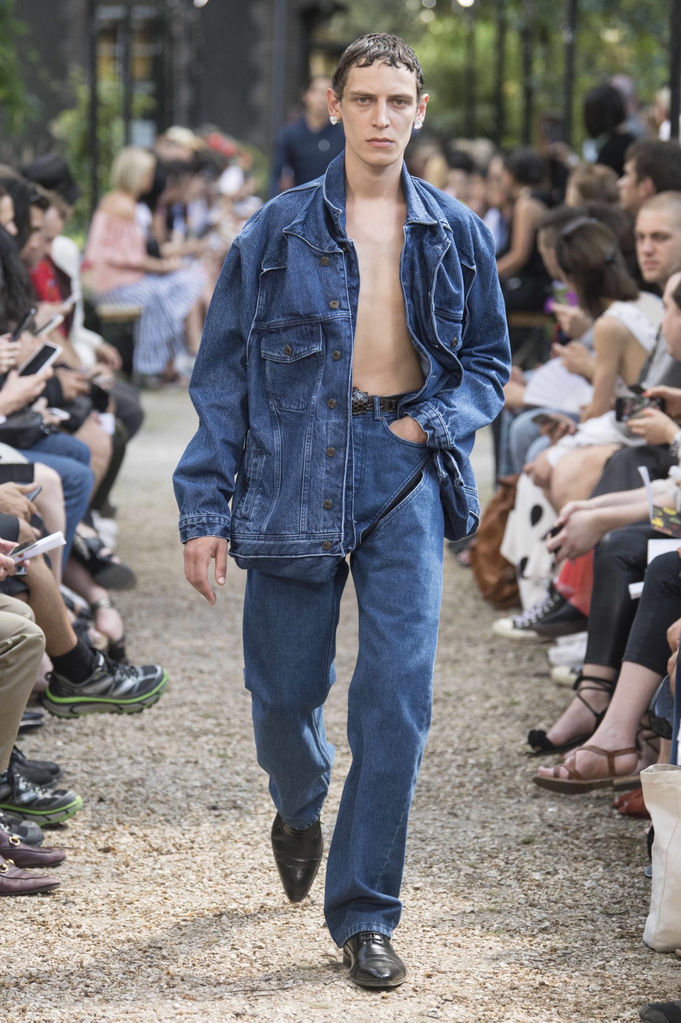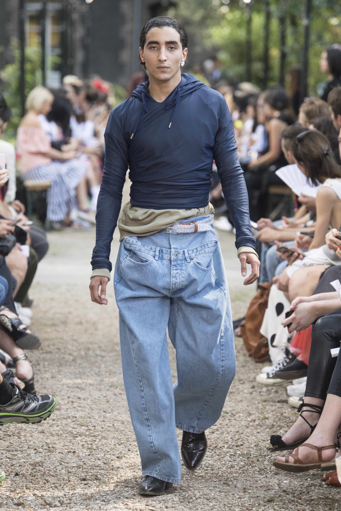 La collection SS19 introduit également une nouvelle technique de travail des volumes, avec des constructions 3D « pop out » sur les vestes en denim et jeans. Des tissus polychromes sont retravaillés à la main, percés par des clous décoratifs.