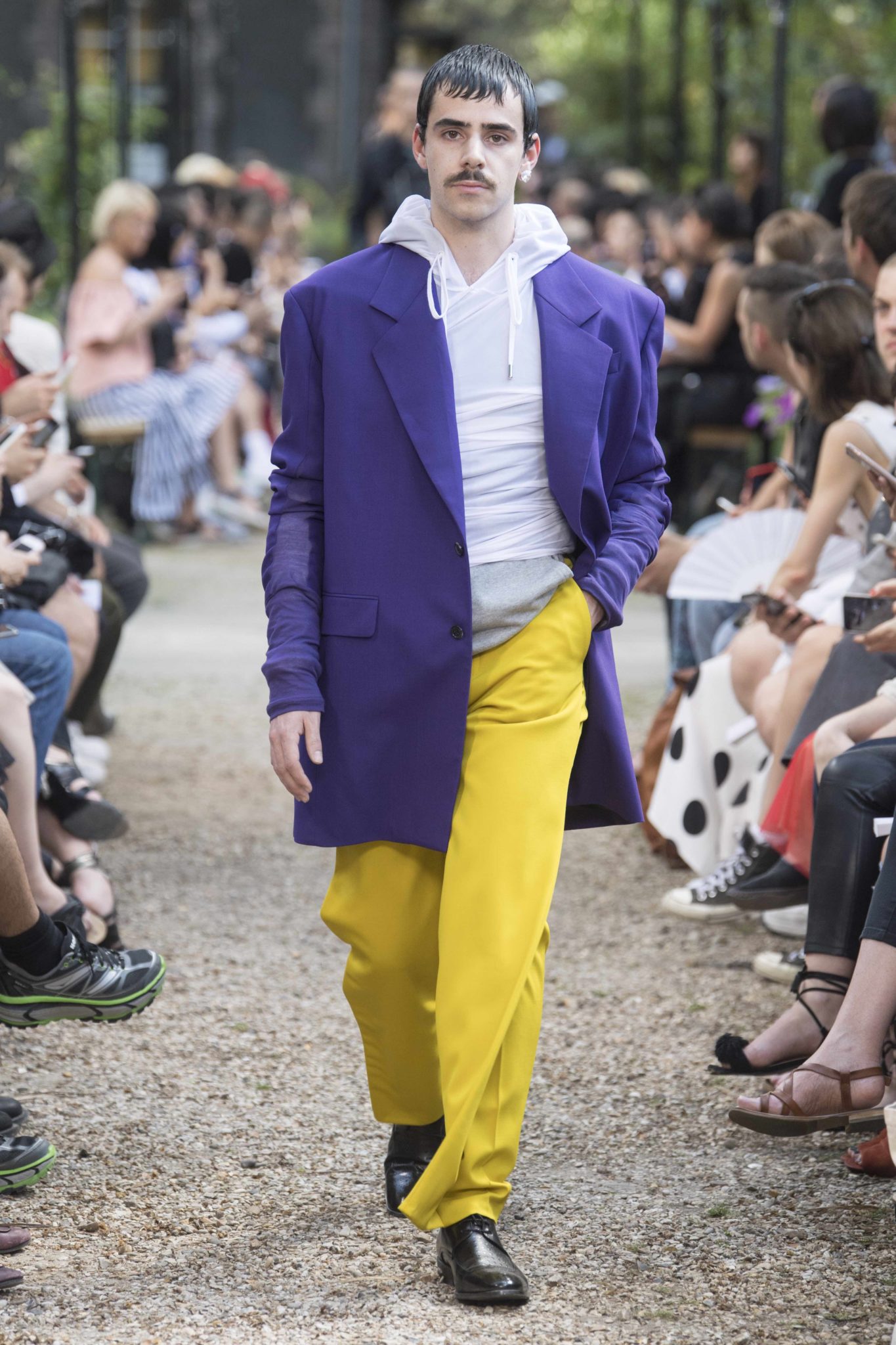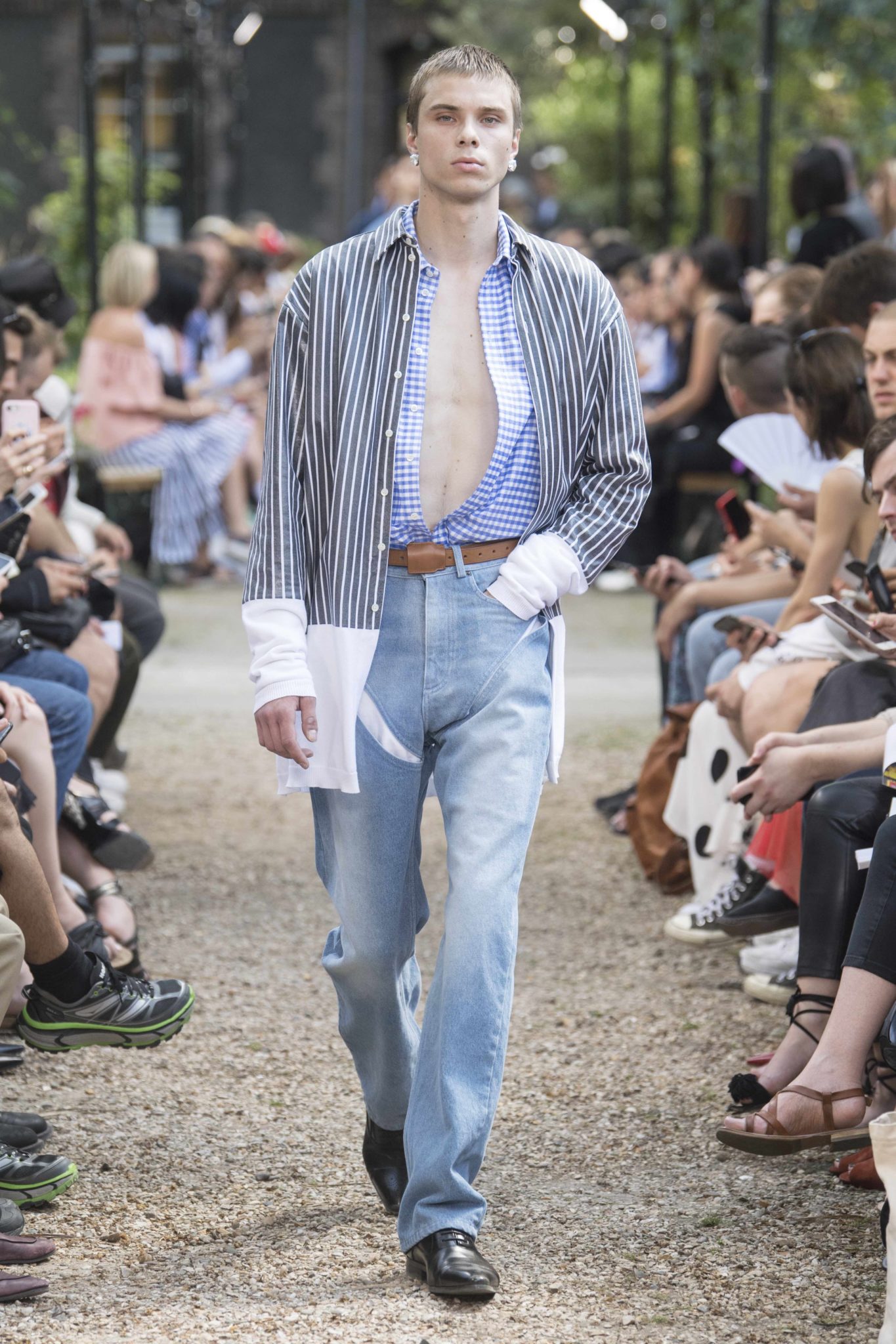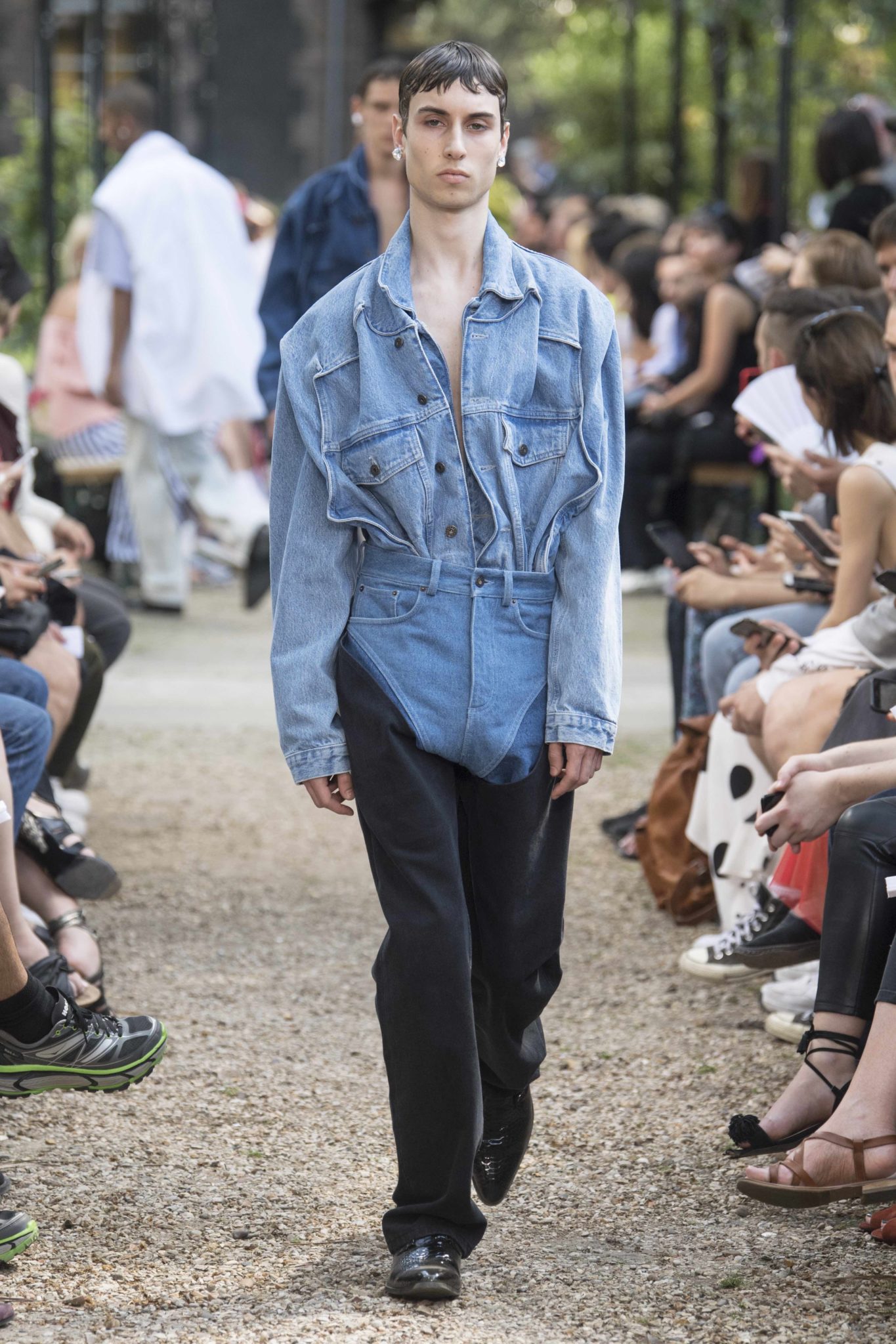 Costumes pastels fuselés avec des détails transparents sur les manches manches et jambes, mini-shorts emblématiques excessivement courts – désormais déclinés en jeans dépareillés pour homme, chemises d’été bi-matière en paisley.