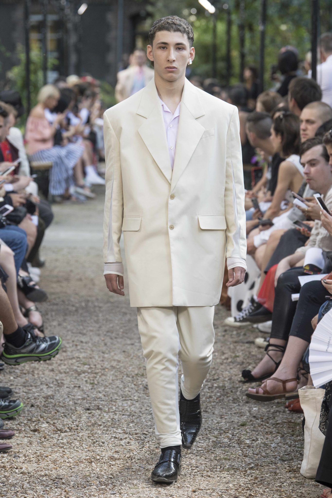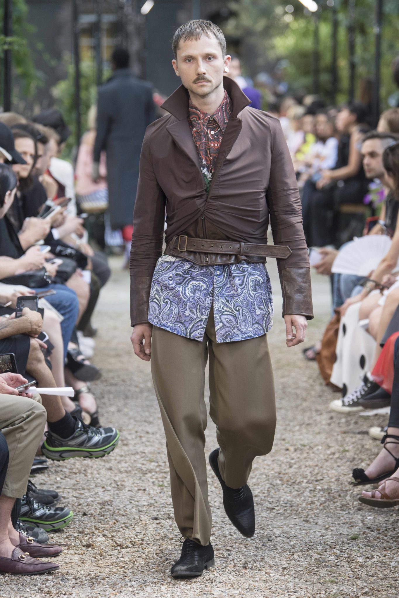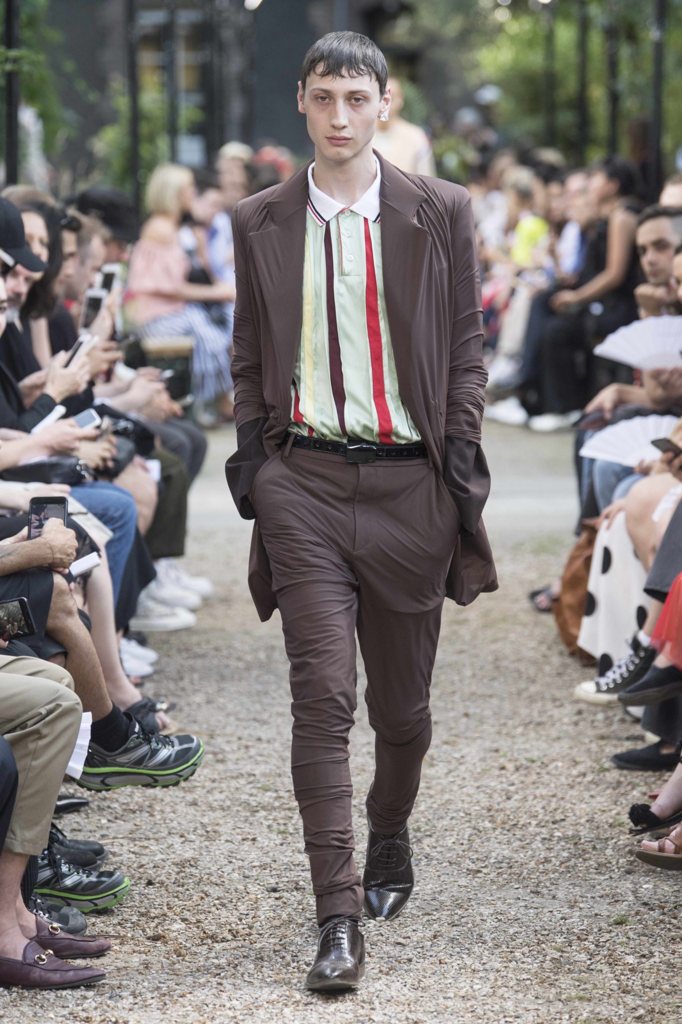 Costumes pastels fuselés avec des détails transparents sur les manches manches et jambes, mini-shorts emblématiques excessivement courts – désormais déclinés en jeans dépareillés pour homme, chemises d’été bi-matière en paisley.