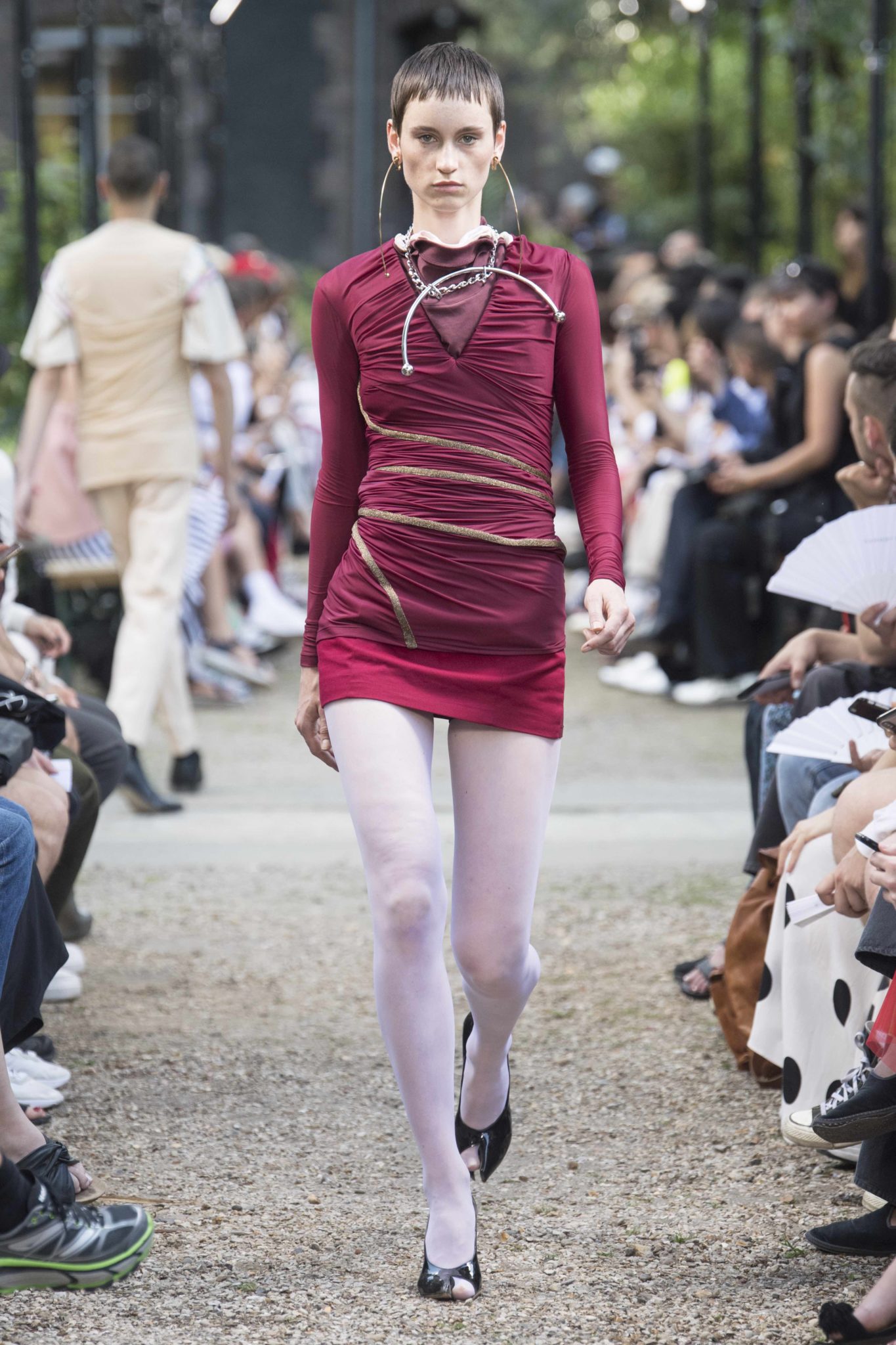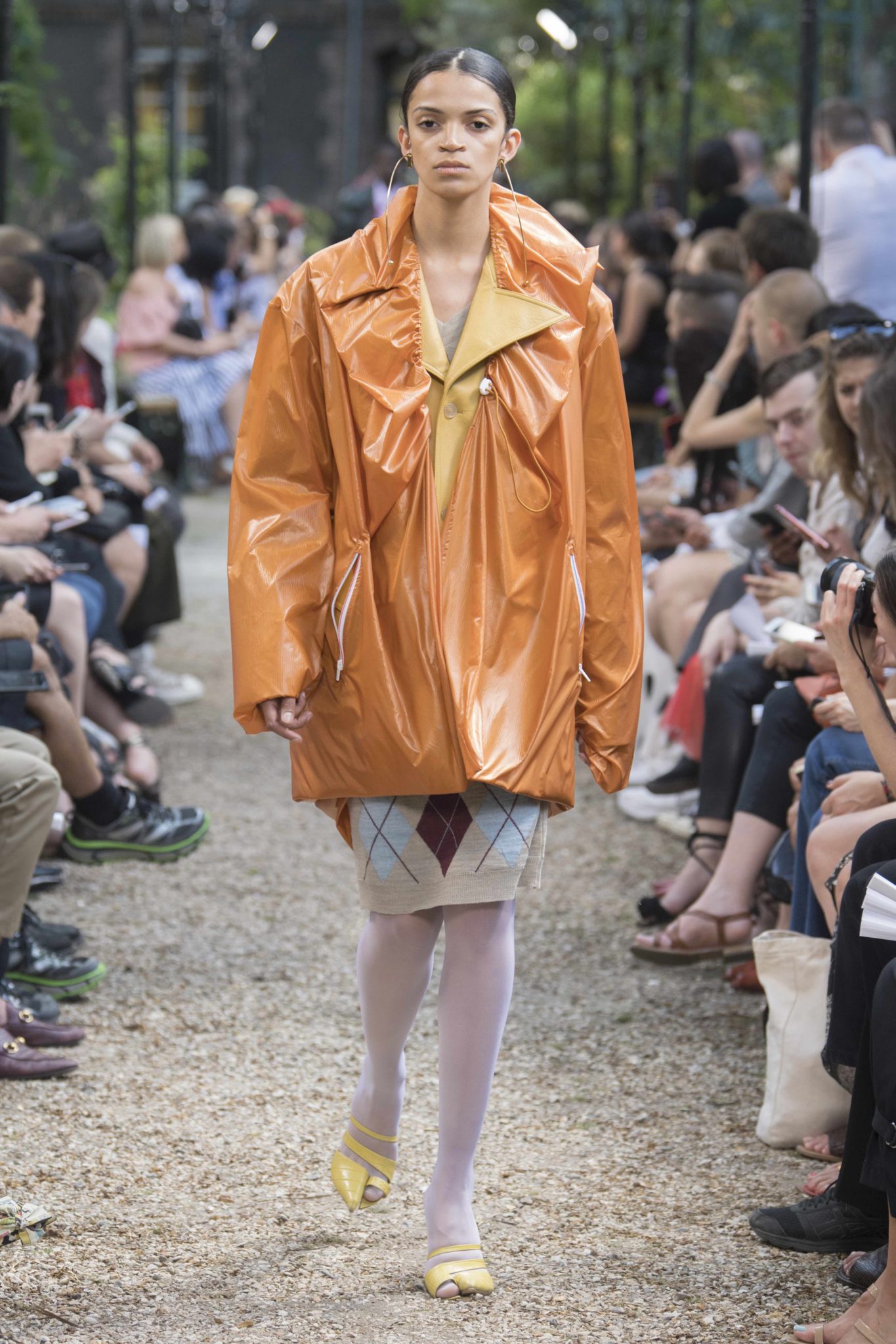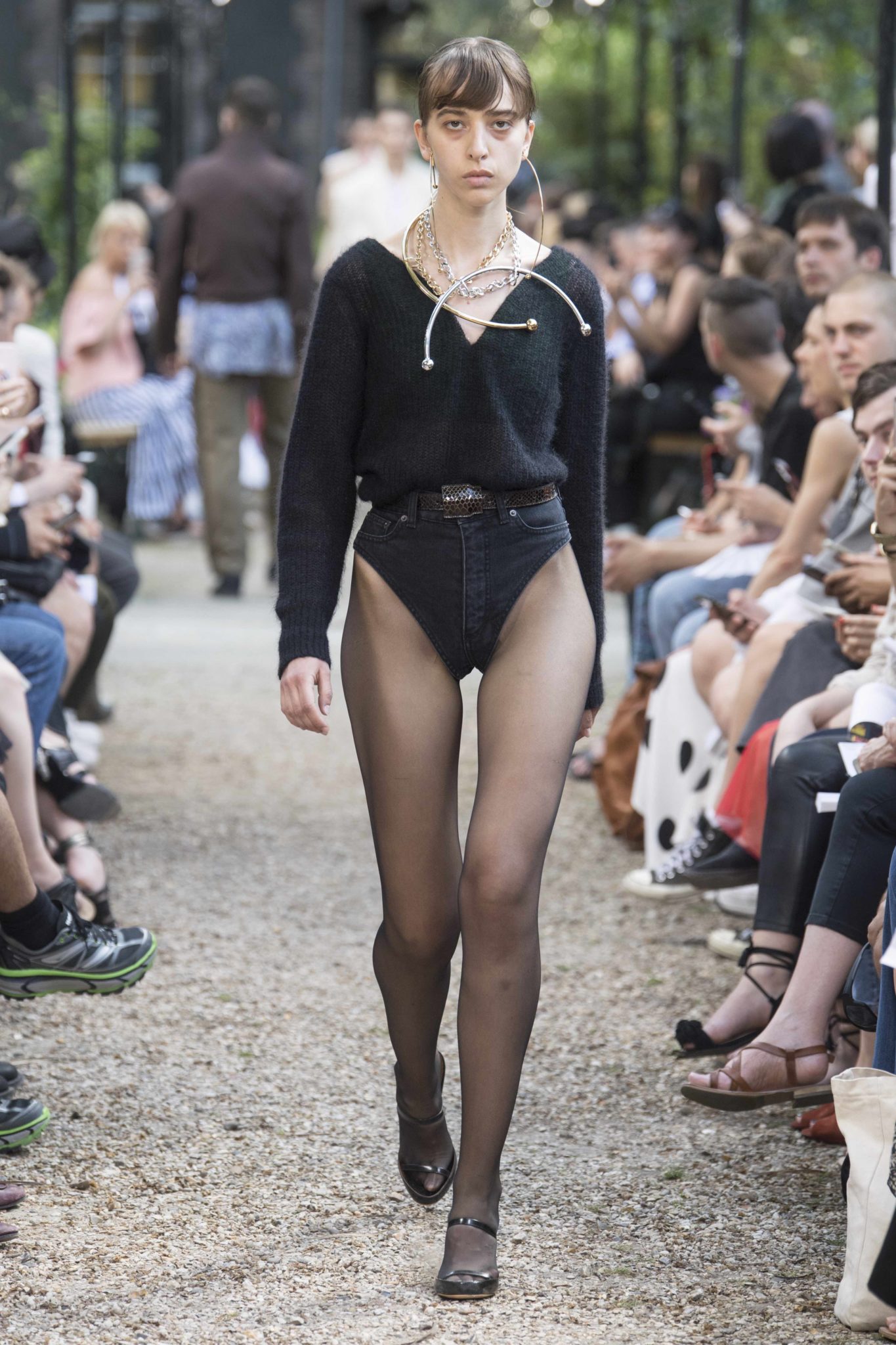 Cette saison, le directeur artistique Glenn Martens propose de nouvelles silhouettes en enveloppant des blazers, manteaux, hoodies, bodys et mini-robes sous des membranes amovibles de nylon et lycra. La superposition, qui rappelle les travaux de l’artiste Christo, agit à la fois comme élément de protection et de styling.