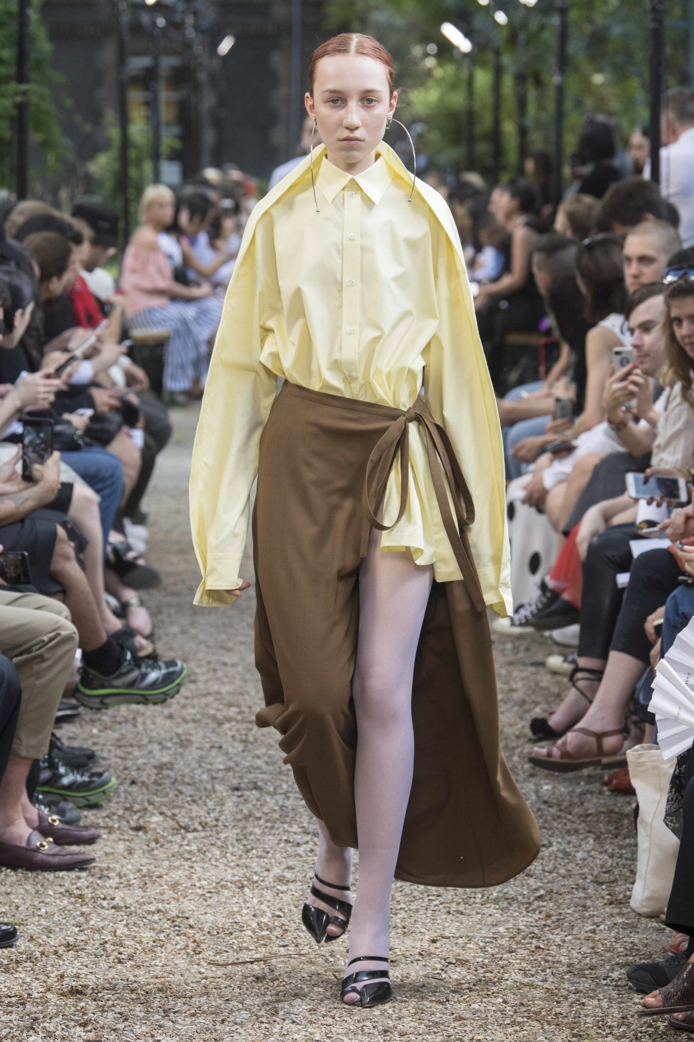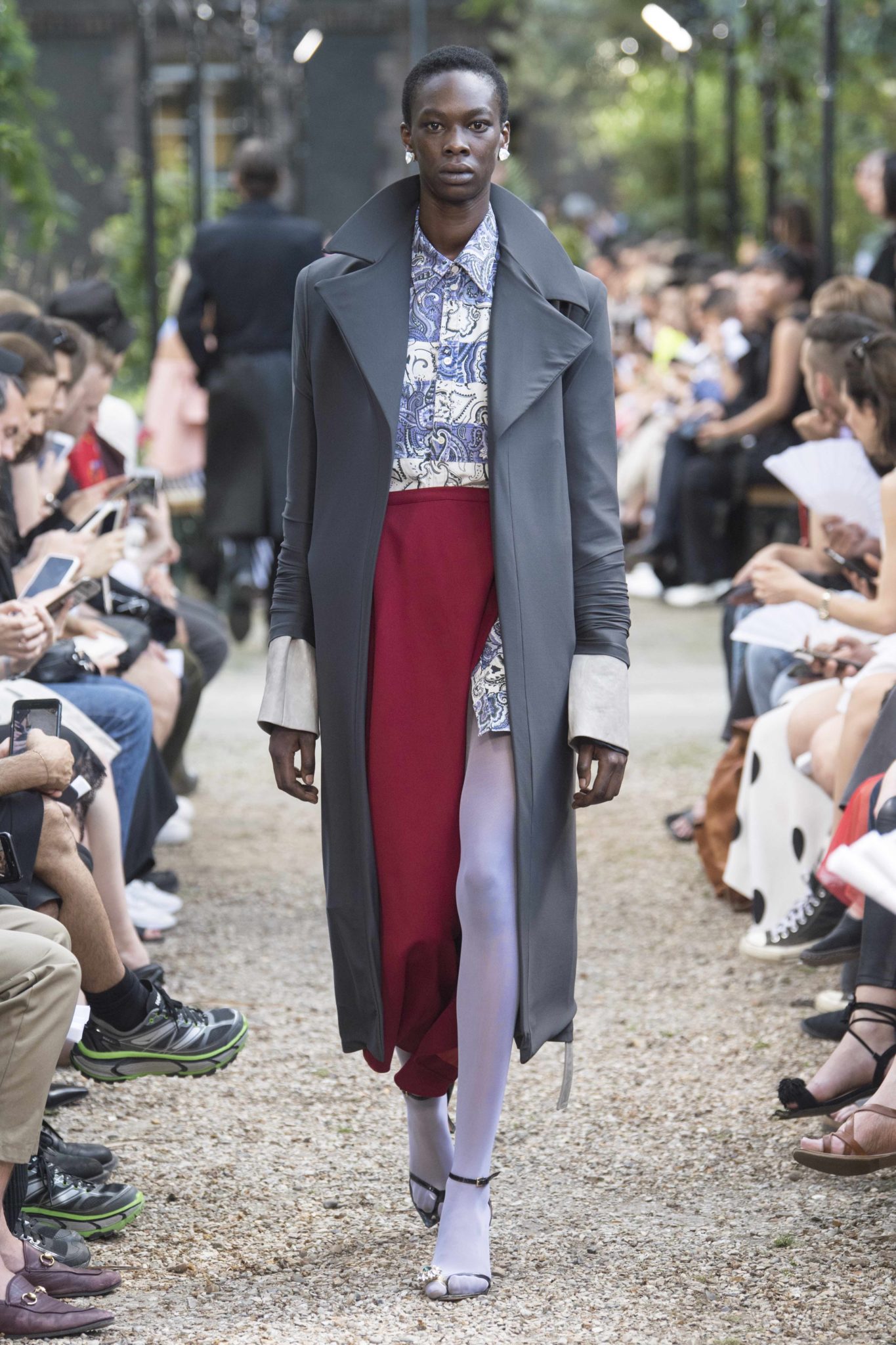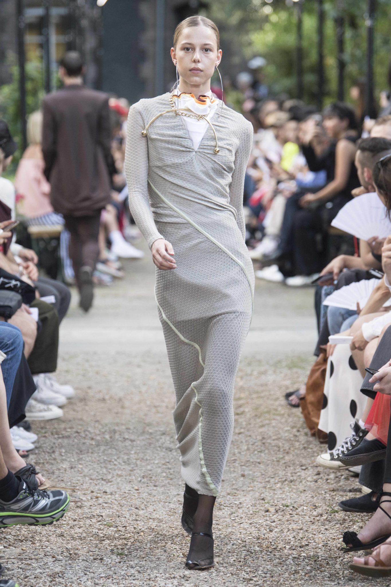 Cette saison, le directeur artistique Glenn Martens propose de nouvelles silhouettes en enveloppant des blazers, manteaux, hoodies, bodys et mini-robes sous des membranes amovibles de nylon et lycra. La superposition, qui rappelle les travaux de l’artiste Christo, agit à la fois comme élément de protection et de styling.