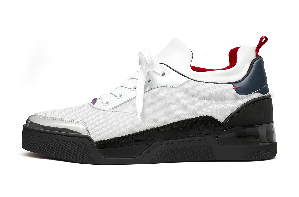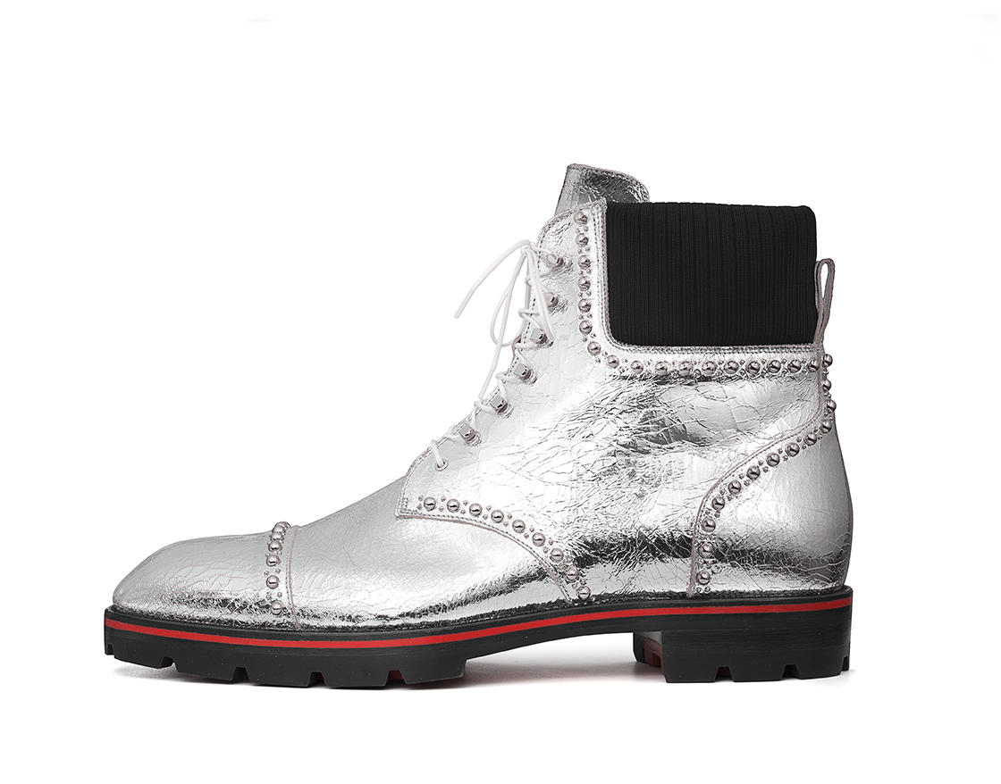 Cette saison, la collaboration avec Christian Louboutin voit leur sneaker iconique, rangers et boots Chelsea revisitées avec des détails métallisés et un travail sur la réflexion.