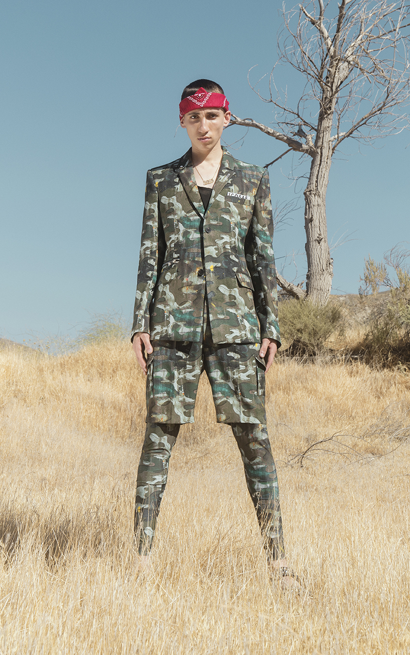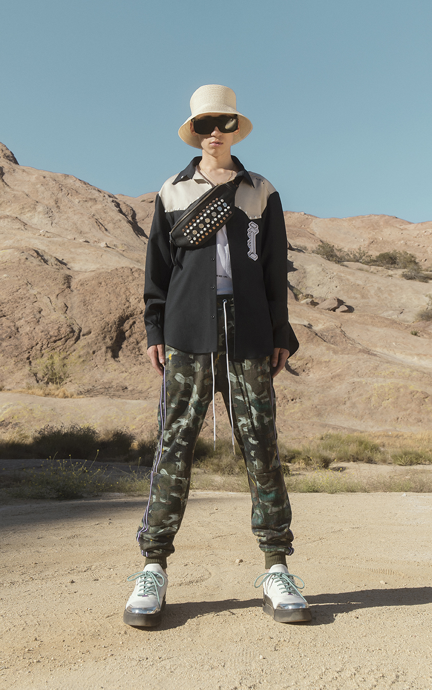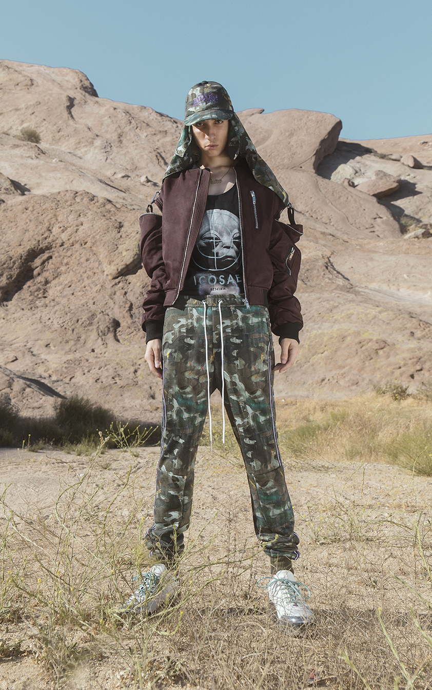 La collection traduit ce voyage avec des vestes tailleur manches bords franc, comme arrachées lors d’une altercation inattendue ou un imprimé camouflage peint à la main sur une parka de coton léger ou un pantalon de jogging –un dressing conçu pour l’expédition et l’aventure.
