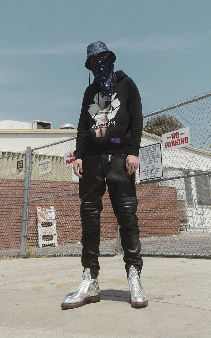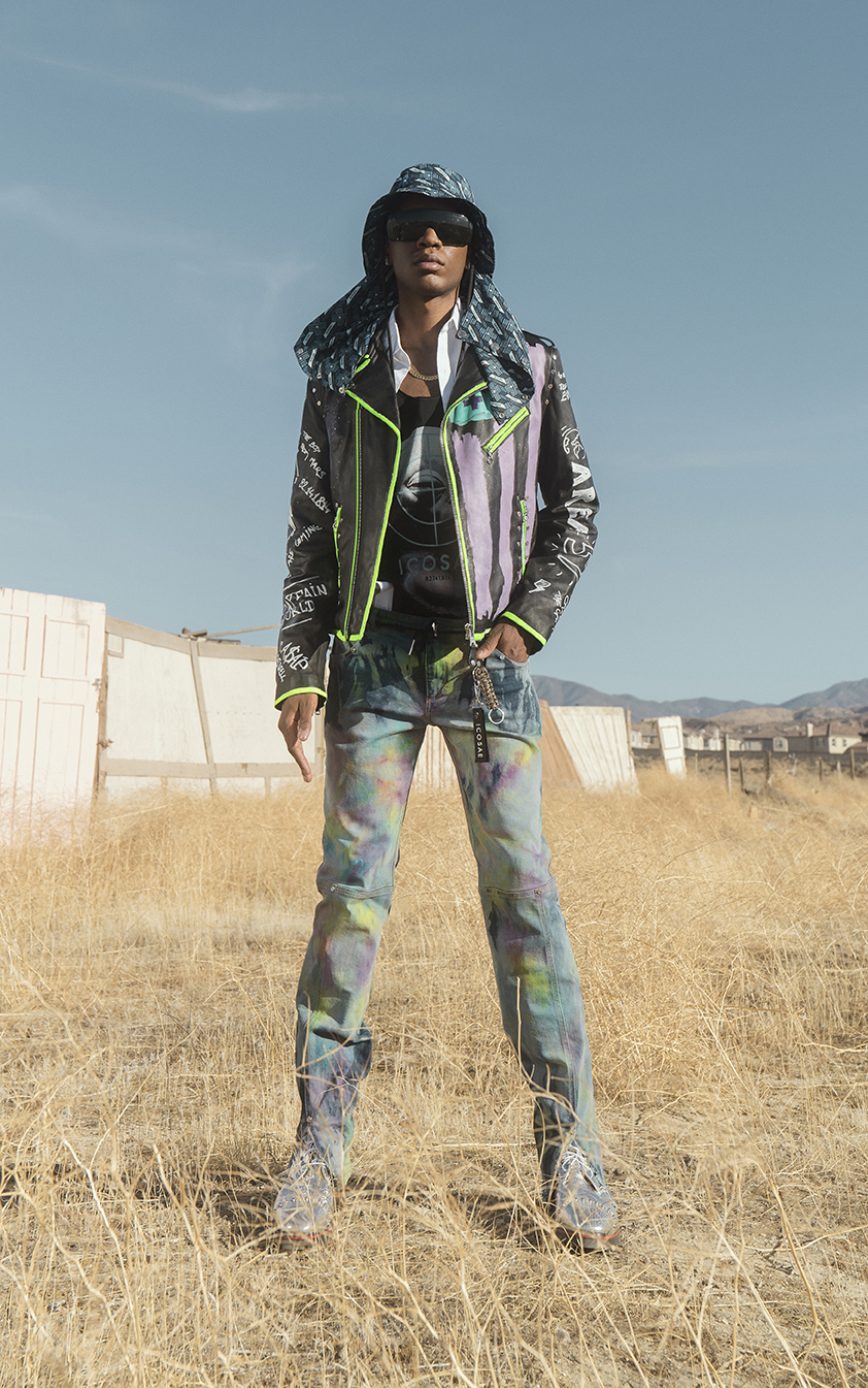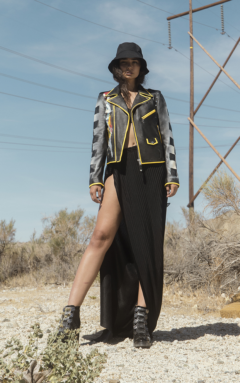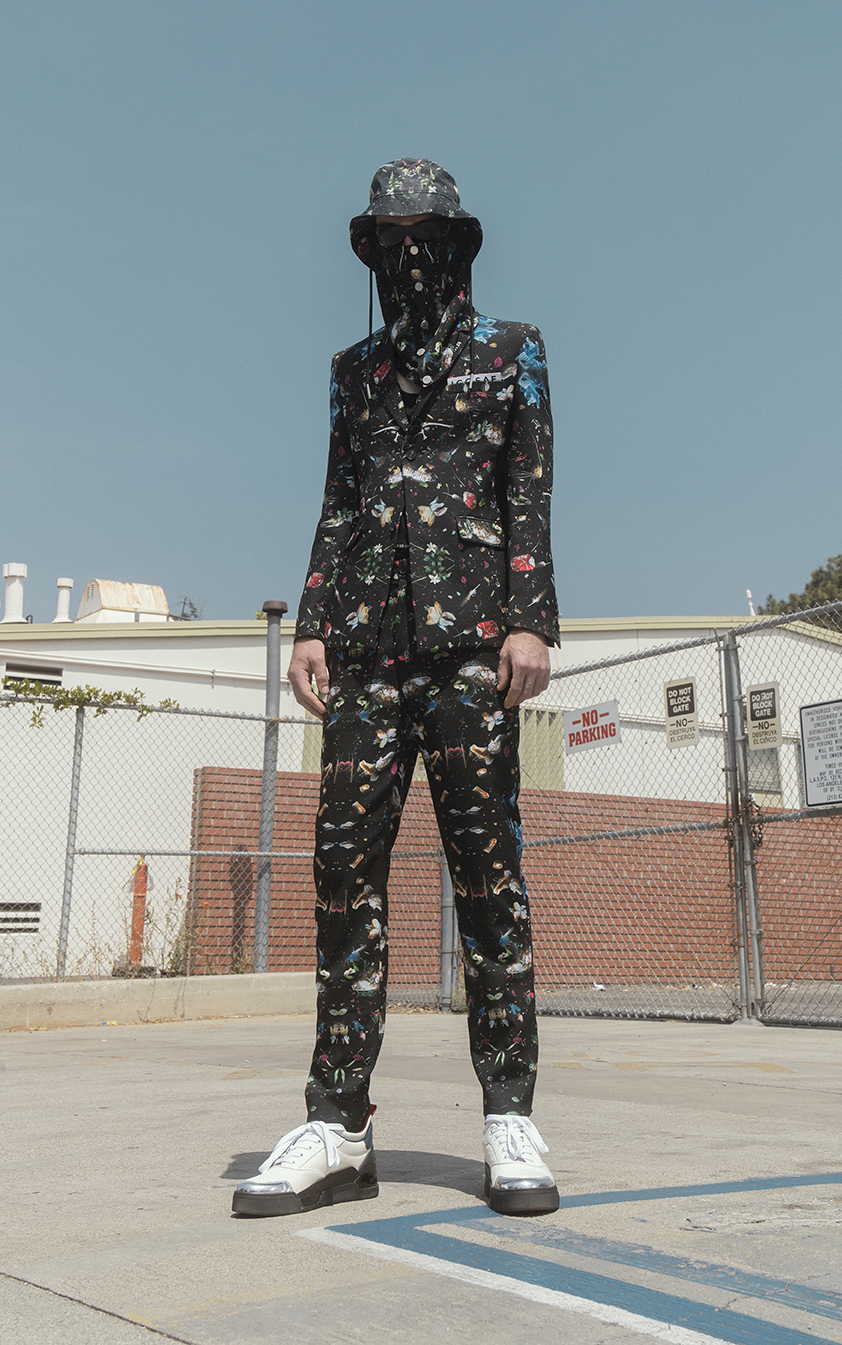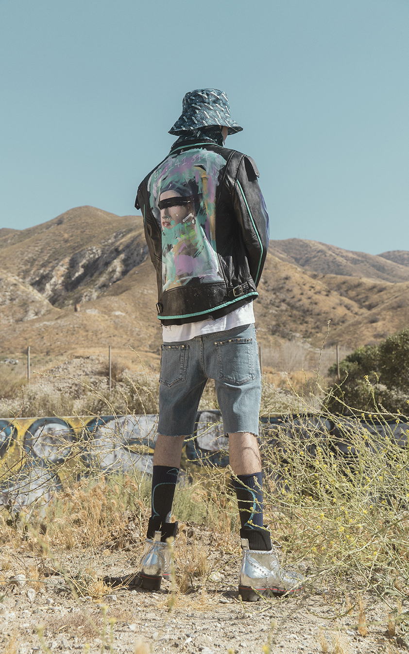 L’idée de recyclage et d’environnement est également un thème présent dans différentes parties de la collection. D’abord avec l’imprimé original «Galaxy Waste» conçu par Valentin : un trompe-l’œil all over qui semble floral de loin mais est en fait une succession de débris. La collaboration sur les perfecto en cuir avec la marque Schott se rapporte également à cela avec des pièces uniques peintes à la main.