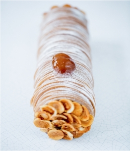 En mousse, en crème, en chips ou glacé le marron est ici décliné en une multitude de texture, contrebalancées par un biscuit de marrons torréfiés au praliné noisette le tout relevé par un gel citronné offrant un parfait équilibre au dessert.