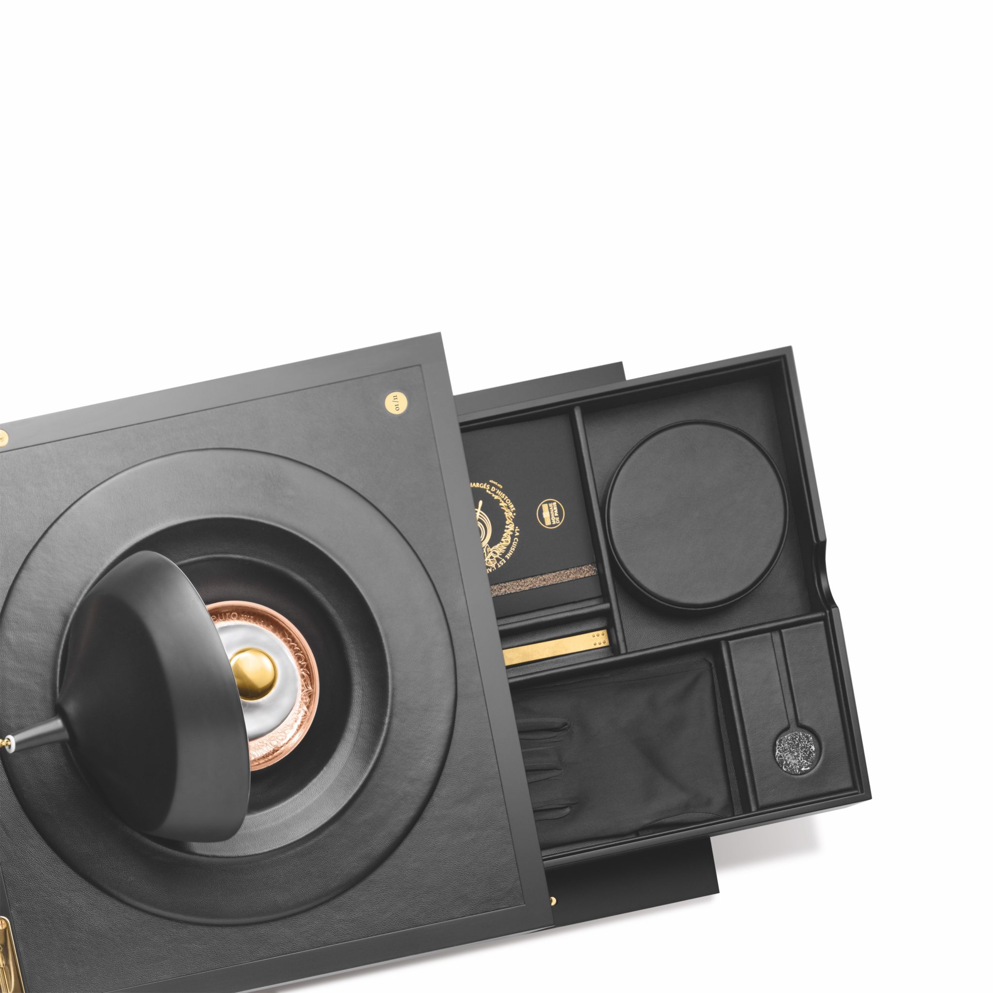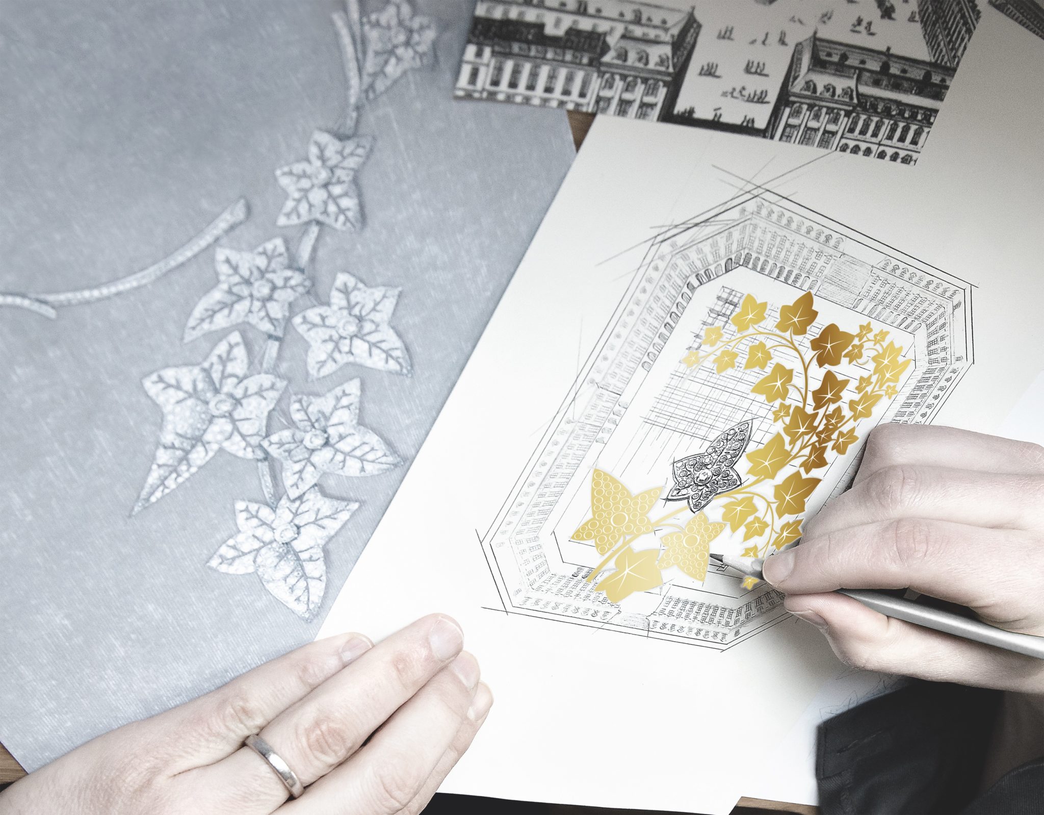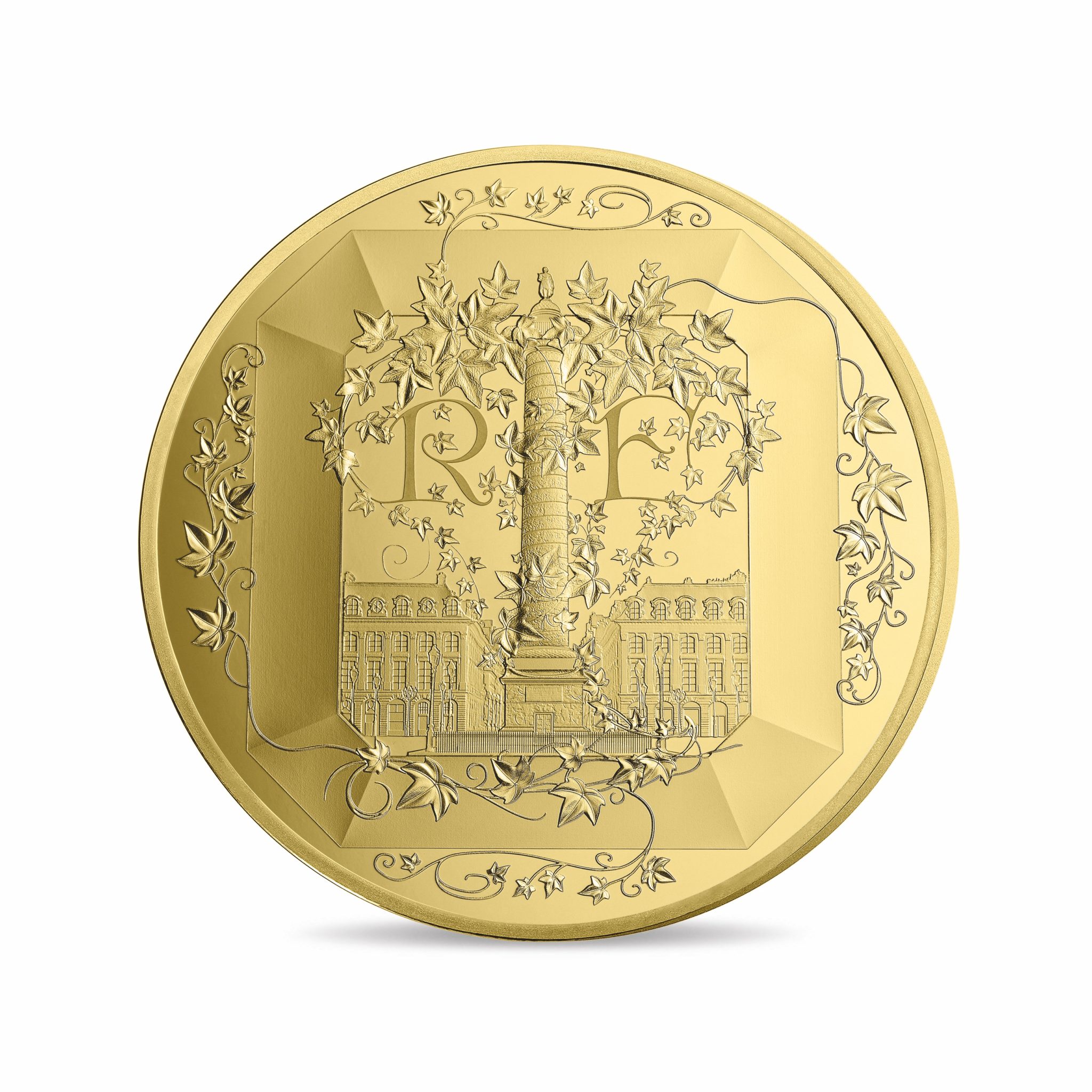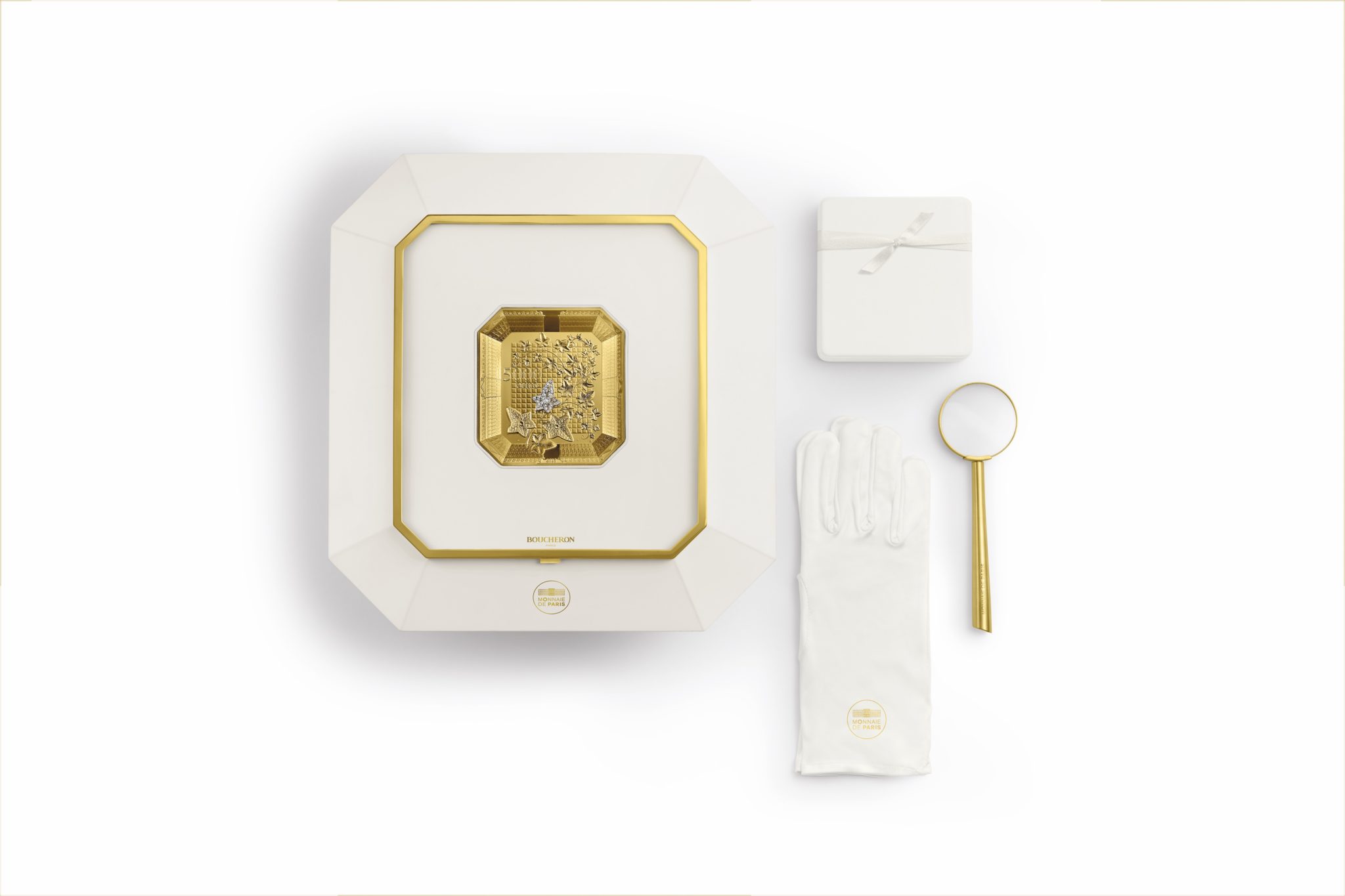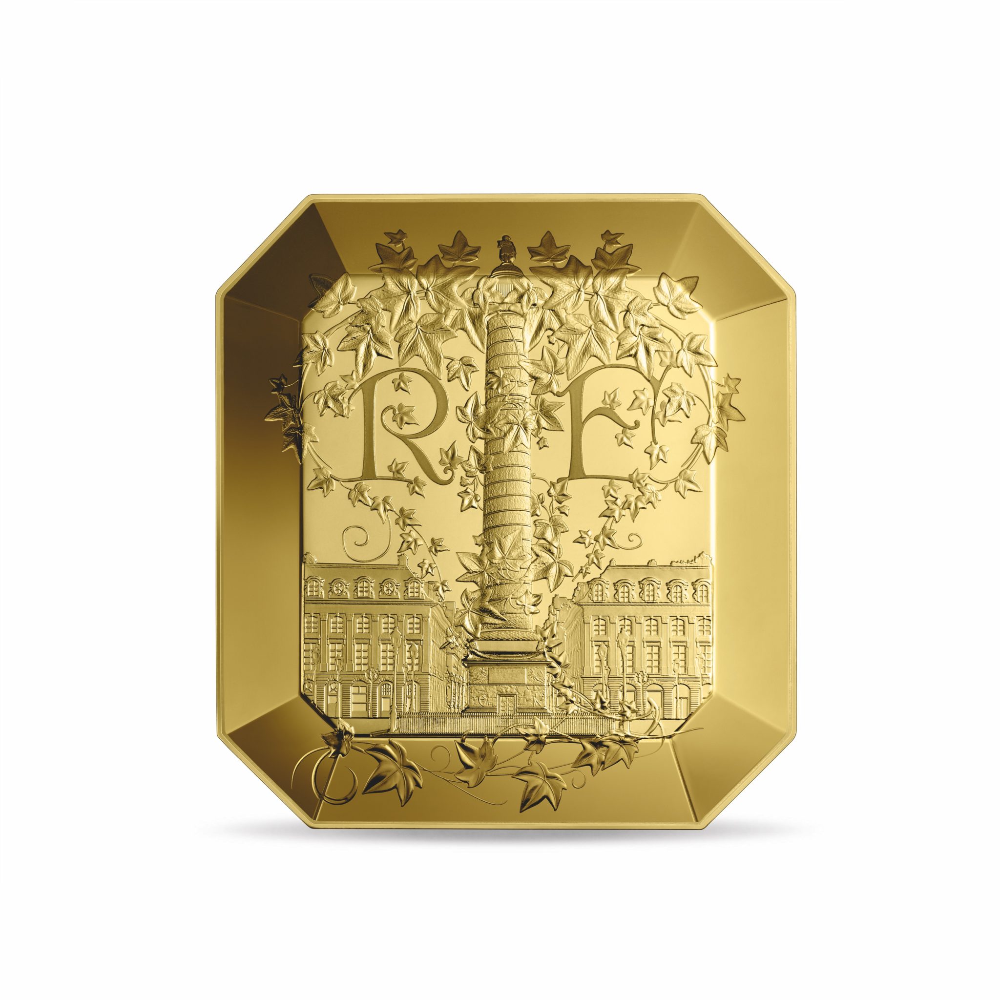Sur la pièce d’un kilo or, la place Vendôme, où Boucheron s’est installé en pionnier, devenue depuis le coeur de la joaillerie ; la colonne Vendôme, qui trône en son centre, et figure aujourd’hui sur le logo de la Maison ; le lierre, source d’inspiration constante chez Boucheron depuis ses débuts et enfin, les pavés parisiens, représentés par le motif iconique du clou de Paris.