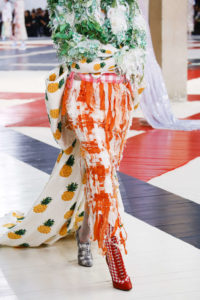 Bouches cousues. Les femmes ne sont plus que les mannequins qu’elles regardaient. Les défilés Thom Browne semblent s’inscrire dans la continuité de ceux de McQueen. Pour le dernier, on peut déceler une réponse au défilé Hiver 2008-2009 « Horn Of Plenty » .Celui de la démence du capitalisme post-crise. Accumulant robes pieds-de-poules, et rouge à lèvre outrageusement rouge sang, les mannequins tournent autour d’une décharge d’objets. Une critique acerbe et magnifique. 2018 : Thom Browne. Dix ans plus tard, les femmes restent entravées dans des vestes aux propositions extrêmes et certaines sont de véritables salades de fruits. Prête a être dévorées. Dans un décor avec petits nains, baleines, et petits chiens, la petite sirène a vomi les illusions Disney. Elle sort du film, devenue une bourgeoise dont les chaussures dépareillées, et vertigineuses témoignent d’un confort qui ne fait plus illusion. La beauté des magazines ne suffit plus pour générer l’illusion du vertige. La philosophie du vide, contre-balancé par des tenues surchargées. Un contraste qui donne un défile spectaculaire.