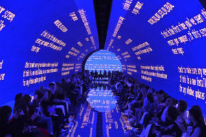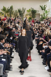 Pour certain : tout est accessible. Alors qu’est-ce qui enivre ? Le défilé Balenciaga simule la perte de gravité avec un tunnel rempli d’écran LED. Un tourbillon de chao dans lequel Gvesalia présente un défilé plus épuré. Moins de sac Ikea et Tati : le temps de la récupération de la culture populaire pour faire rêver les riches touche à sa fin ? À la place ce défilé rend un bel hommage à l’esprit moderne de Cristobal Balenciaga qui inventa le Gazar. Un luxe réservé à une élite.