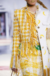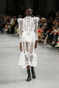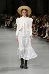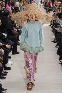 Entre fond sous-marins, nature prospère, robes victoriennes dans champs de pailles dorés , et les couleurs sorbets- cette saison contre-balance le trop plein de macarons sucrés par des matières brutes (du lin, au jean), des coupes qui marquent les épaules et des bottines noires qui empêchent de conclure à un discours de l’idéal. La magie de la mode réside dans son ambivalence.
