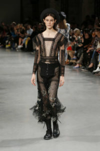 « Picnic at Hanging Rock » : un livre de Joan Lindsay qui laisse place en 1975 à un film de Peter Weir. L’histoire : celle de jeunes filles, à la beauté énigmatique, et au spleen incompréhensible. Une existence ou les illusions se perdent, et ou le sens à fouttu le camp.. Coincées dans des idéaux, ce sont les filles des films de Coppola. Habillées de couleurs pastels, le regard vide : elles attirent, mais sont attirées par le vide. Pour la maison Galliano , Gaytten livre une collection de robes blanches, pleines de broderies délicates. Pourtant il ne se noie pas dans la niaiserie d’une offre fleurie : les boots militaires et la dose punk rappellent que les idéaux ne sont que des idéaux, et que la mode n’est pas là pour avoir un discours polissé. Le tourmant derrière la beauté : soit un bel hommage à Galliano.