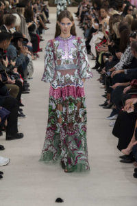Des robes brodées de sequins, de la dentelle, des imprimés et des plumes : l’élégante sort pour arpenter les bals mondains. Une série mode qui s’imprimerait parfaitement dans un Vogue années soixantes. La célébration du glamour anime la maison Valentino dont de nombreux modèles sont plus coutures que prêt à-porter. Une plongée dans les vitrines d’un temps perdu. La nostalgie: voila une composante qui provoque à coup sûr le vertige. Une collection ou les chapeaux ne sont plus de plumes, mais de paille. Une collection qui s’ouvre sur de magnifiques robes NOIRES. En 2018, les vêtements ne se contemplent plus derrière les mêmes vitrines.Ils sont enfermés dans des diaporamas qui chargent lentement sur nos ordinateurs trop lents- ou rapidement sur le dernier iPhone. Mais déjà une autre collection est mise en ligne. C’est le drame de ces jolies plumes, elles s’envolent.