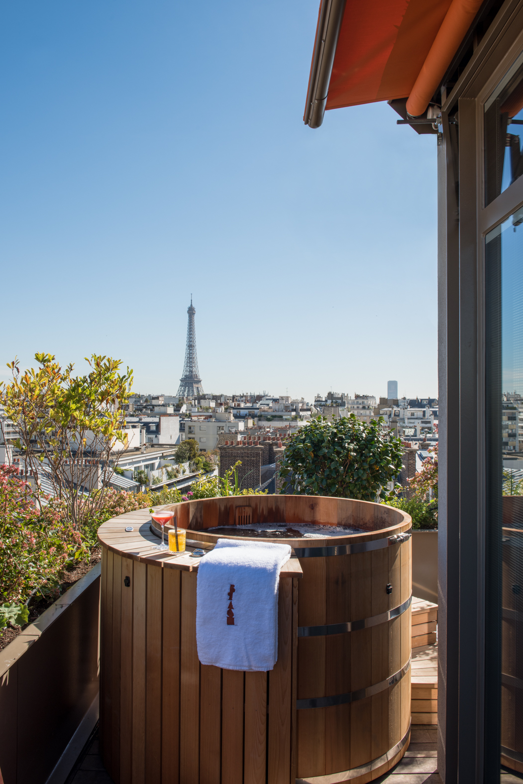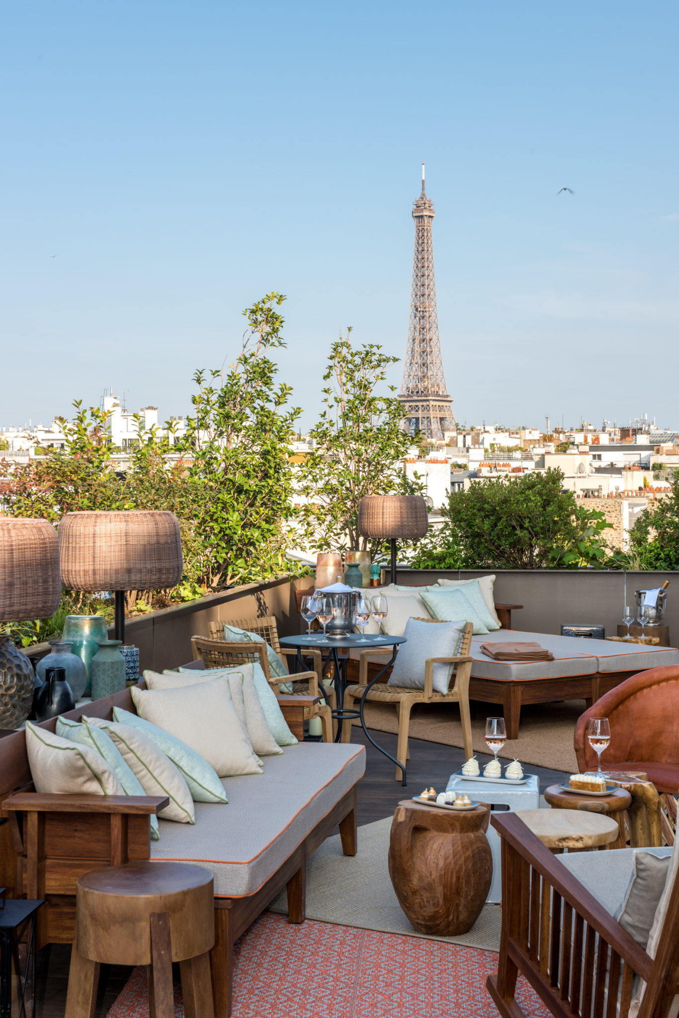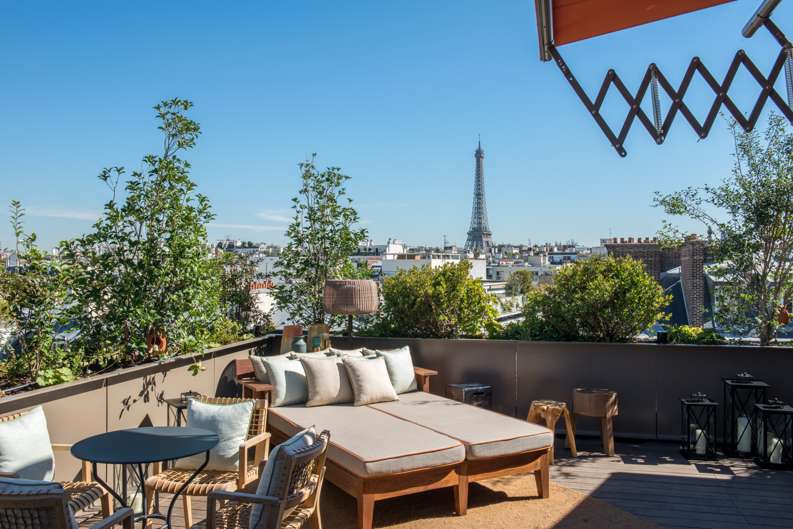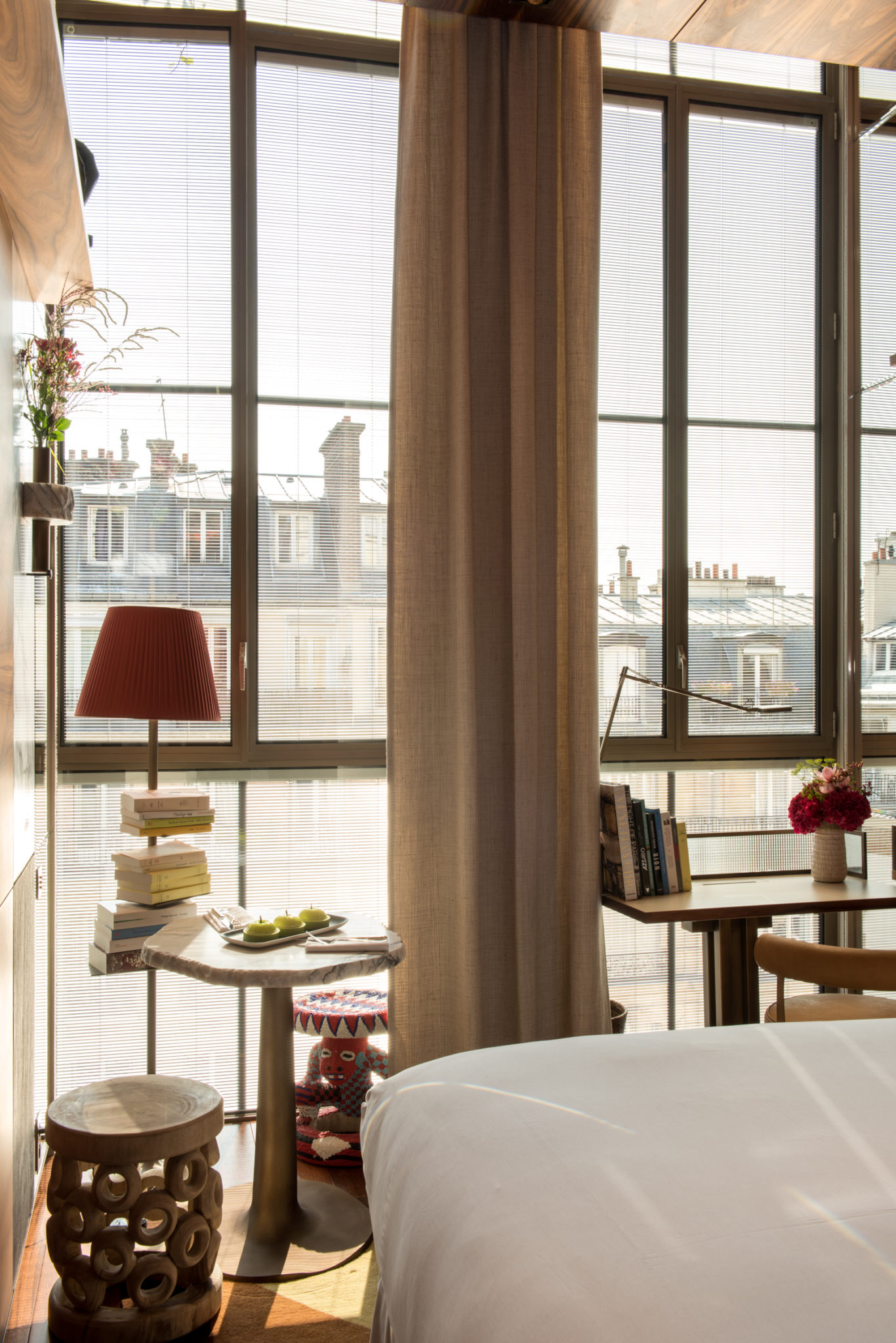« Brach n’est pas un hôtel, c’est un lieu de vie et de culture unique où mystères poétiques et surprises fertiles nourrissent l’imaginaire. Sensuel et rigoureux, minimal et hétéroclite, il y règne un romantisme brut et moderniste que réchauffent des influences multiculturelles d’Afrique, d’Asie et d’Amérique du Sud. C’est un lieu insolite qui invite à l’exploration et au voyage. » Philippe Starck Le lobby est une véritable bulle d’intimité dans ce lieu ouvert et accueillant. Situé au premier étage, dans un espace réservé aux résidents de l’hôtel, il permet l’accueil des hôtes en toute discrétion. L’ambiance est chaleureuse et éclectique, une tribu de totems, de sculptures et de surprises poétiques s’animent et prennent vie entre le plafond habillé d’une toile originale de l’artiste Ara Starck et le tapis qui la reflète tel un miroir. BRACH est à l’image de ses résidents: unique. Toutes les chambres et suites de l’hôtel sont différentes, adaptées aux envies et aux besoins de chacun. Du premier au sixième étage : 52 chambres de 24 à 42 m 2 lumineuses, habillées de matières nobles. Aux cinquième et sixième étages de Brach : 7 suites de 60 à 200 m 2. Toutes dotées d’une terrasse avec bain norvégien, l’une d’entre elles abrite aussi un jacuzzi… Dans un décor de bois, de cuir, de verre et de pierre, elles s’ouvrent sur des terrasses arborées dominant Paris : vue à 180° sur les toits et la ville, et sur la Tour Eiffel pour certaines. L’accès exclusif au potager en rooftop leur est réservé. Dans les chambres et les suites, un mini concept store remplace le mini bar et la sélection de livres et de romans est renouvelée à chaque rentrée littéraire. Les hôtes du Brach ont accès au club de sport, à la piscine, aux cours collectifs…