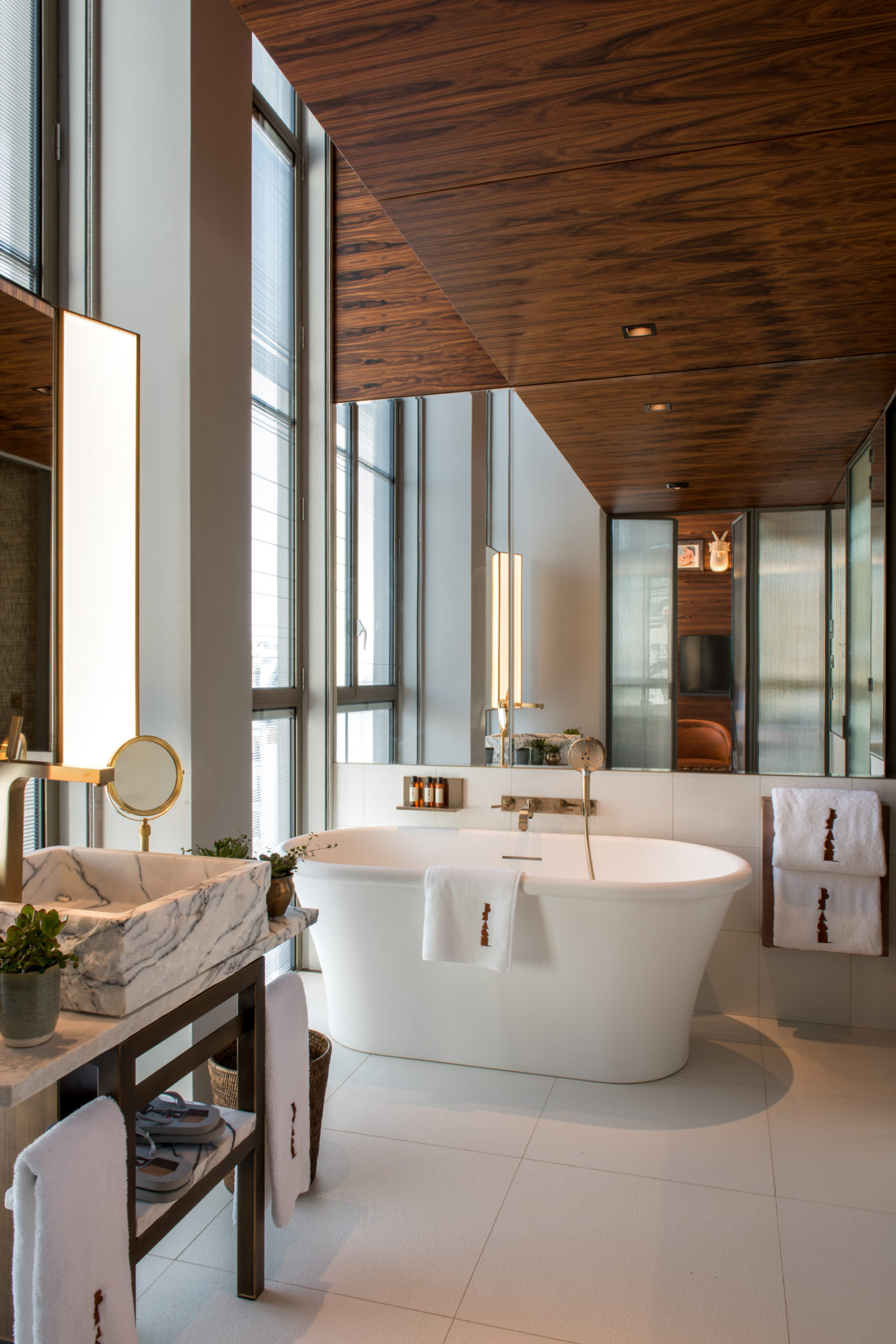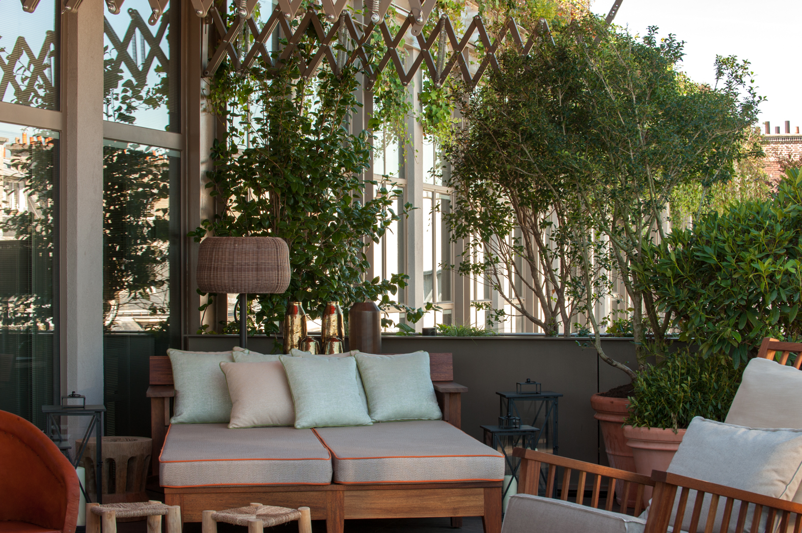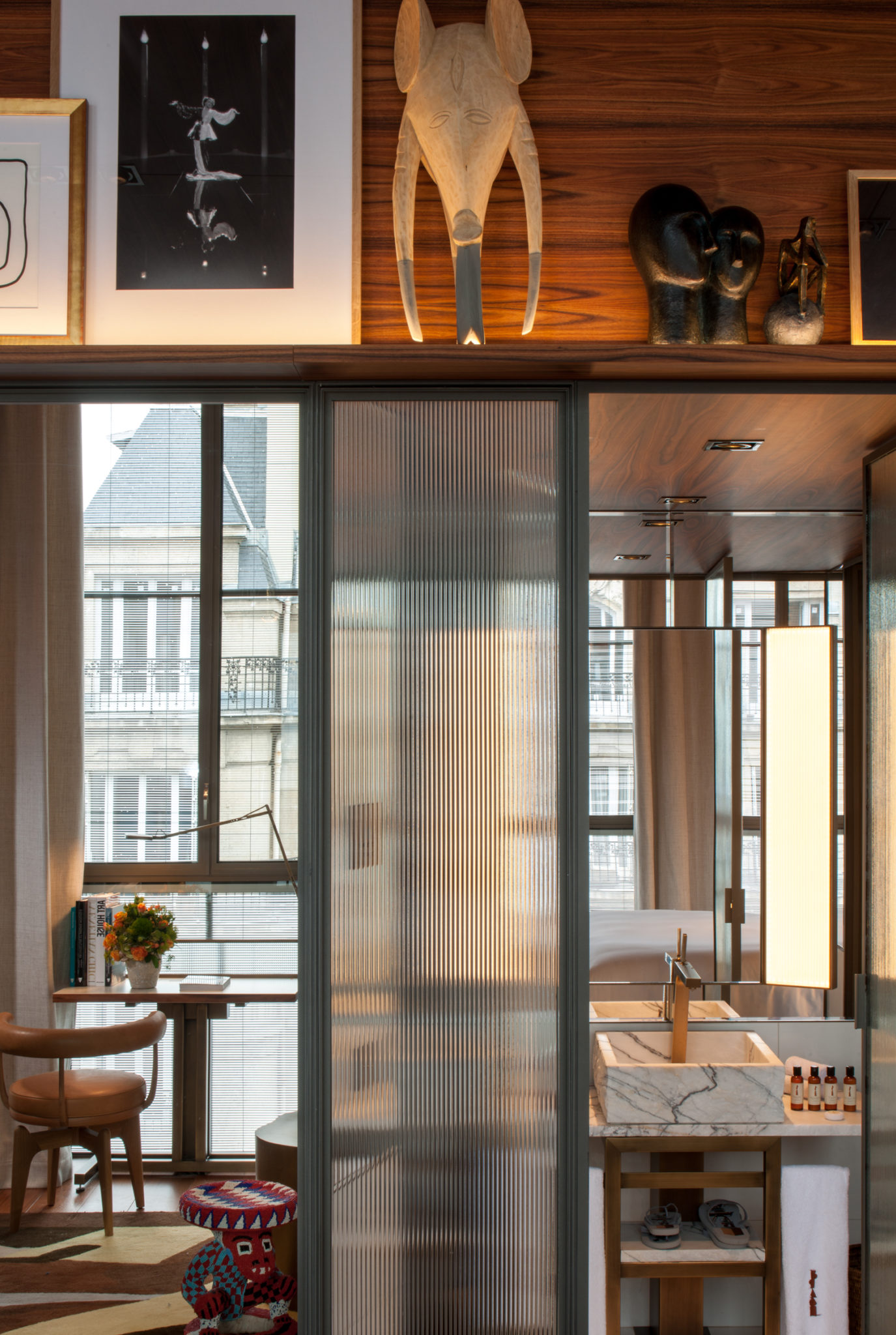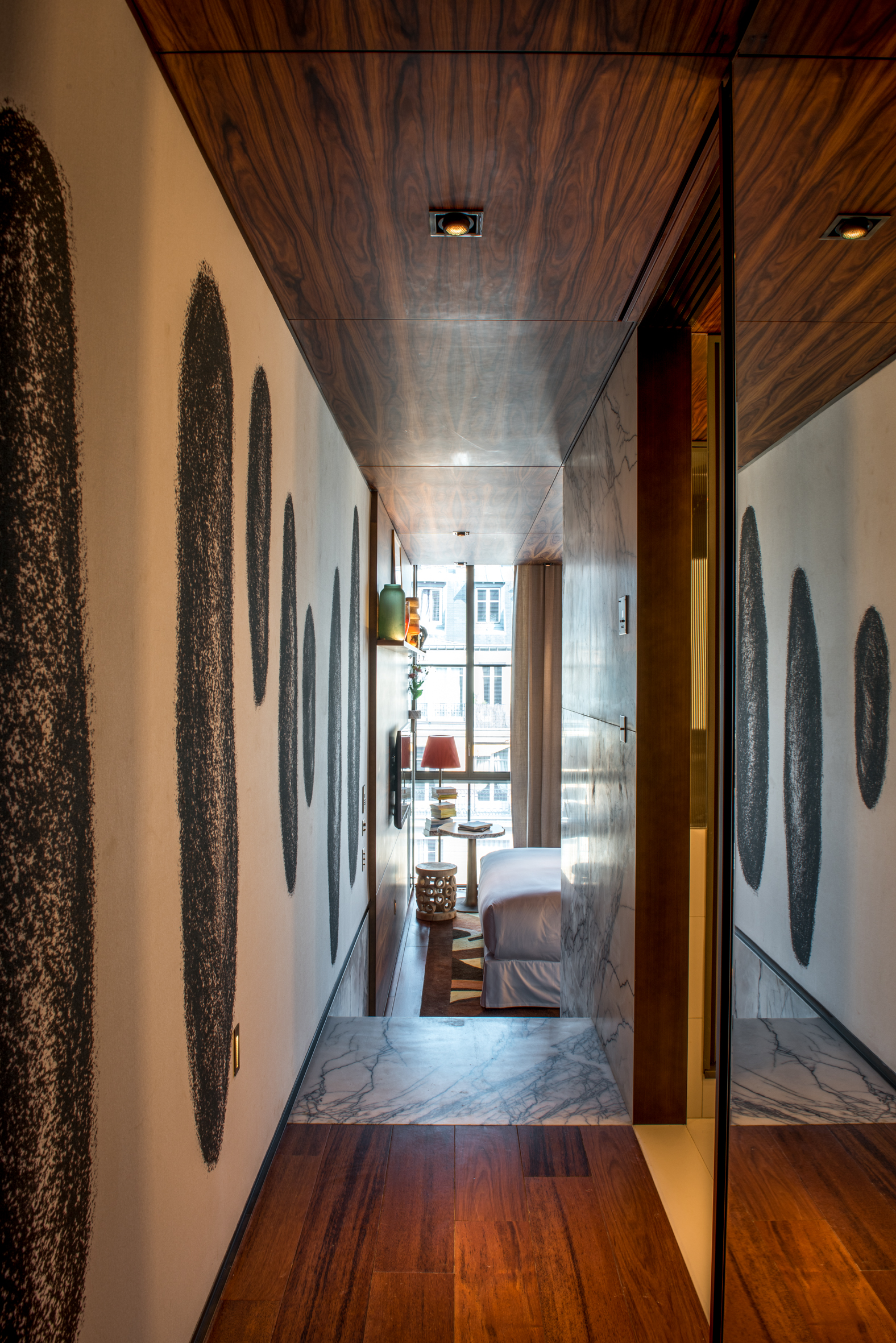 « Brach n’est pas un hôtel, c’est un lieu de vie et de culture unique où mystères poétiques et surprises fertiles nourrissent l’imaginaire. Sensuel et rigoureux, minimal et hétéroclite, il y règne un romantisme brut et moderniste que réchauffent des influences multiculturelles d’Afrique, d’Asie et d’Amérique du Sud. C’est un lieu insolite qui invite à l’exploration et au voyage. » Philippe Starck Le lobby est une véritable bulle d’intimité dans ce lieu ouvert et accueillant. Situé au premier étage, dans un espace réservé aux résidents de l’hôtel, il permet l’accueil des hôtes en toute discrétion. L’ambiance est chaleureuse et éclectique, une tribu de totems, de sculptures et de surprises poétiques s’animent et prennent vie entre le plafond habillé d’une toile originale de l’artiste Ara Starck et le tapis qui la reflète tel un miroir. BRACH est à l’image de ses résidents: unique. Toutes les chambres et suites de l’hôtel sont différentes, adaptées aux envies et aux besoins de chacun. Du premier au sixième étage : 52 chambres de 24 à 42 m 2 lumineuses, habillées de matières nobles. Aux cinquième et sixième étages de Brach : 7 suites de 60 à 200 m 2. Toutes dotées d’une terrasse avec bain norvégien, l’une d’entre elles abrite aussi un jacuzzi… Dans un décor de bois, de cuir, de verre et de pierre, elles s’ouvrent sur des terrasses arborées dominant Paris : vue à 180° sur les toits et la ville, et sur la Tour Eiffel pour certaines. L’accès exclusif au potager en rooftop leur est réservé. Dans les chambres et les suites, un mini concept store remplace le mini bar et la sélection de livres et de romans est renouvelée à chaque rentrée littéraire. Les hôtes du Brach ont accès au club de sport, à la piscine, aux cours collectifs…