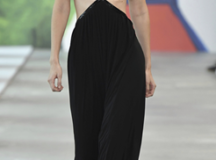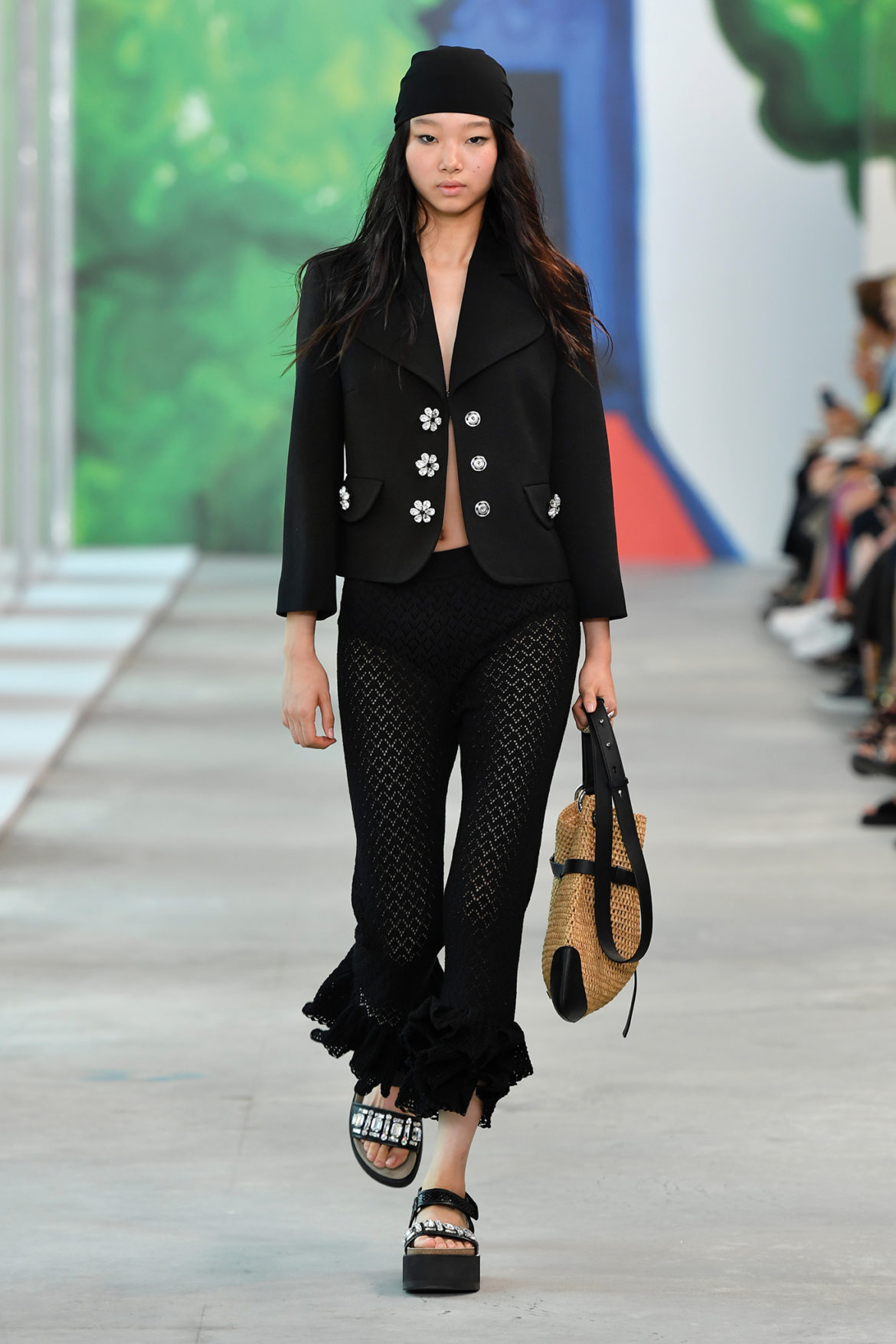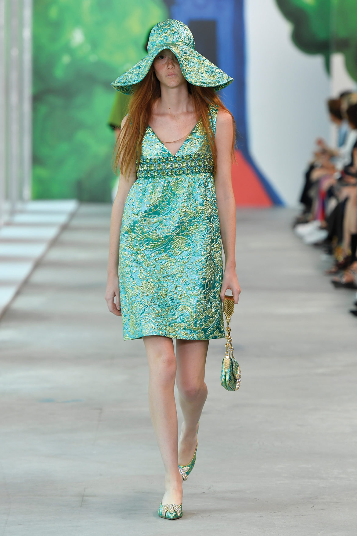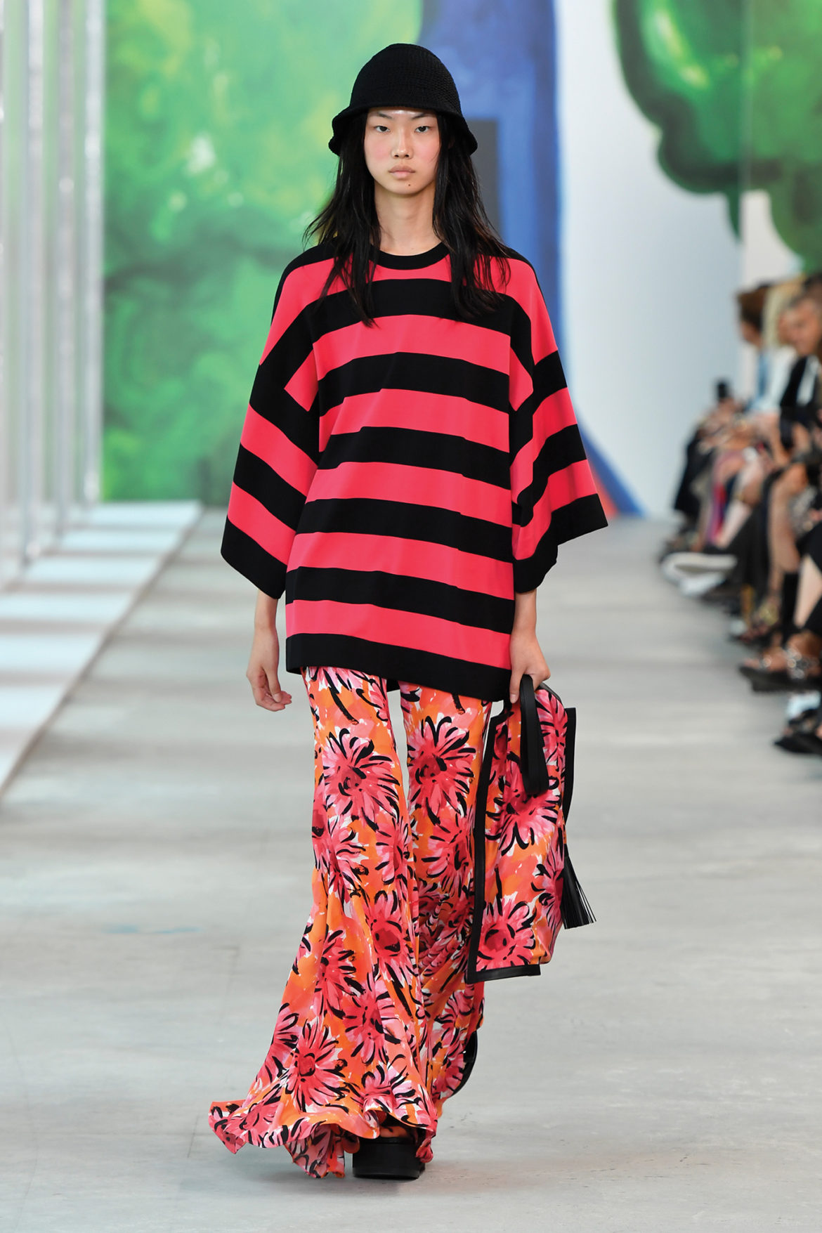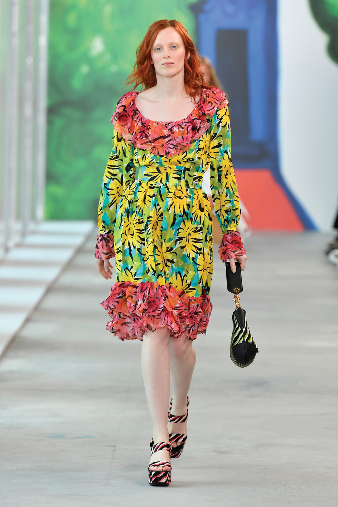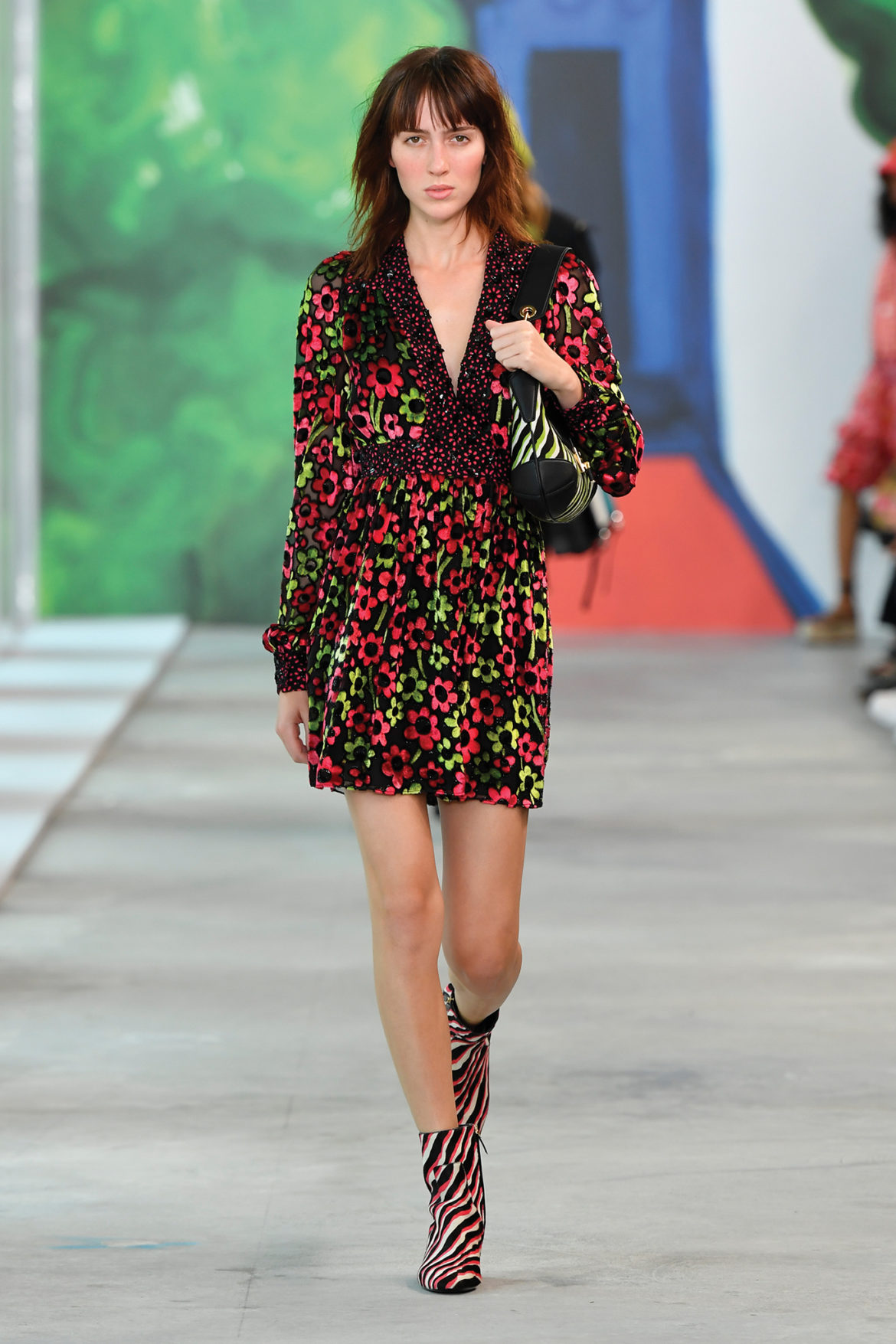 Zimpel, originally from Perth Western Australia, previously worked as an Art Director for Australian Vogue and American Vogue before turning her eye towards painting and drawing. Her original artwork featured prominently at this morning’s runway show—guests were able to spend time in a gallery space featuring 22 pieces of work before taking their seats for the show, which were also wrapped in Zimpel’s work.