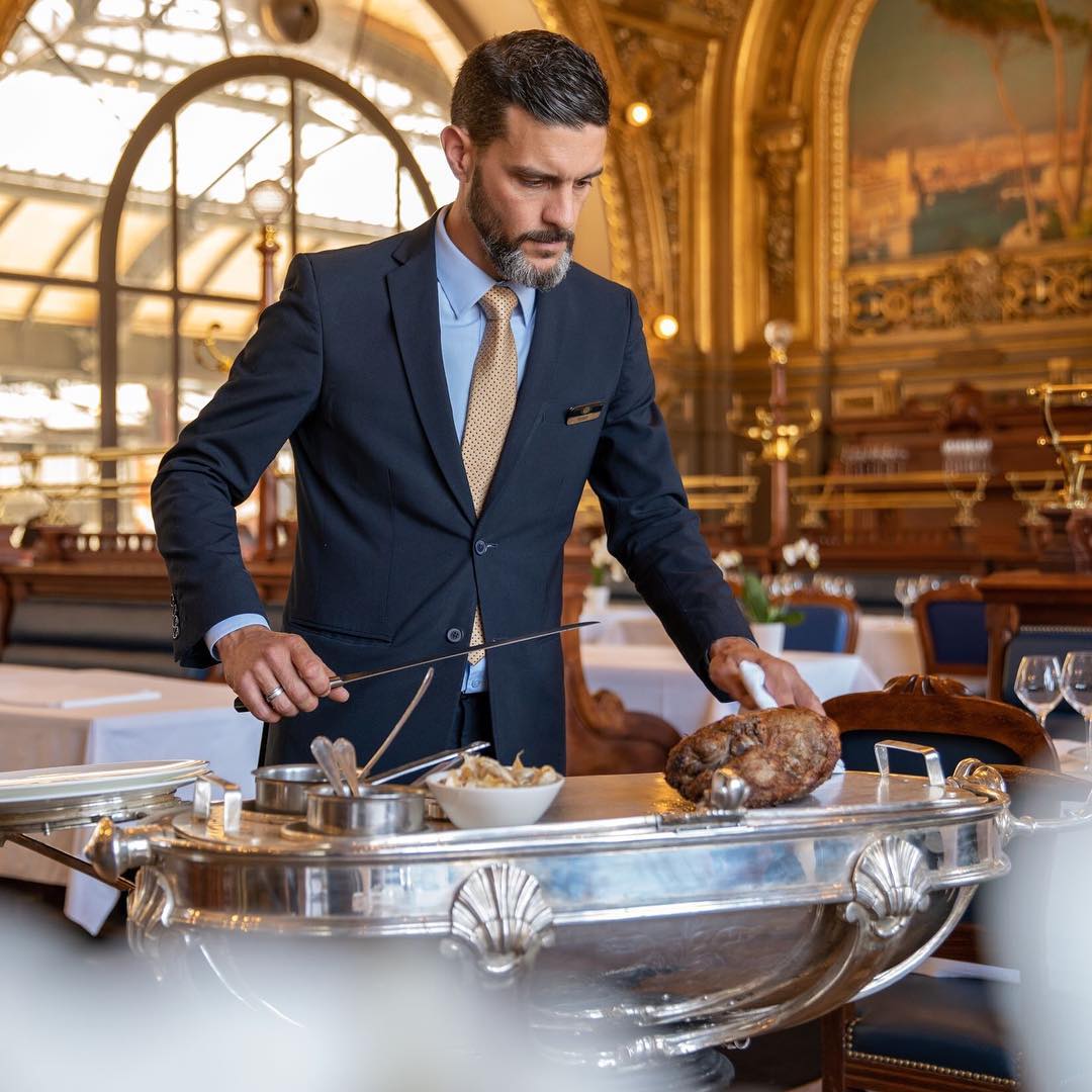 Mais le spectacle est aussi en salle : le Groom du Train Bleu est de retour. Personnage historique, il reprend son rôle d’antan, aide les voyageurs à monter leur valise et accueille les convives d’un sourire. Régulièrement, il traverse les salles et ponctue le voyage des clients d’anecdotes et d’informations sur ce lieu mythique, et annonce même certains trains !