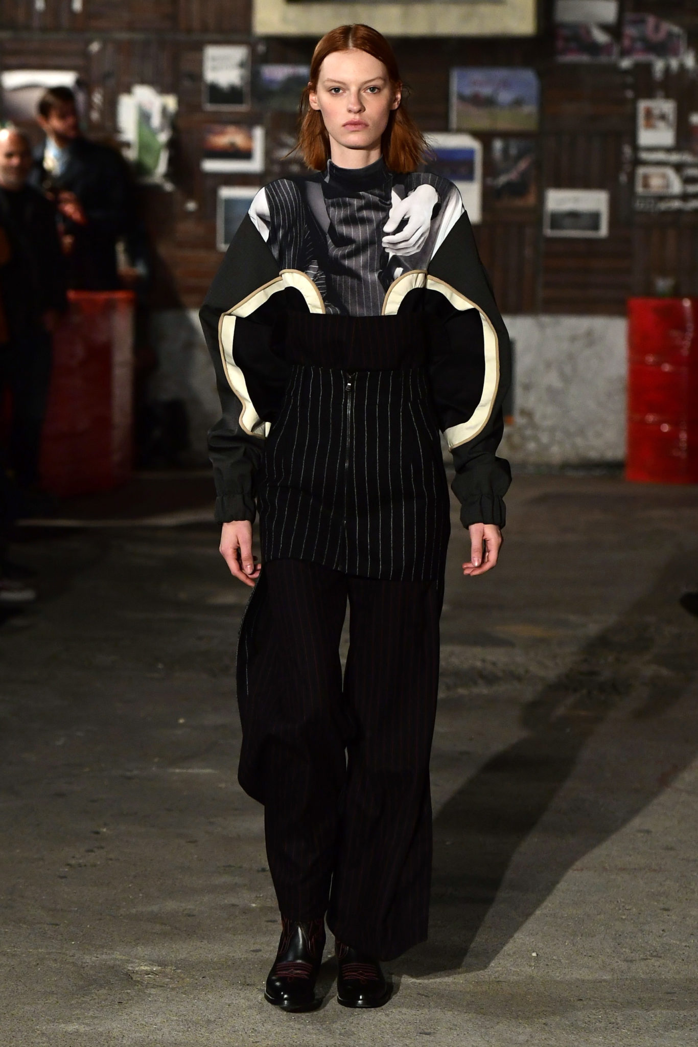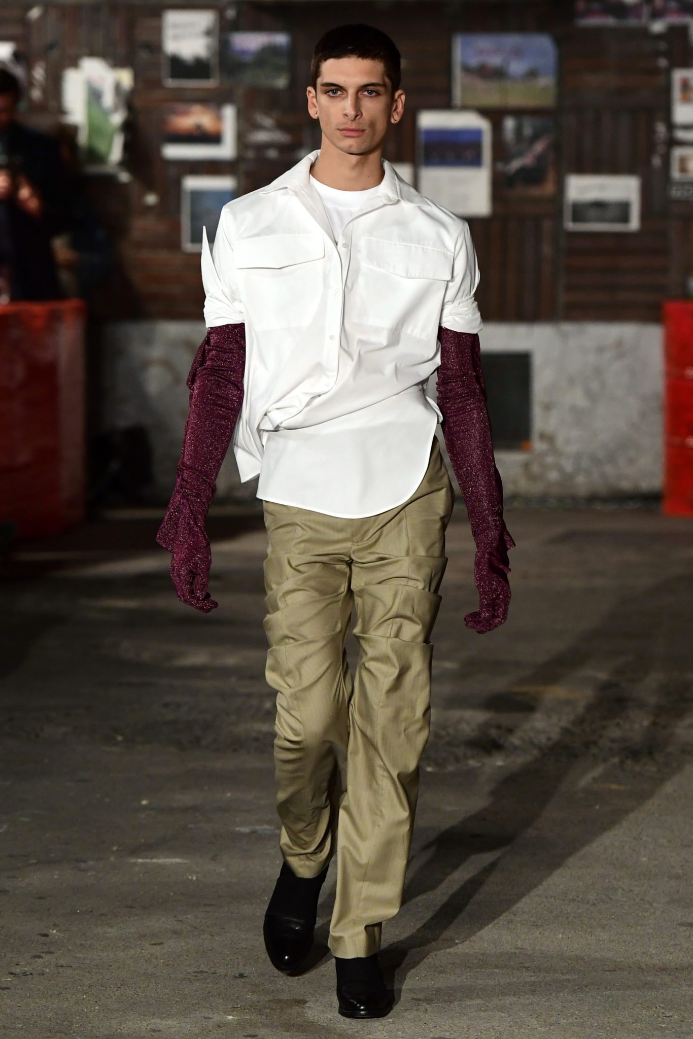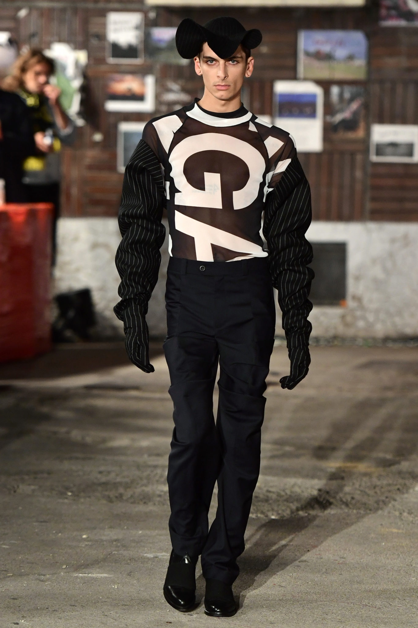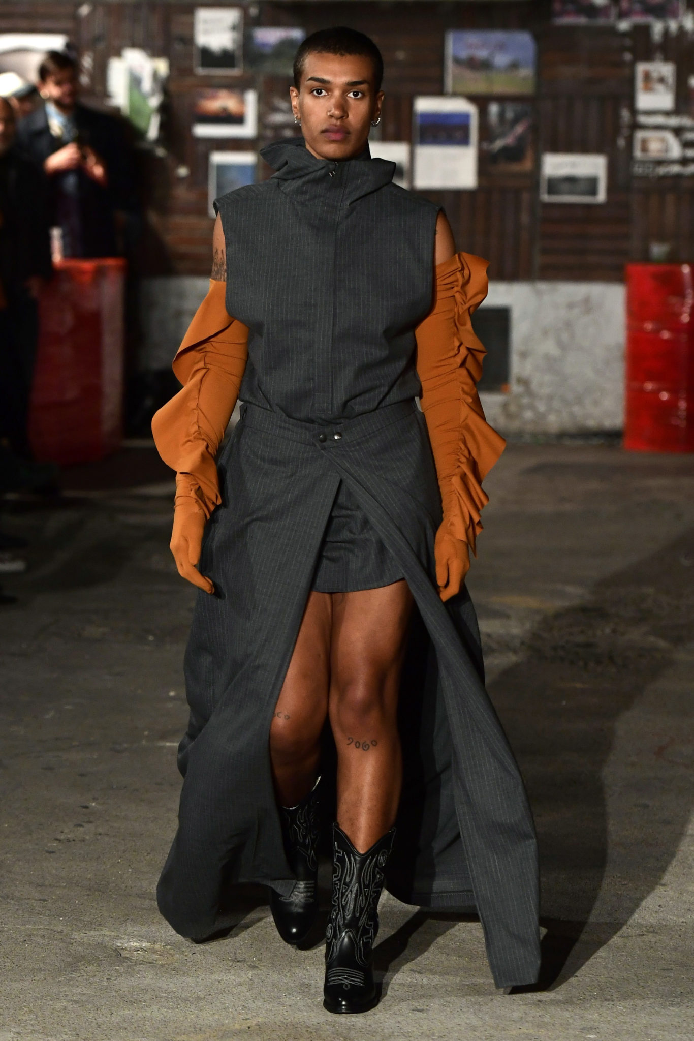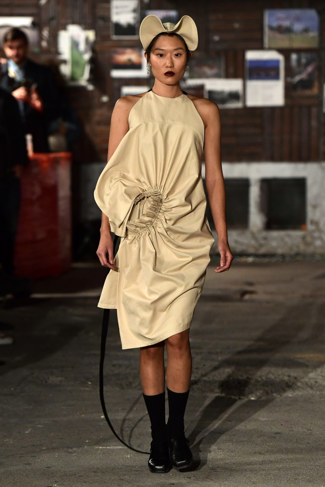 Entre décalage et réalisme, les silhouettes GAMUT juxtaposent des éléments d’une grande sobriété, d’une grande rigueur, avec des gants à paillettes ou des casquettes à visières ultra-larges. Formés à l’école belge, les membres de GAMUT cherchent à faire glisser les codes du vêtement traditionnel, du gilet d’homme à la robe de soirée, du manteau tailleur à la chemise blanche, en passant par la parka technique et le pull en laine rustique.