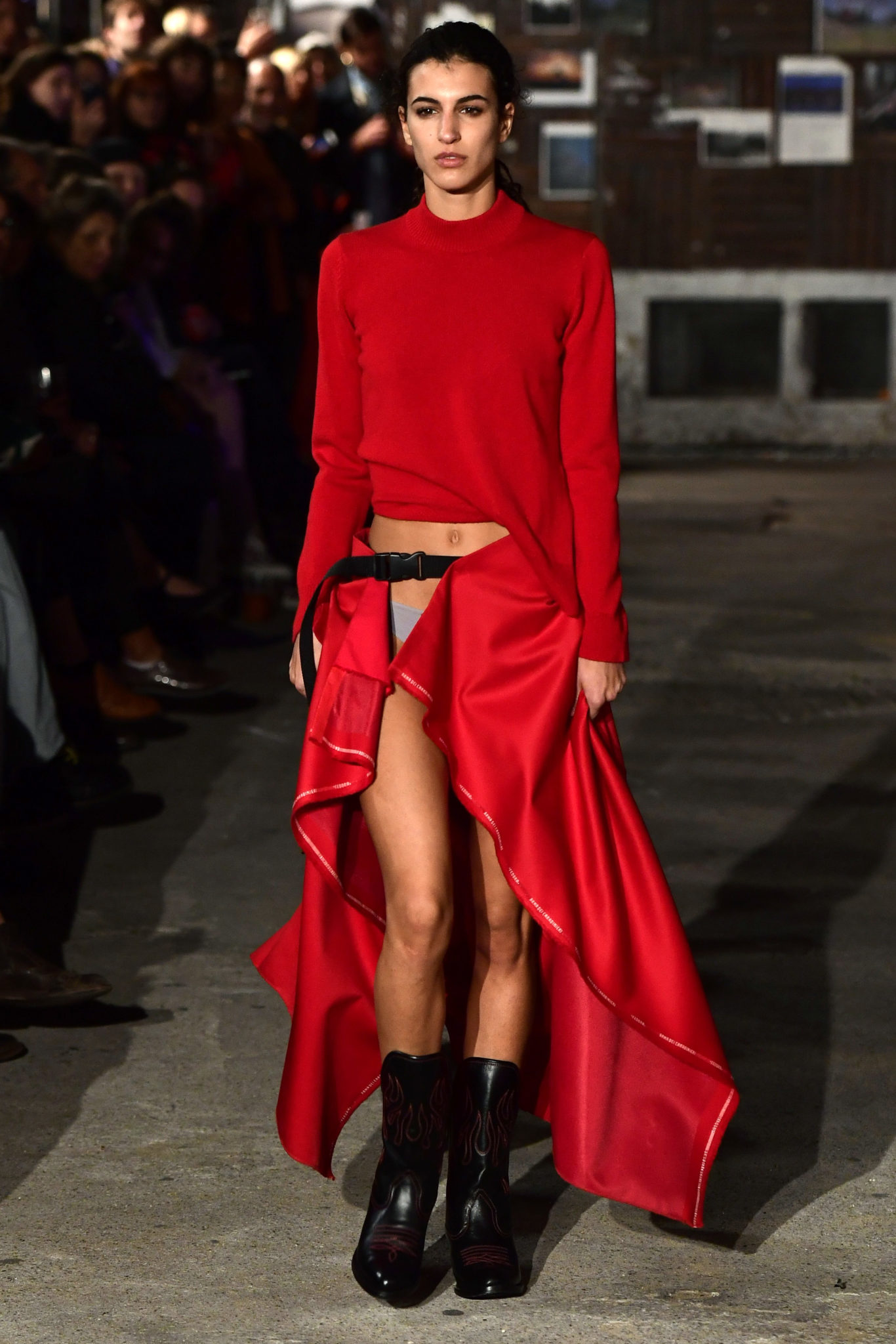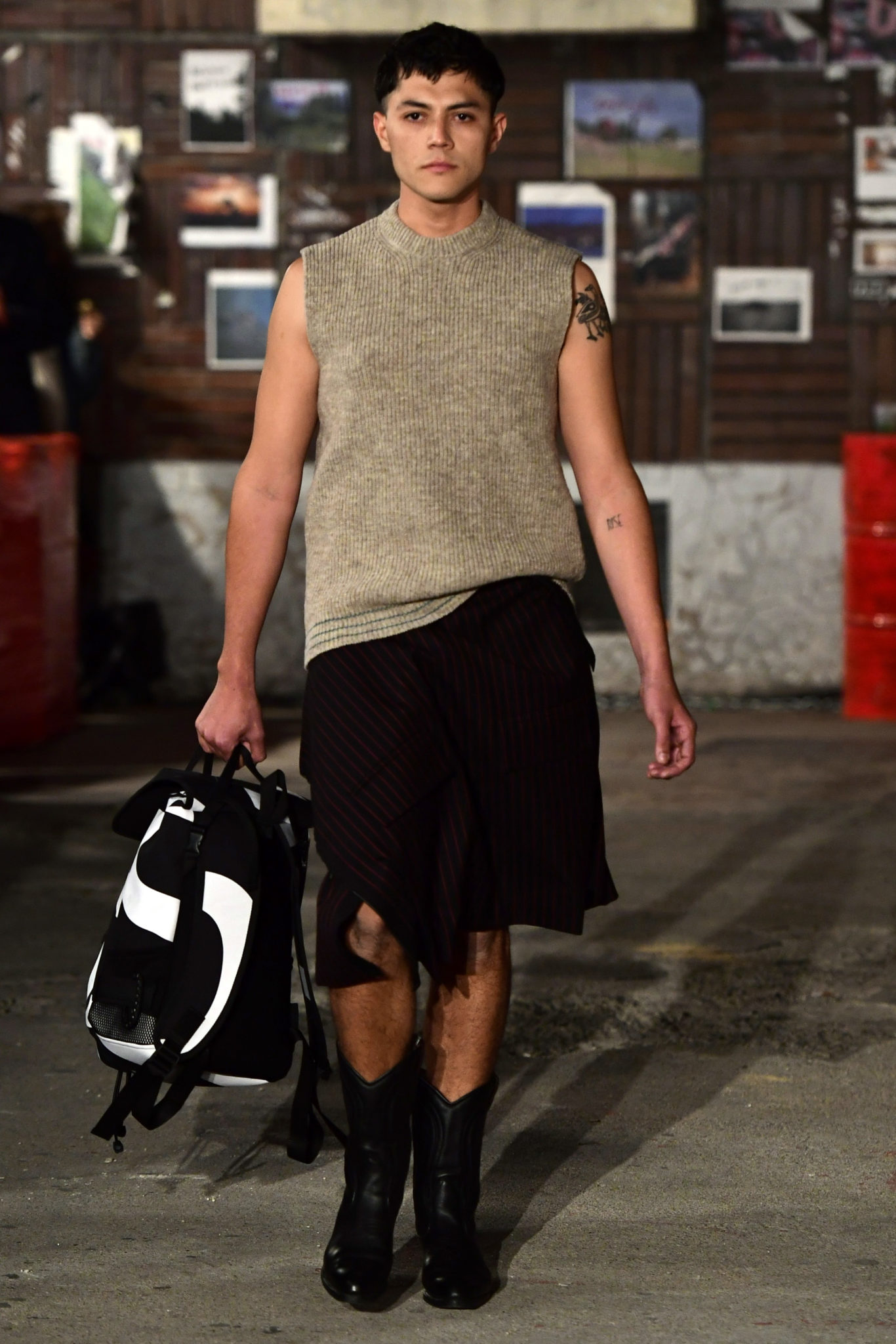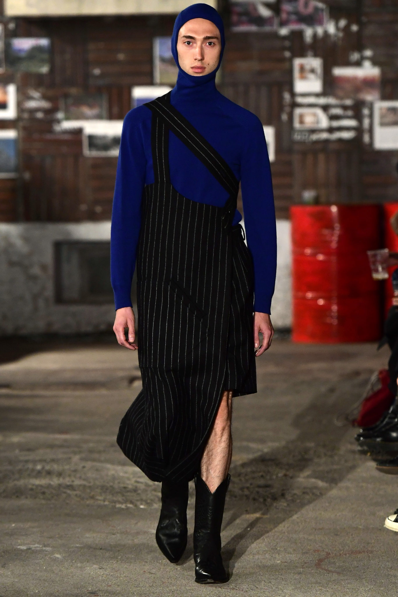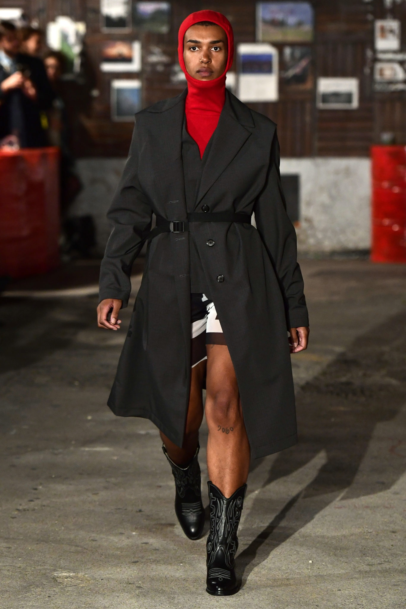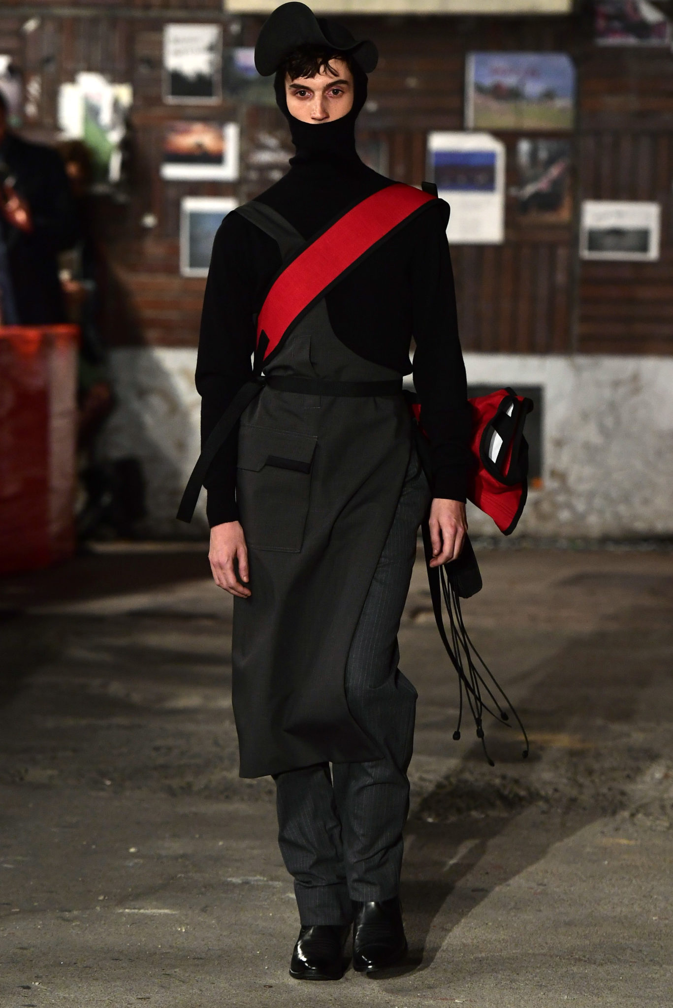 Entre décalage et réalisme, les silhouettes GAMUT juxtaposent des éléments d’une grande sobriété, d’une grande rigueur, avec des gants à paillettes ou des casquettes à visières ultra-larges. Formés à l’école belge, les membres de GAMUT cherchent à faire glisser les codes du vêtement traditionnel, du gilet d’homme à la robe de soirée, du manteau tailleur à la chemise blanche, en passant par la parka technique et le pull en laine rustique.