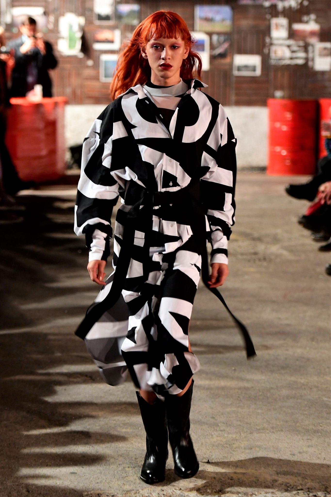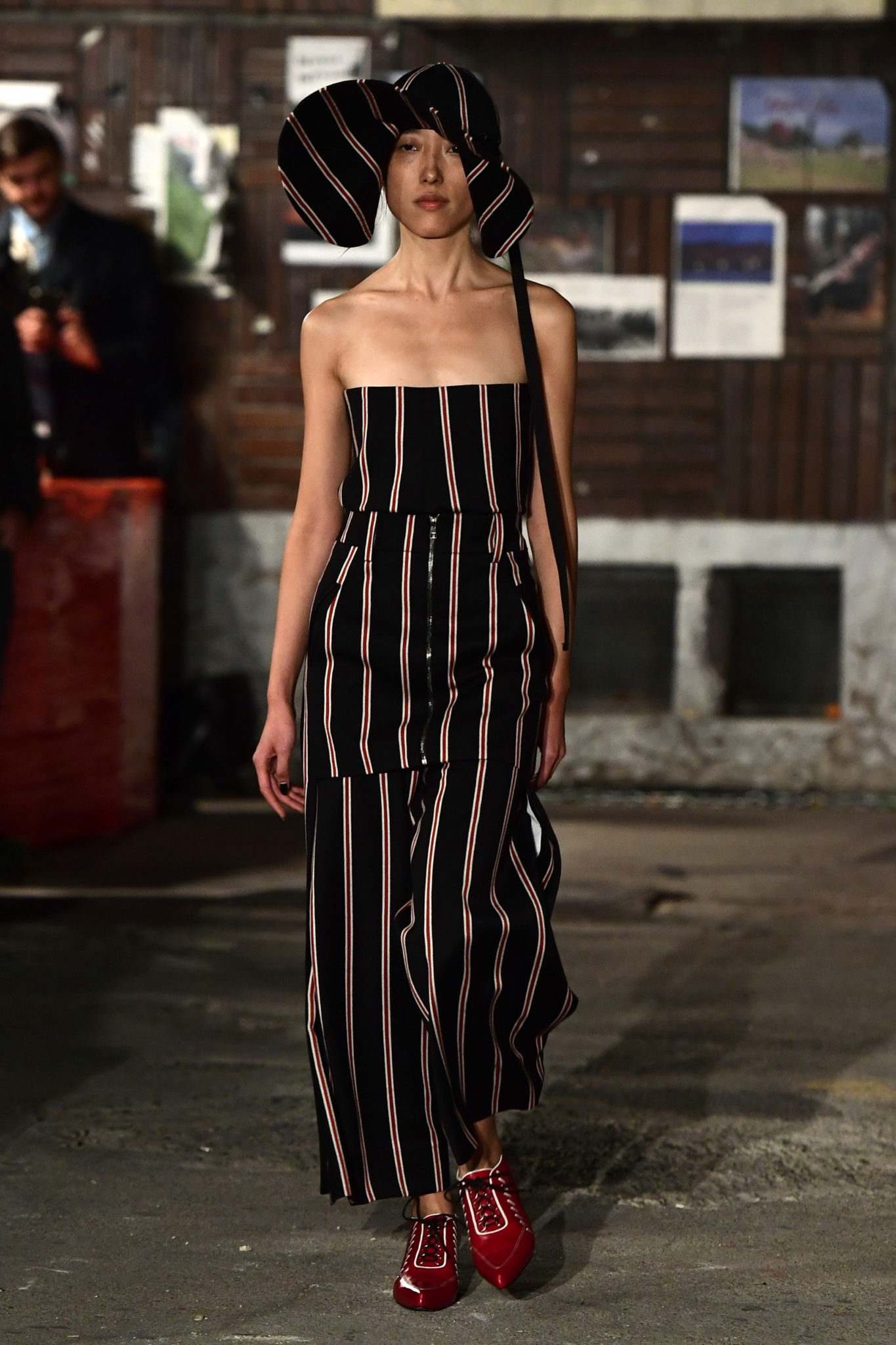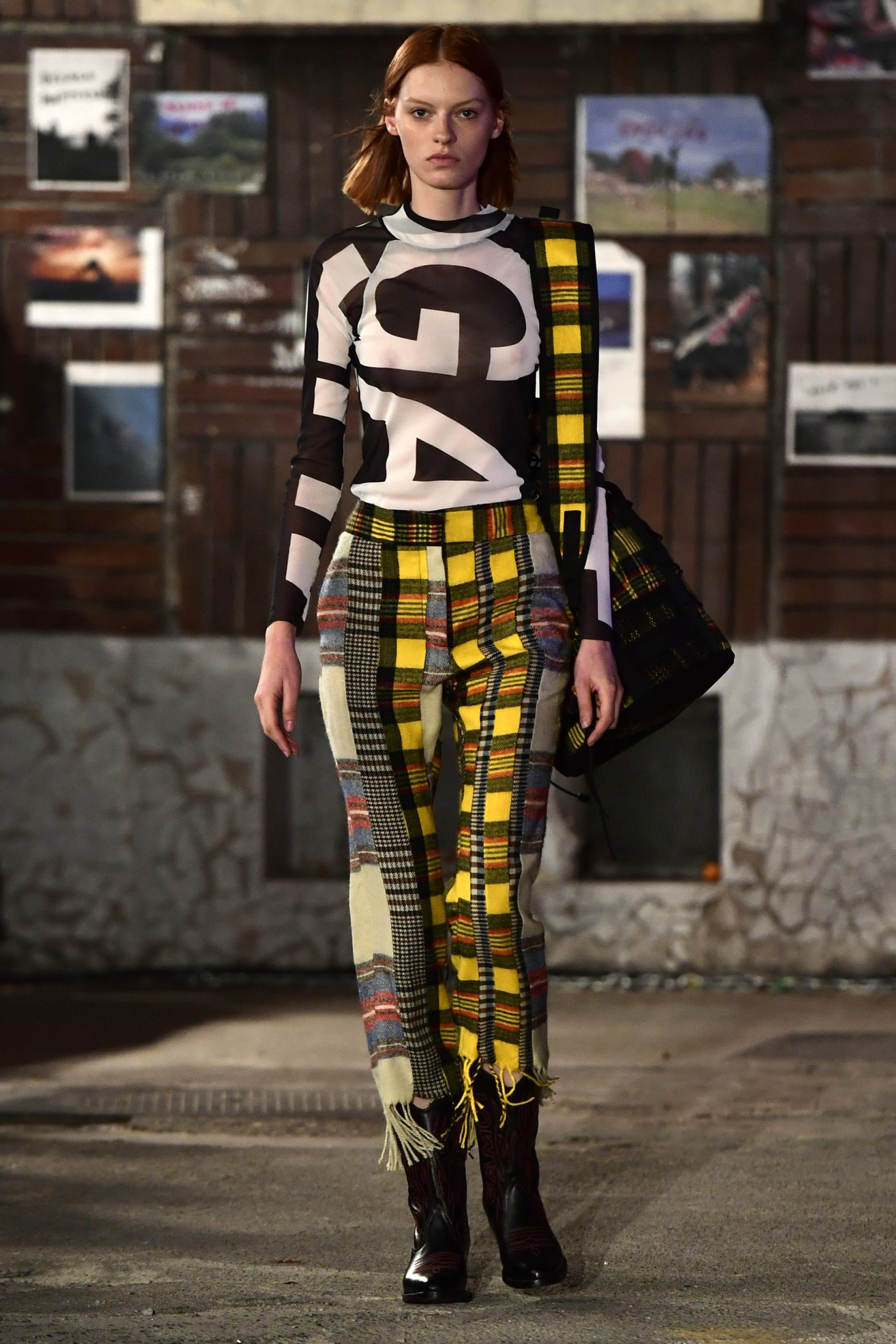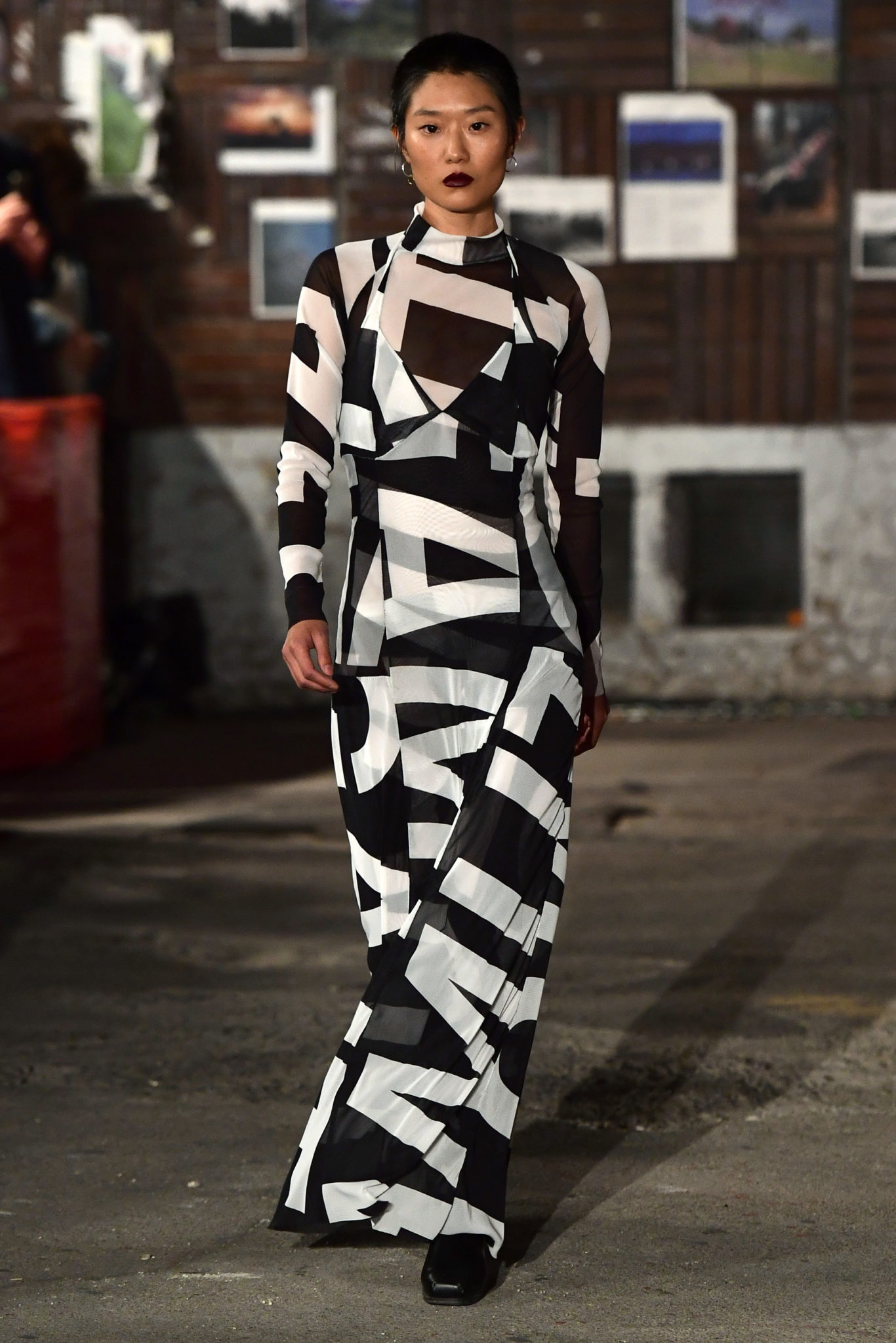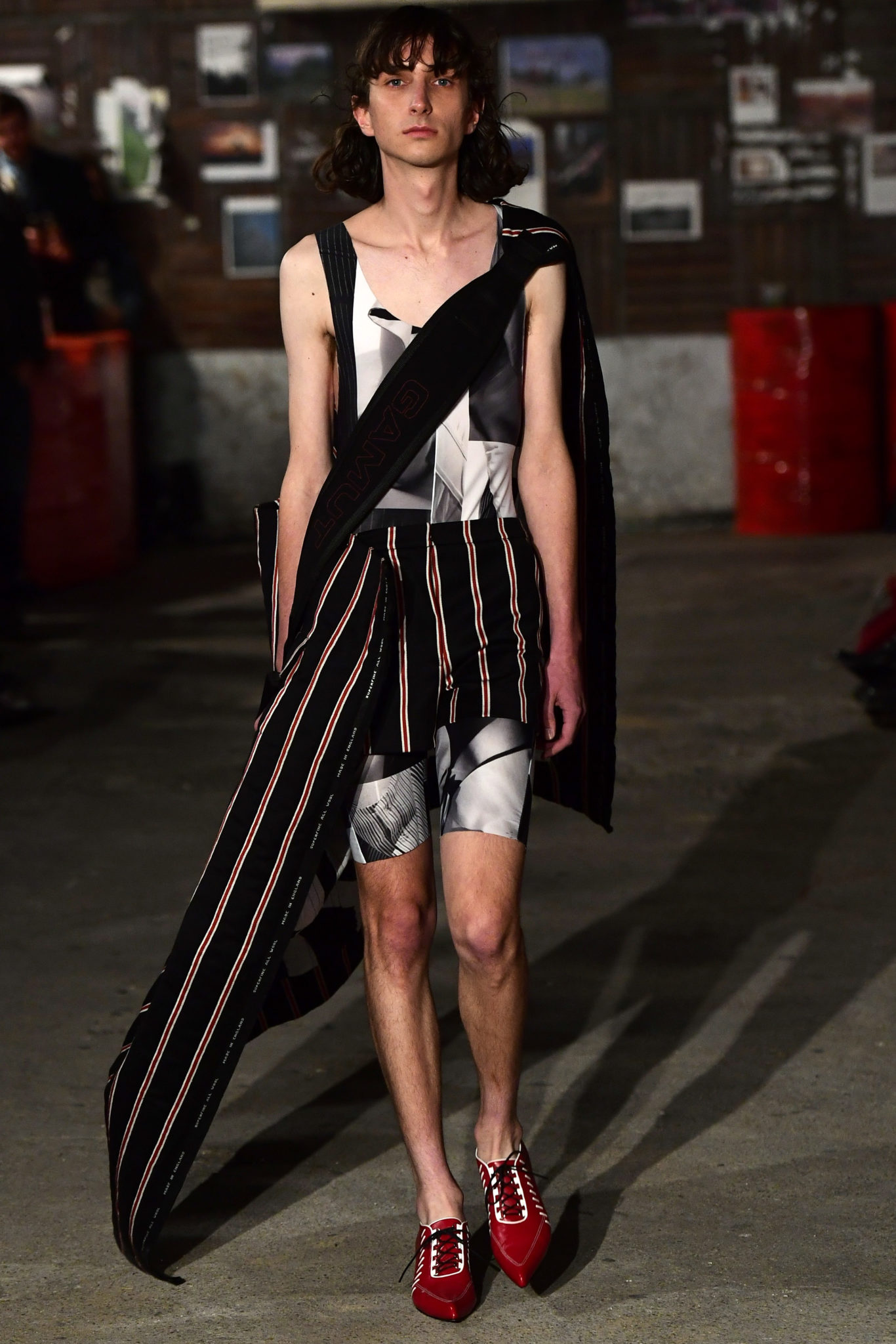 : les lainages traditionnels à rayure tennis, déclinés tout au long de la collection, se confrontent à une toile technique imperméable et à des jerseys imprimés – dont les motifs reprennent, en photographie noir et blanc, les étoffes tailleur rayées du reste de la collection, portées sur des mannequins. Surdimensionné, le mot GAMUT est imprimé sur des robes, des tops et des shorts. Une ligne de mailles, tricotées en cachemire coloré et reprenant les principes de construction de la collection, apporte de la lumière à l’ensemble.