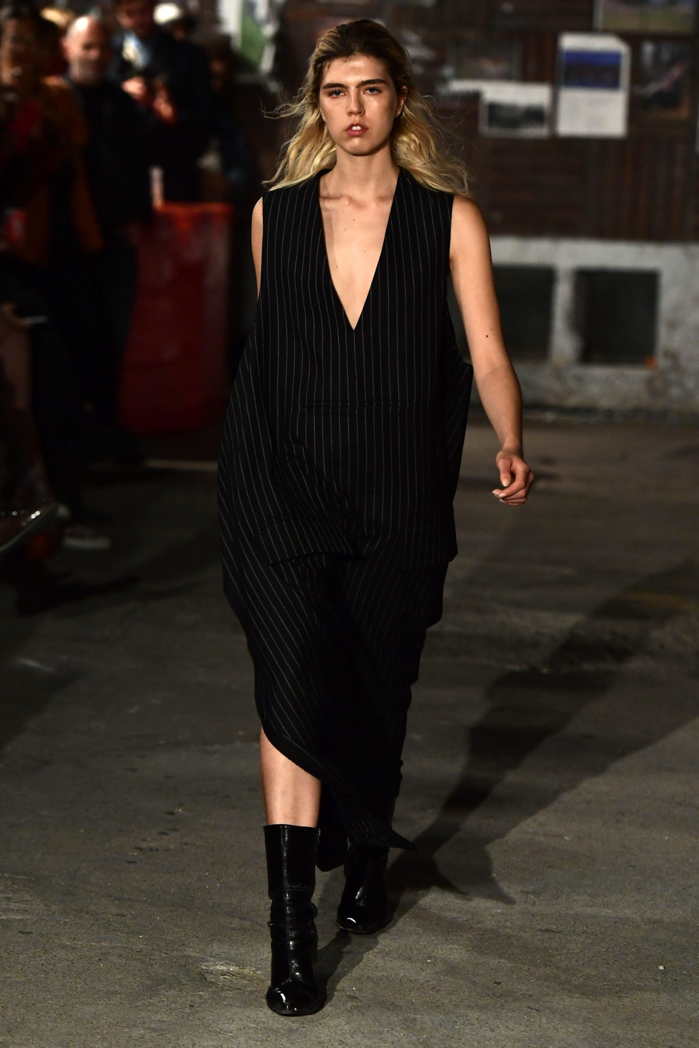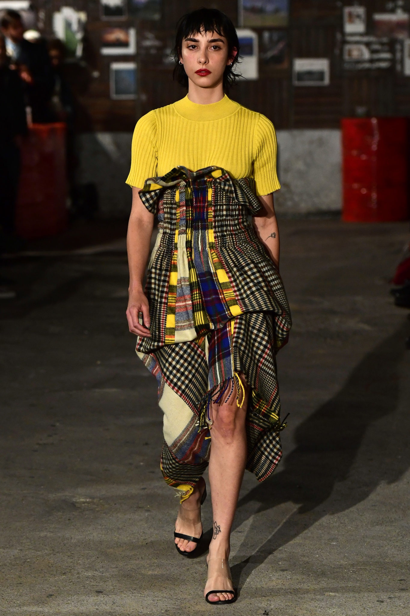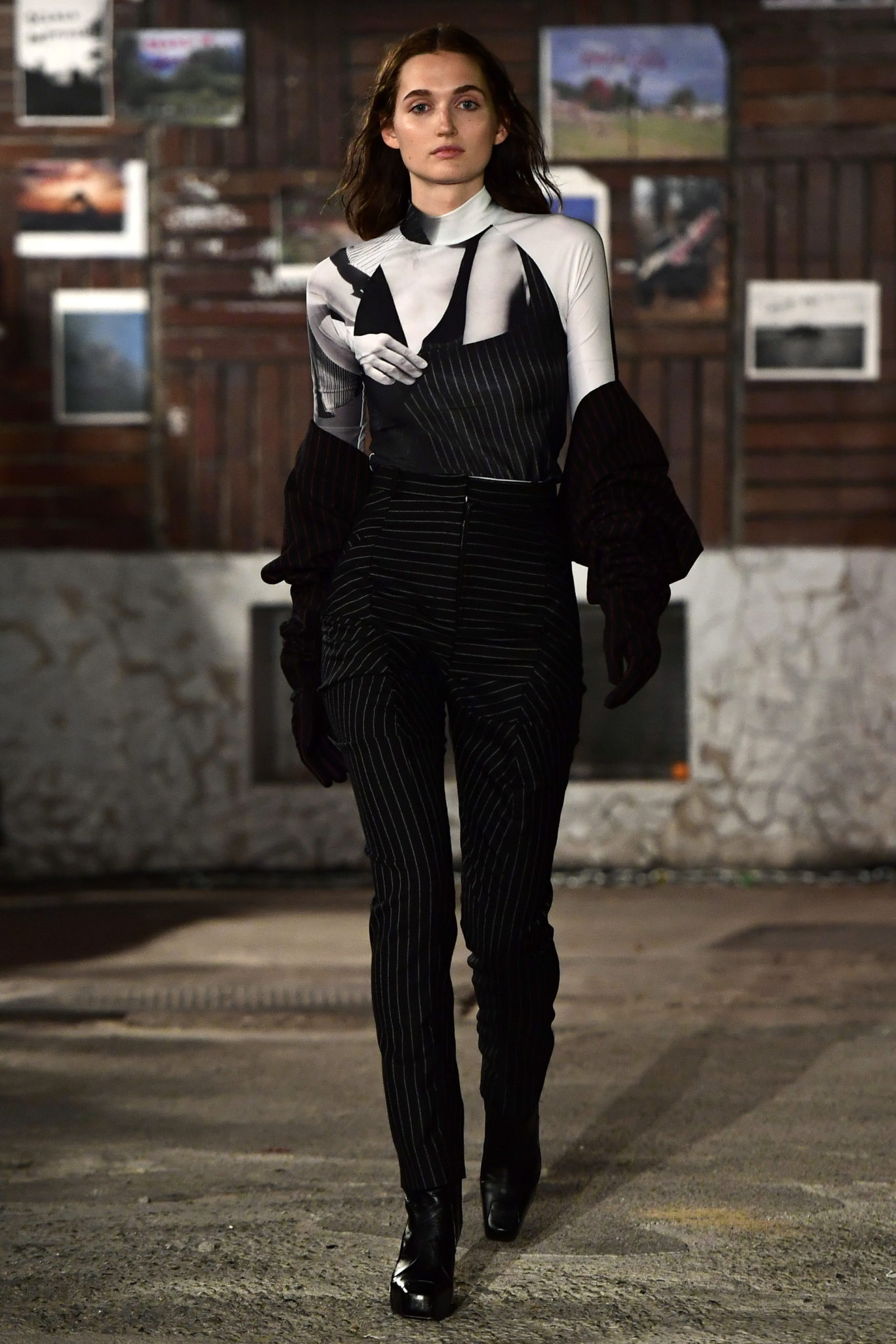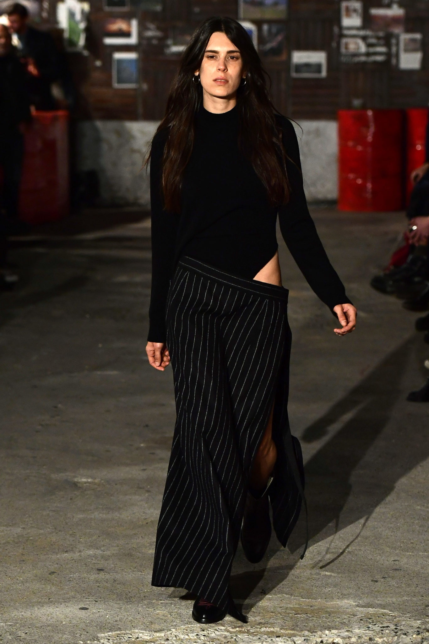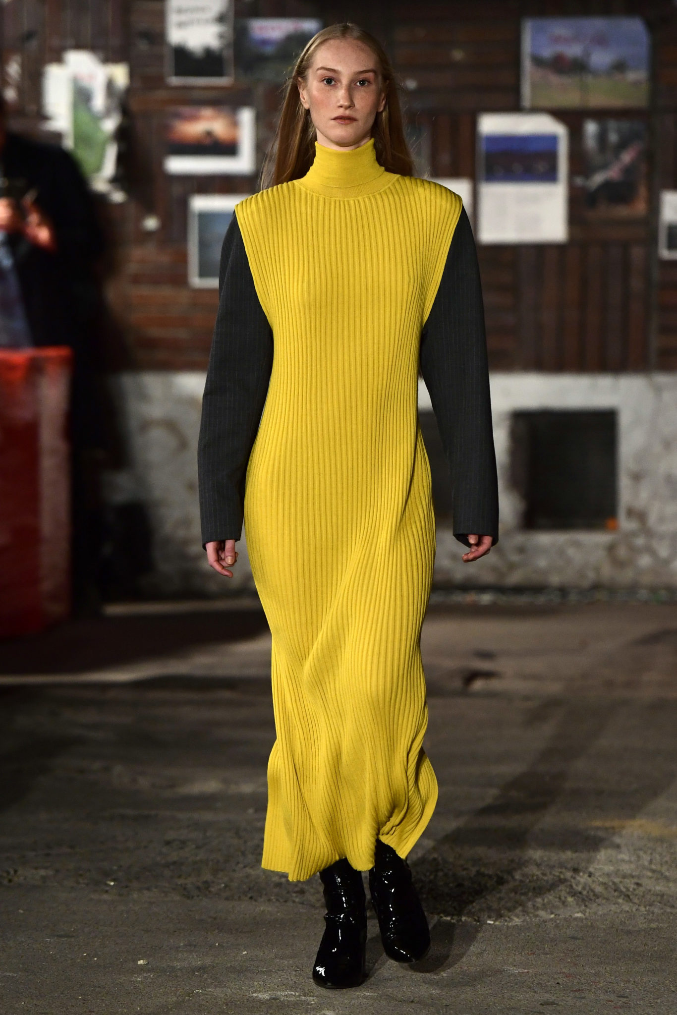 : les lainages traditionnels à rayure tennis, déclinés tout au long de la collection, se confrontent à une toile technique imperméable et à des jerseys imprimés – dont les motifs reprennent, en photographie noir et blanc, les étoffes tailleur rayées du reste de la collection, portées sur des mannequins. Surdimensionné, le mot GAMUT est imprimé sur des robes, des tops et des shorts. Une ligne de mailles, tricotées en cachemire coloré et reprenant les principes de construction de la collection, apporte de la lumière à l’ensemble.