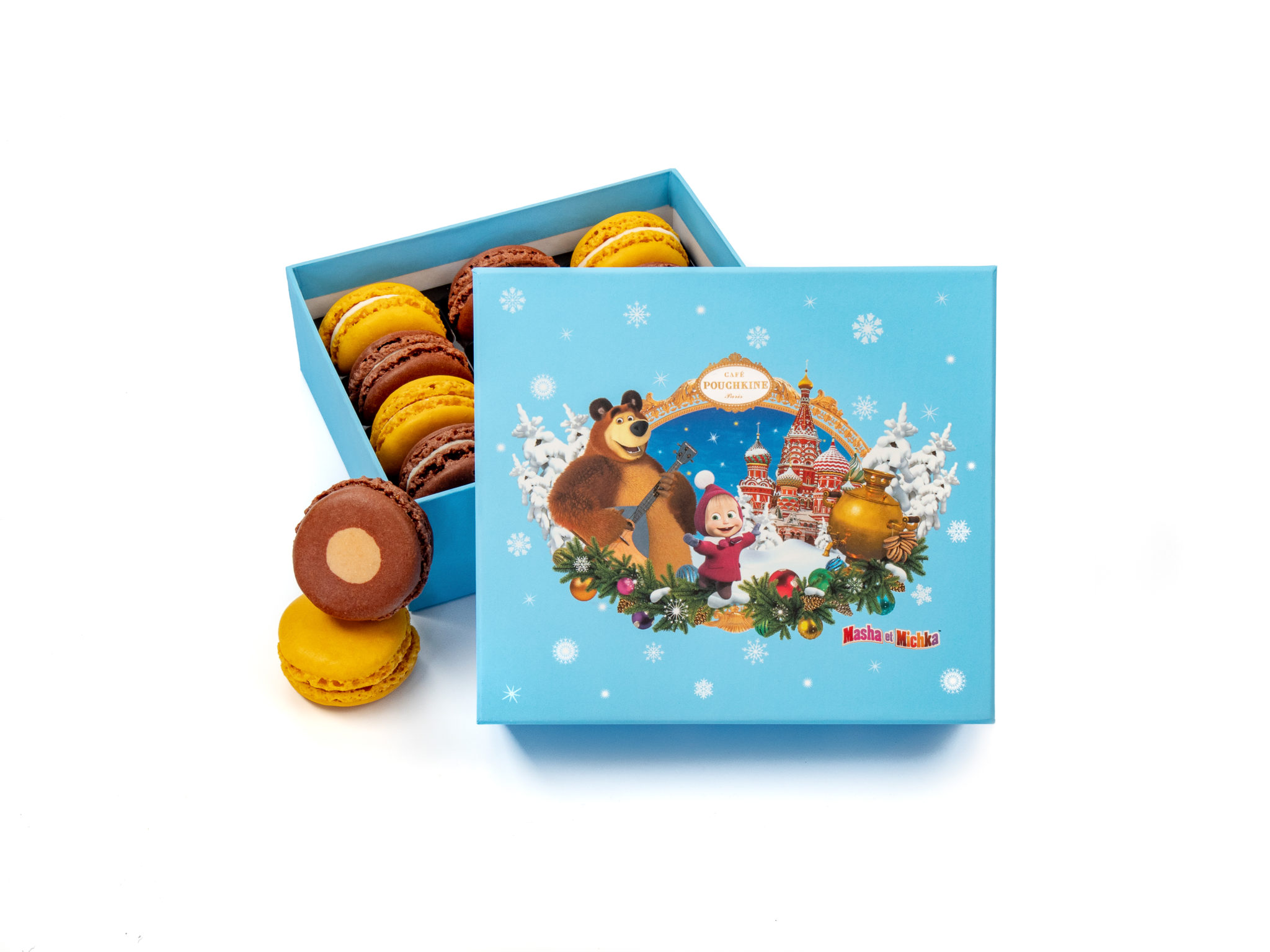 Le miel pour Michka et le chocolat / coco pour Masha, à disposer dans leur adorable écrin de 12 macarons, imaginé pour les petits gourmands.