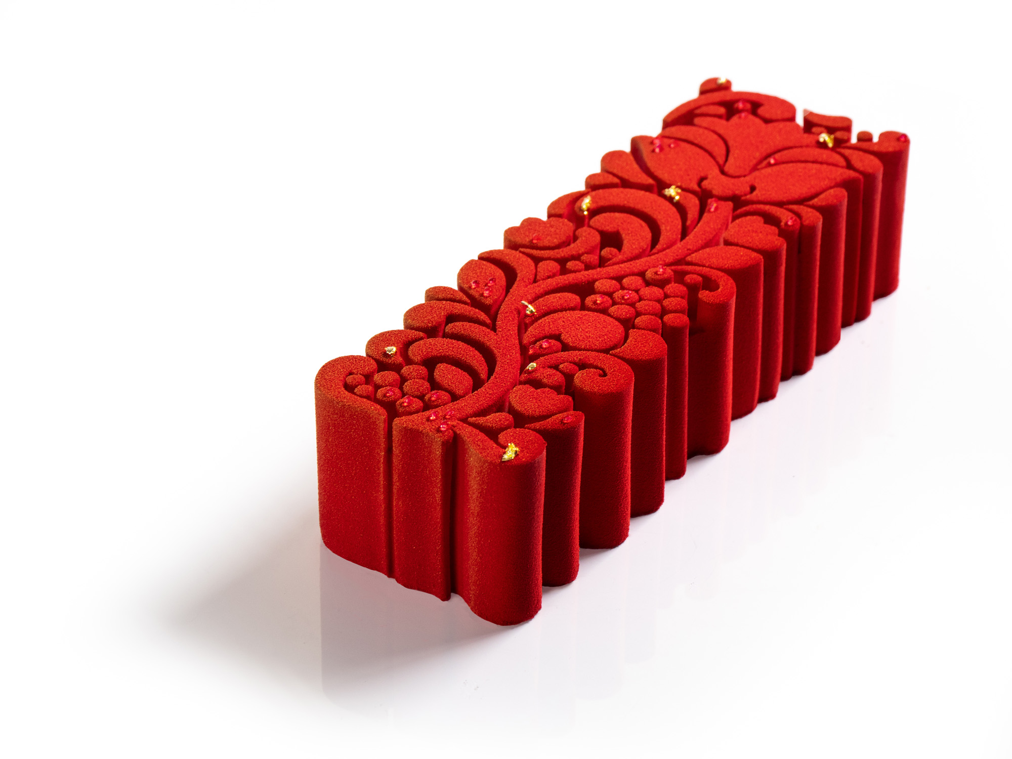 L’esprit de la charlotte aux fruits rouges, telle une dentelle délicatement sculptée. La Skoulptoura allie harmonieusement les saveurs des fruits rouges, de crème citron et de bavaroise citron vert, le tout délicatement épicé de fève tonka.