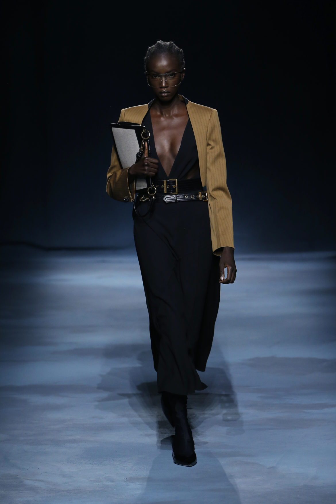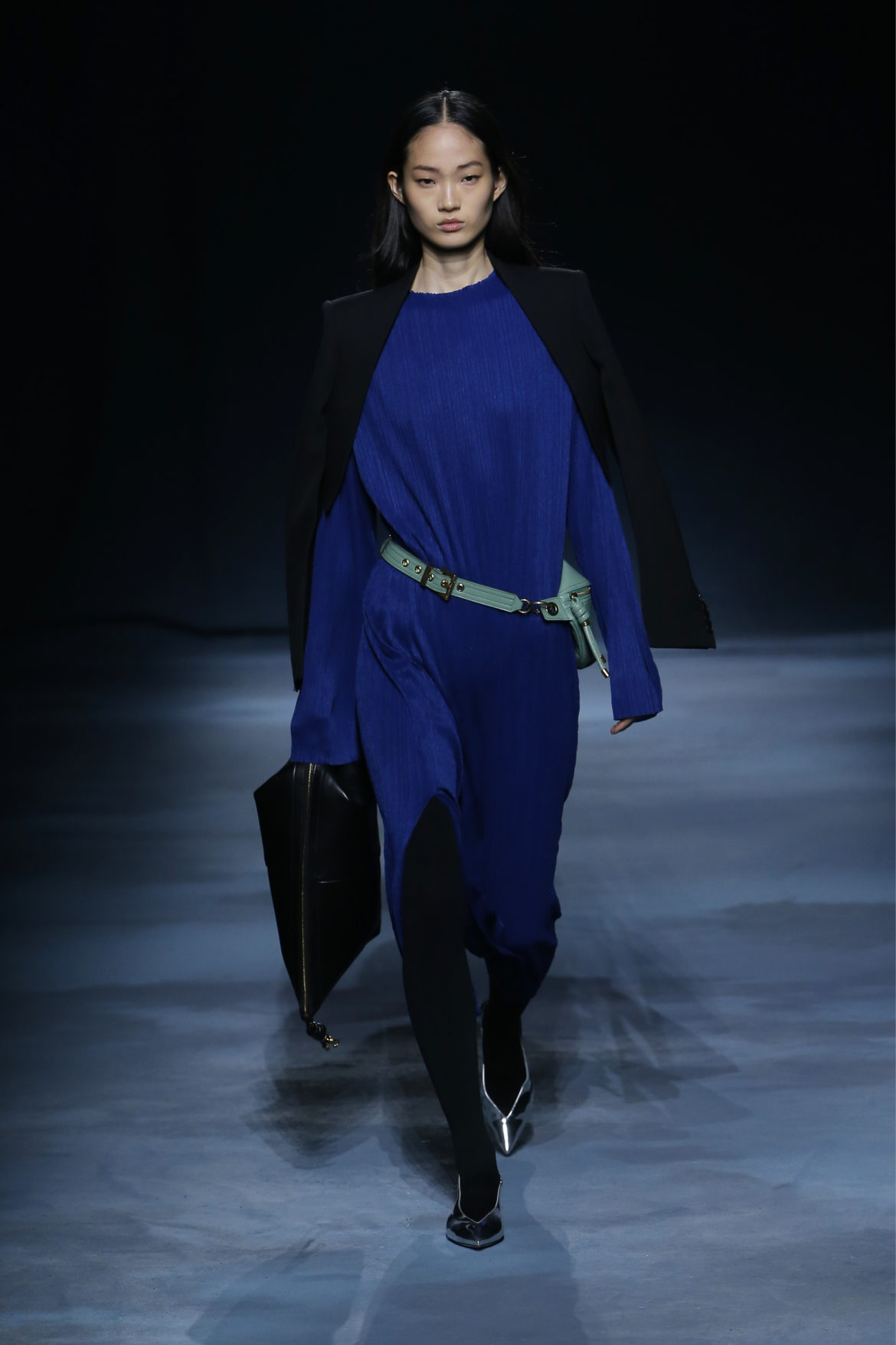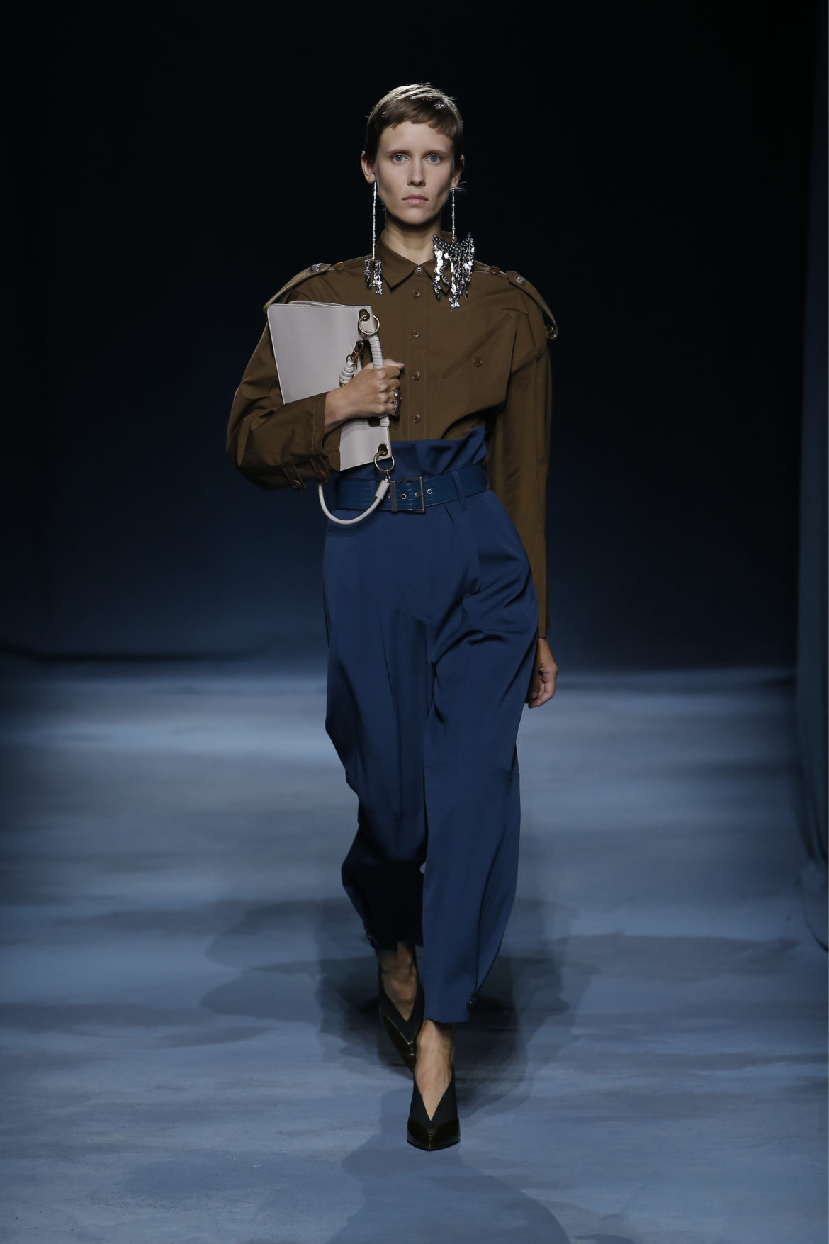 Reflected in the show set, a series of rooms draped in painted canvases like the uncovering of an old house, colours materialise in a faded warm palette of beige tones, deep yellows, dark greens, lavender, salmon and indigo blue. Fabrics largely emerge in cottons, jerseys and crepons. Wide leather belts appear throughout, alongside work totes and small squashed zip-top bags. A new bag, the WHIP, is introduced, in a boxy construction with a long front flap and a cut-out handle. Jewellery is dramatic, exemplified in oversized chandelier earrings and corresponding rings in flattened metals, styled across thecollection.