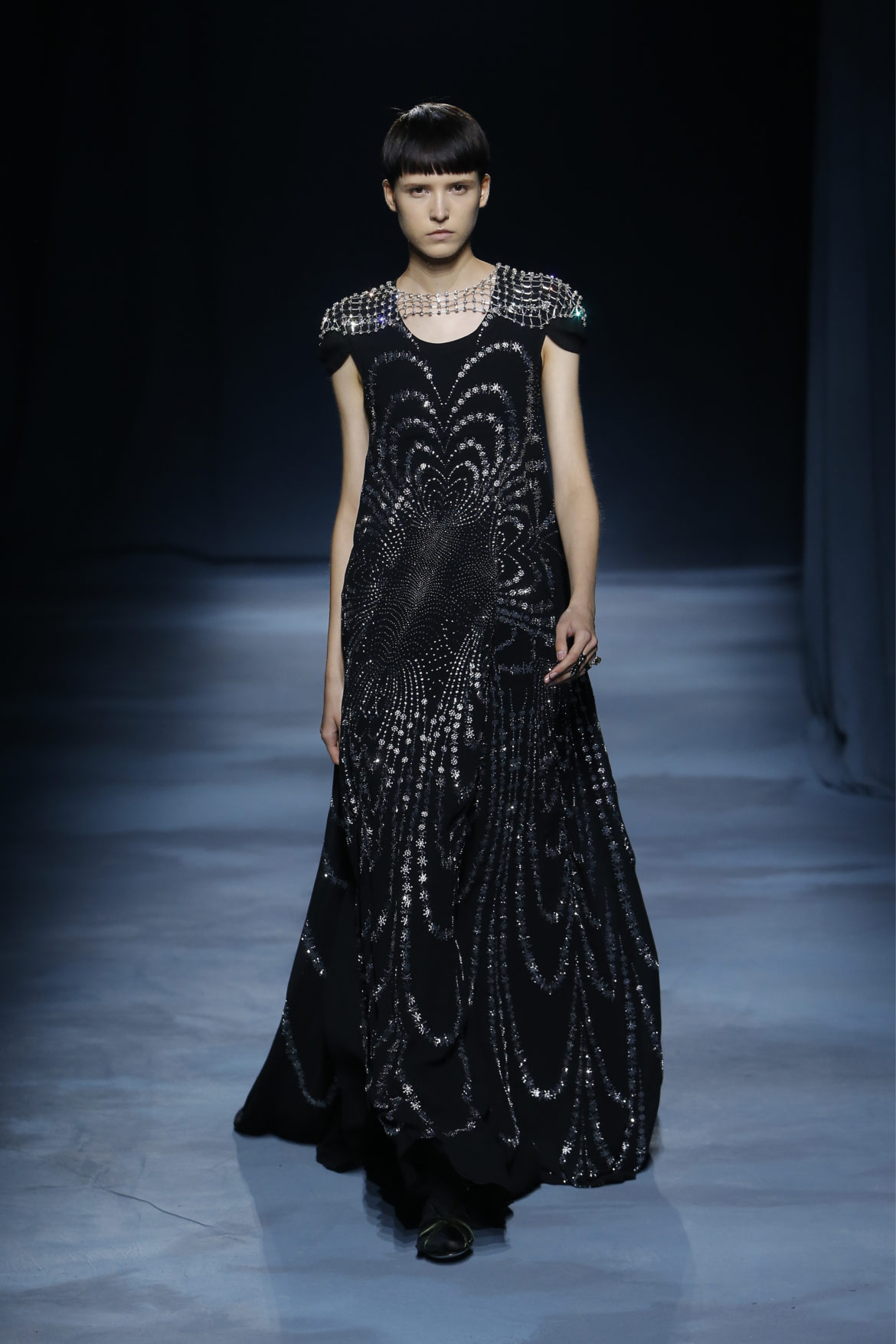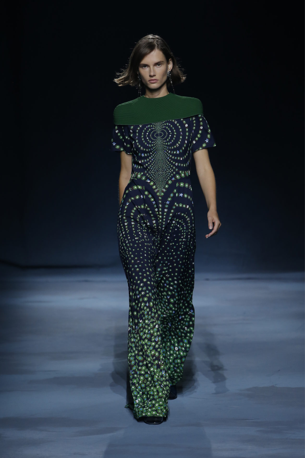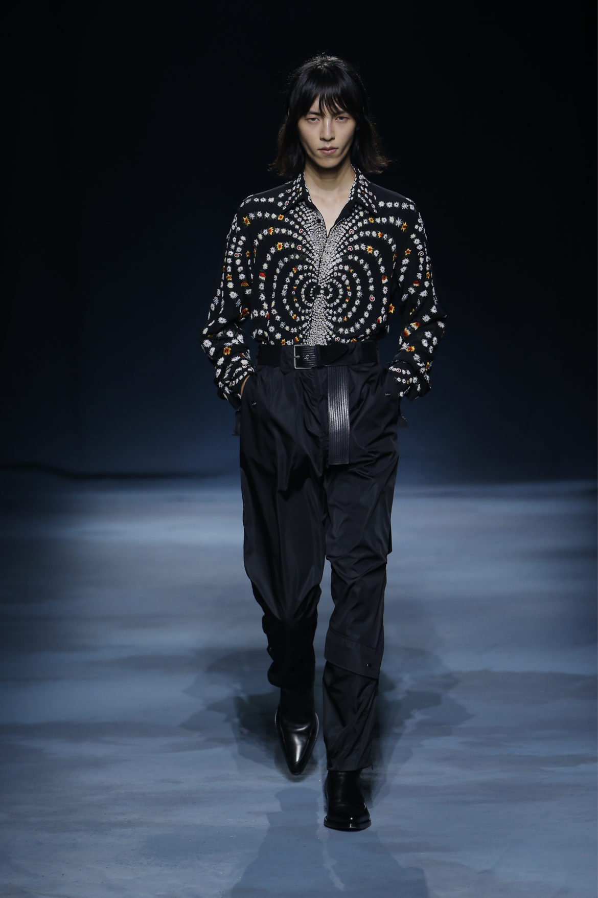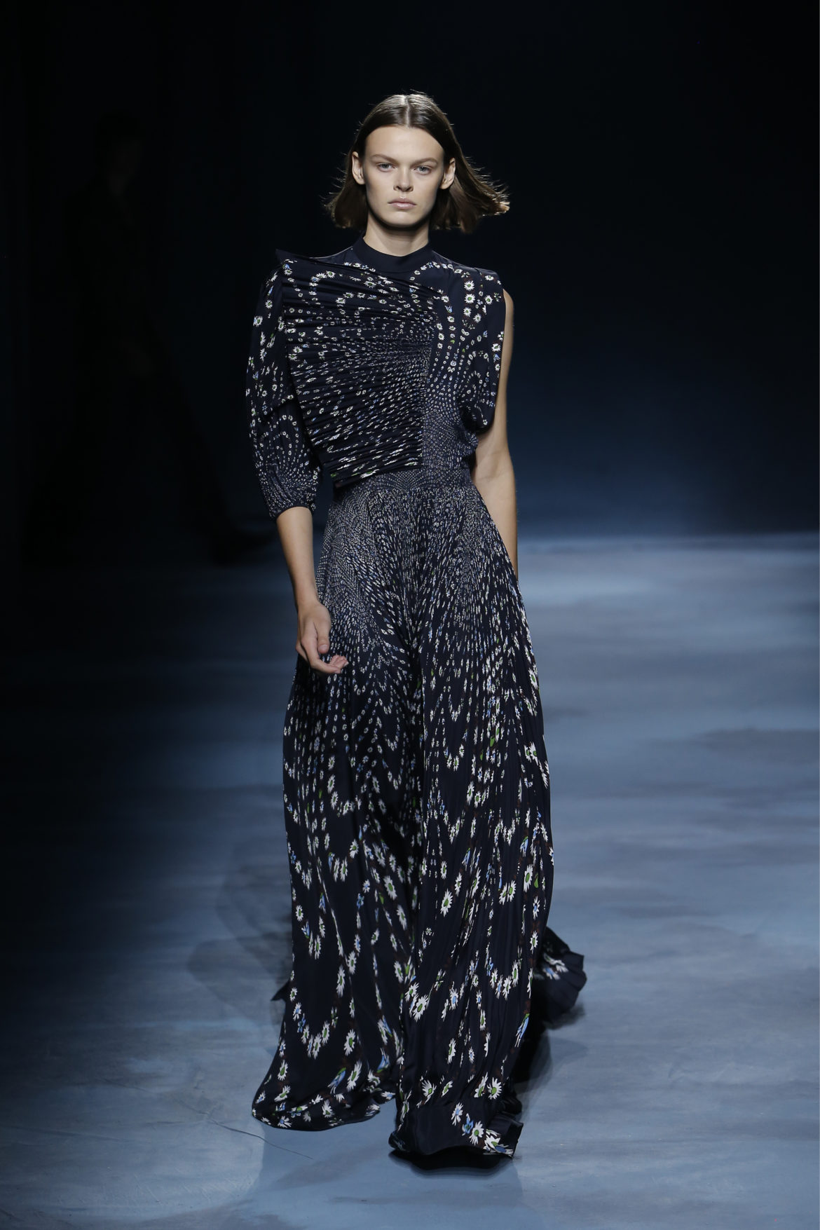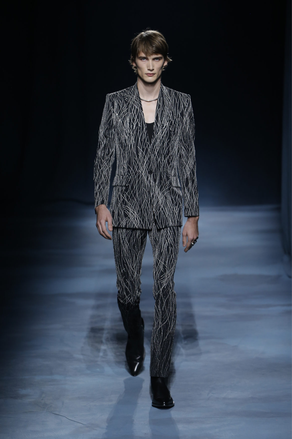 Floral prints, once a trademark of the female wardrobe, enter into both women’s and menswear. Signifying a further take on mirroring, the patterns draw together, disappear, dissolve and explode into circular flower formations. Morphing into silver embroideries, the theme of reflection is expressed in metallic elements achieved through artisanal processes: dresses in silver lace lacquered in silver and applied with silver resin create a foil effect, while silver outerwear comes to life through leather lamination. Mirror embroidery appears in menswear.