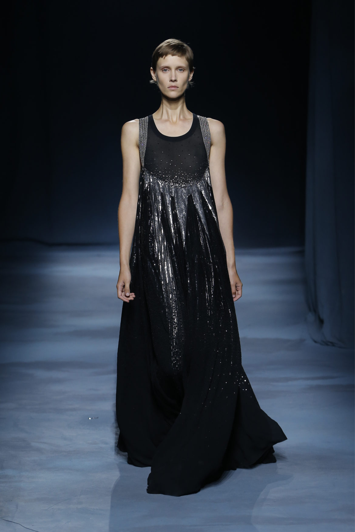 In tailoring developed in the Haute Couture ateliers, a new shoulder takes shape: petite in proportion, it sends a strict crease down the front of the sleeve and swings in sculpturally at the waist. The dimension is contrasted by high-waist trousers overblown in volume, cut low on the hip but structured with a hint of a basque. Facets borrowed from military dress nod at a sense of gender-non-specific uniformity. Through day and eveningwear, dresses and skirts materialise only in very short or floor-length proportions, an expression further interpreted in a symmetrical cut away pieces worked in softst retch.