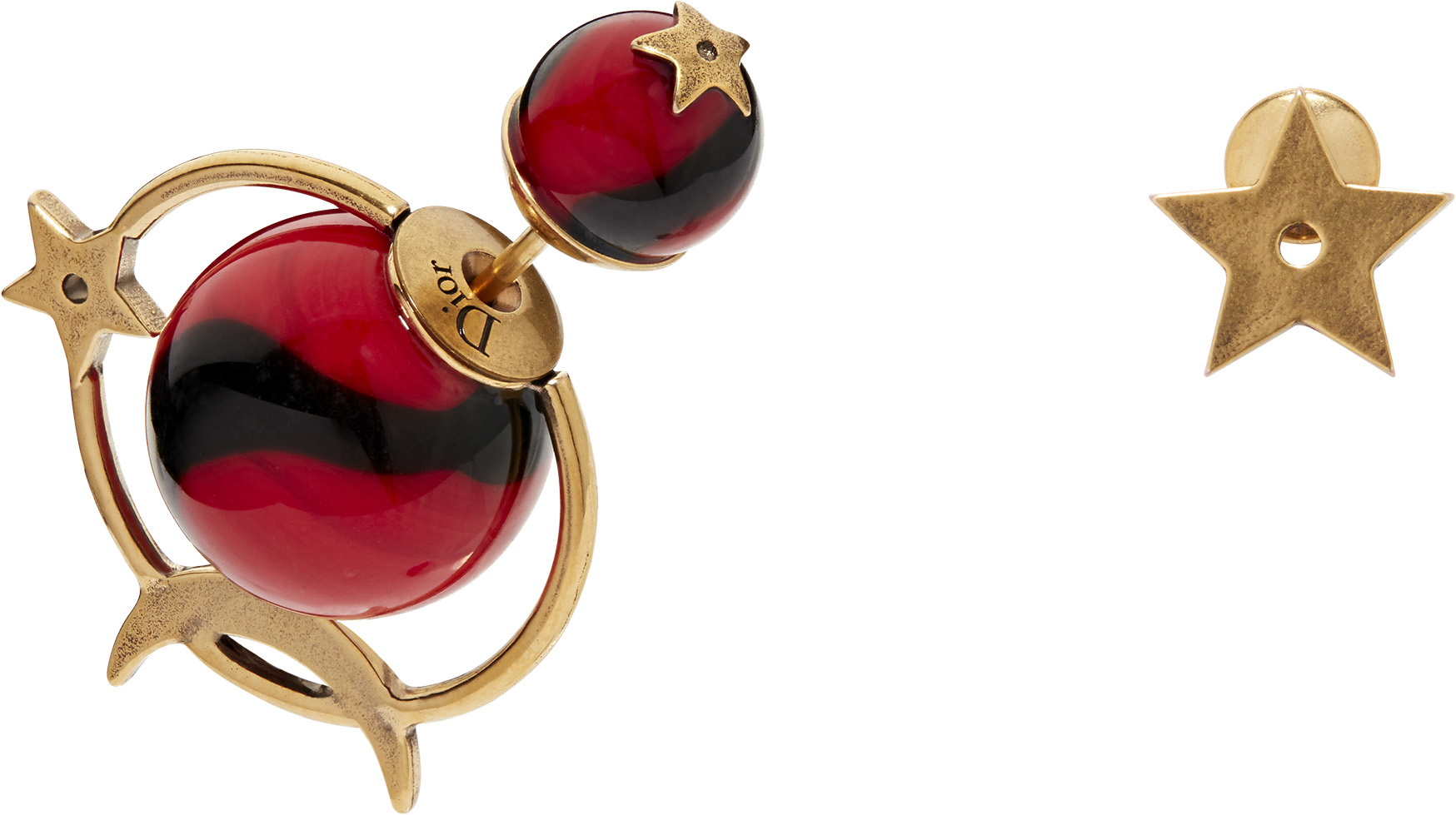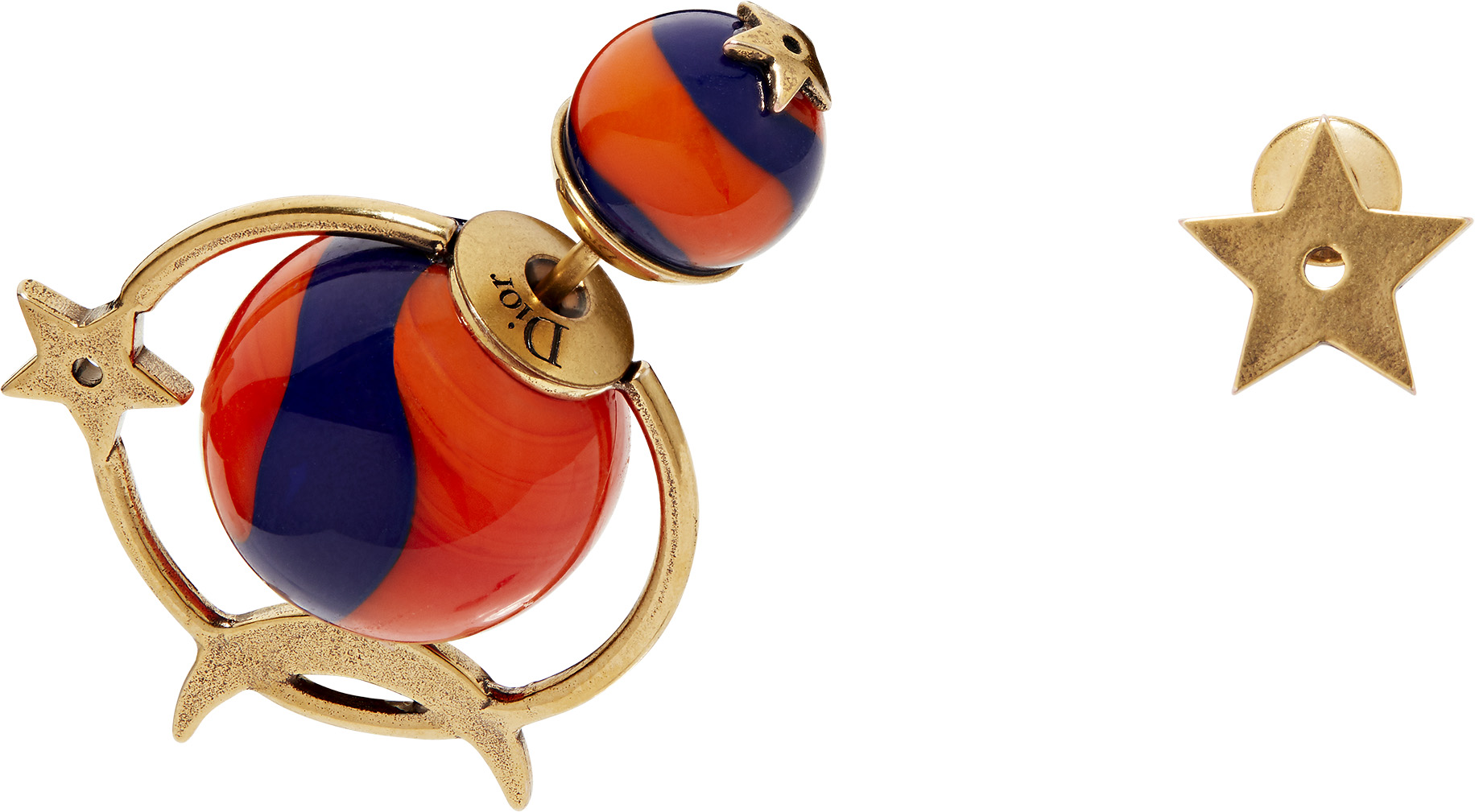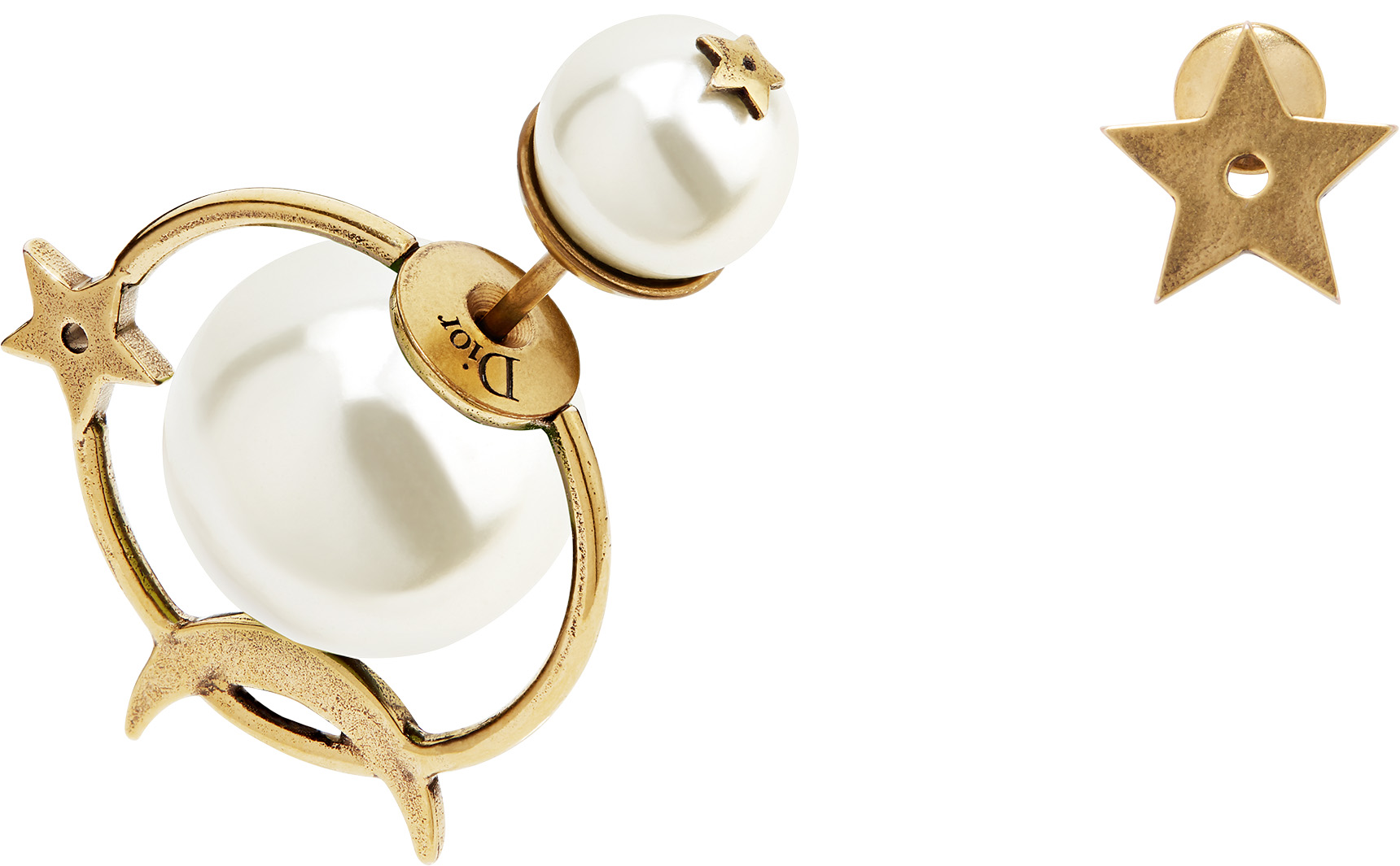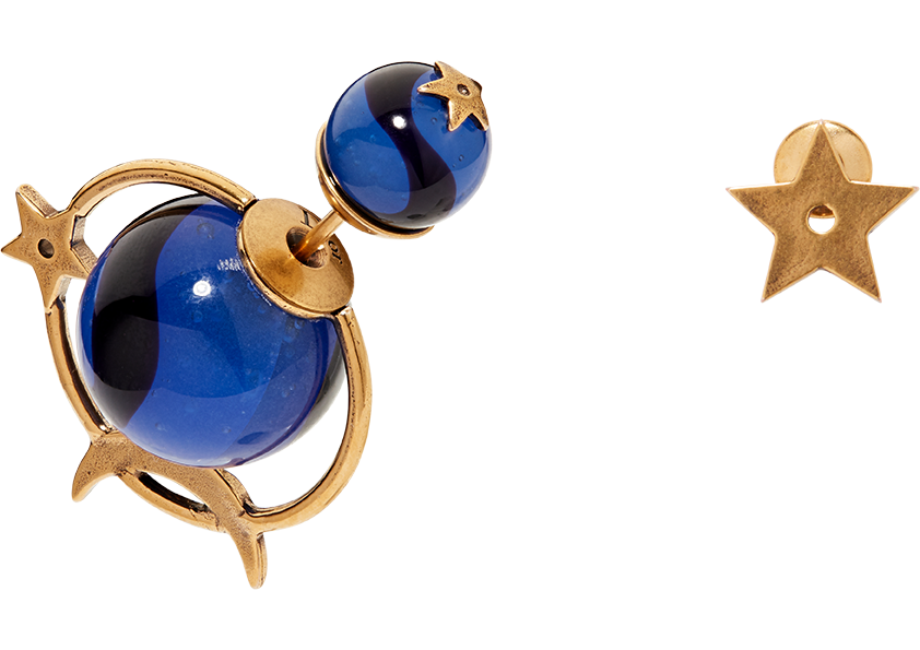 « J’aime toujours voir les femmes porter des boucles d’oreilles. Elles apportent une jolie touche finale », confiait Christian Dior dans son Petit Dictionnaire de la Mode. Iconiques et intemporelles, les Dior Tribales laissent deviner, cette saison, trois codes de la Maison en métal doré : les initiales de Christian Dior, ainsi qu’une étoile et une abeille, symboles fétiches et porte-bonheur de Dior. Avec ces deux perles de tailles différentes, ces boucles d’oreilles jouent à l’envi sur l’asymétrie et se portent en duo ou mixés à une autre création de la Maison.