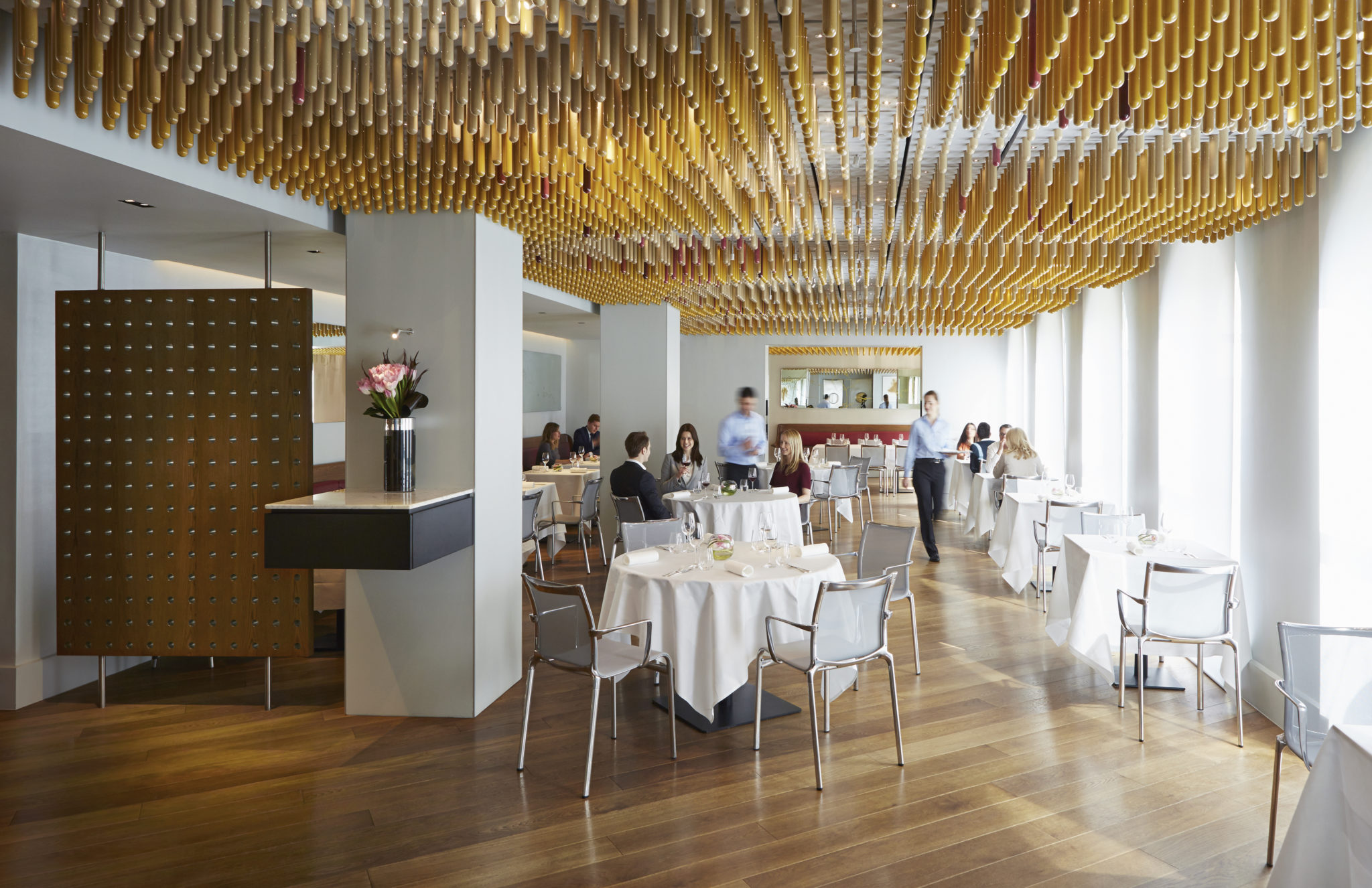 Le concept au cœur de la création de l’hôtel était le «Expansion of Space», une sensation qui peut être expérimentée partout dans le Halkin. Au-dessus du hall d’entrée, spacieux et lumineux, grimpe un plafond atrium décoré d’une peinture