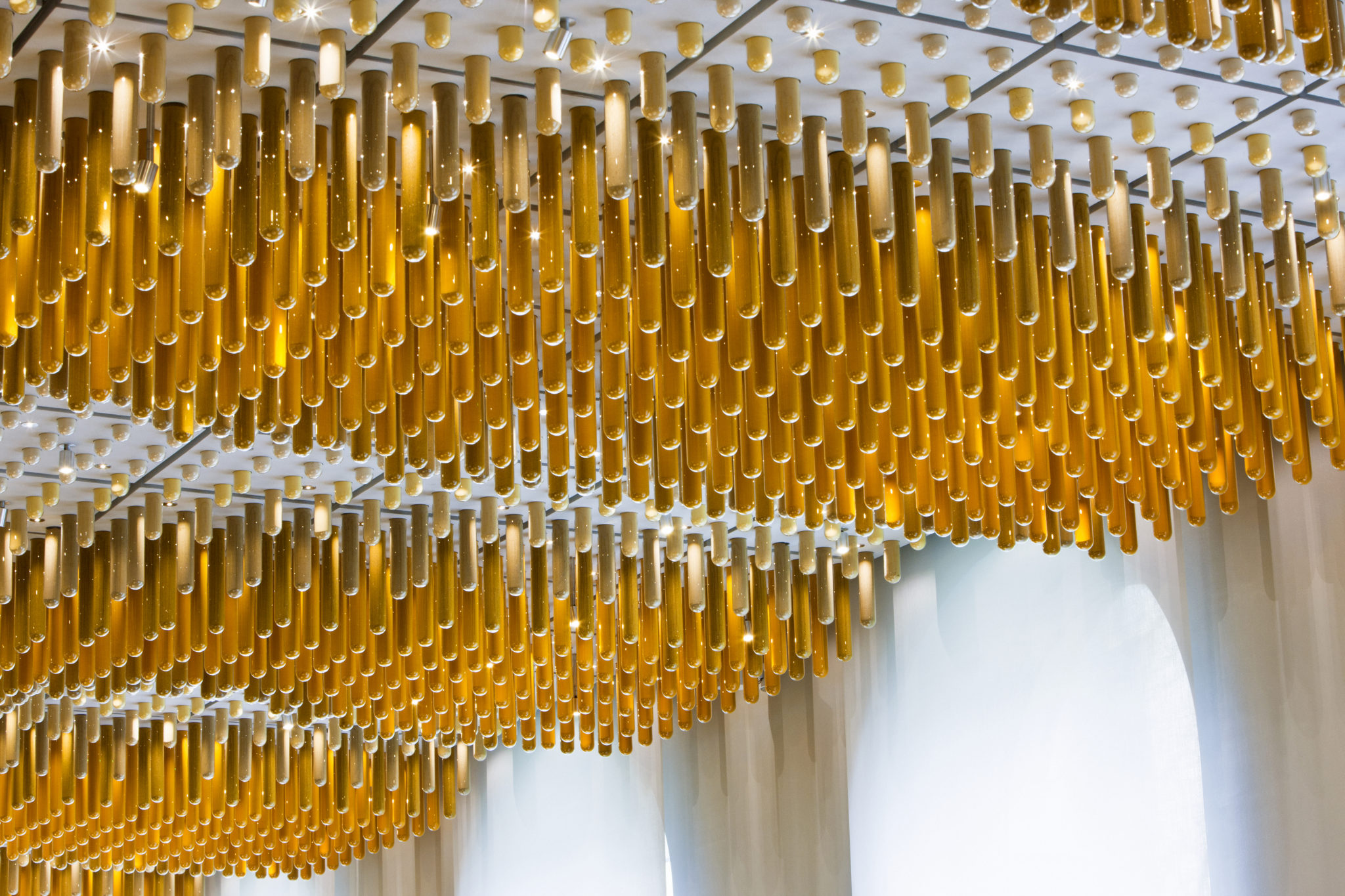 murale façon « gratte-ciel », créée par le peintre italien Valentino Vago. Le hall est en open-plan afin de faciliter la circulation, donnant sur le bar de l’hôtel à gauche, la réception à droite et en face le restaurant.