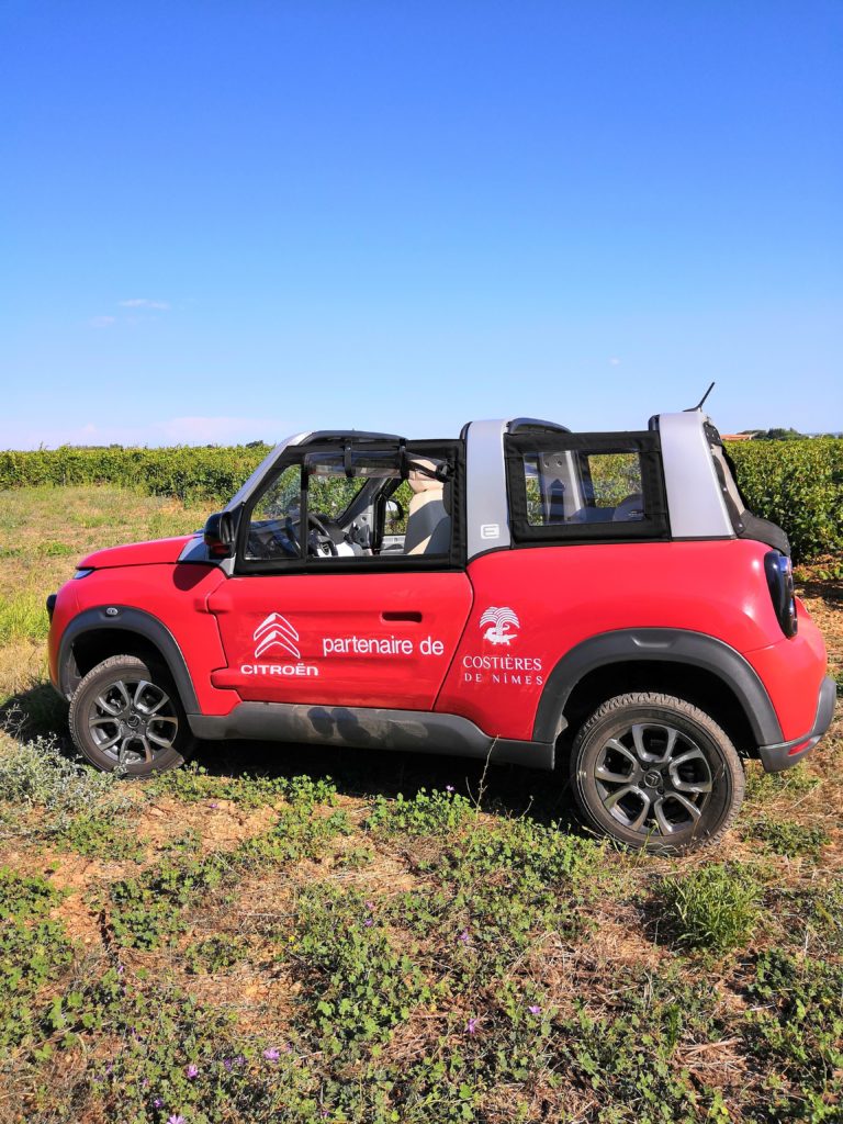 Nous embarquons en e-Mehari pour un voyage au cœur du vignoble à la rencontre des vignerons et de l’appellation Costières de Nîmes. Premier arrêt au  Château des Nages et au domaine de Michel Gassier