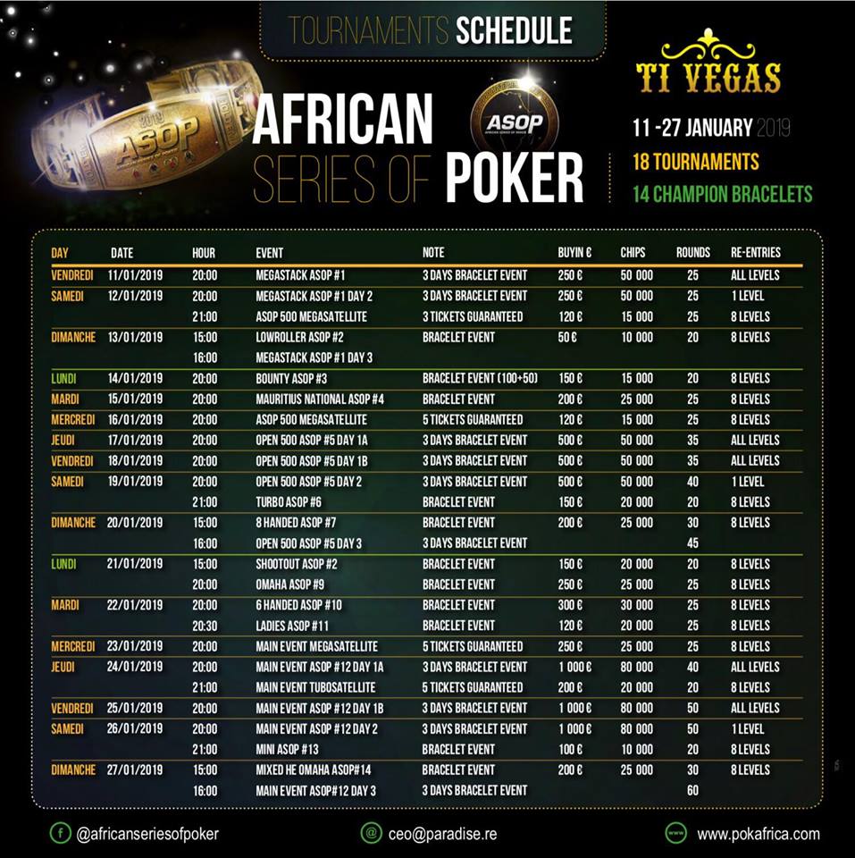 Du 12 au 27 janvier 2019, le Ti Vegas de Grand Baie, à l’Ile Maurice accueillera la 3eédition des African Series of Poker : un festival de poker avec des tournois aux Buy-in très variés. L’occasion idéale de lier poker et vacances.