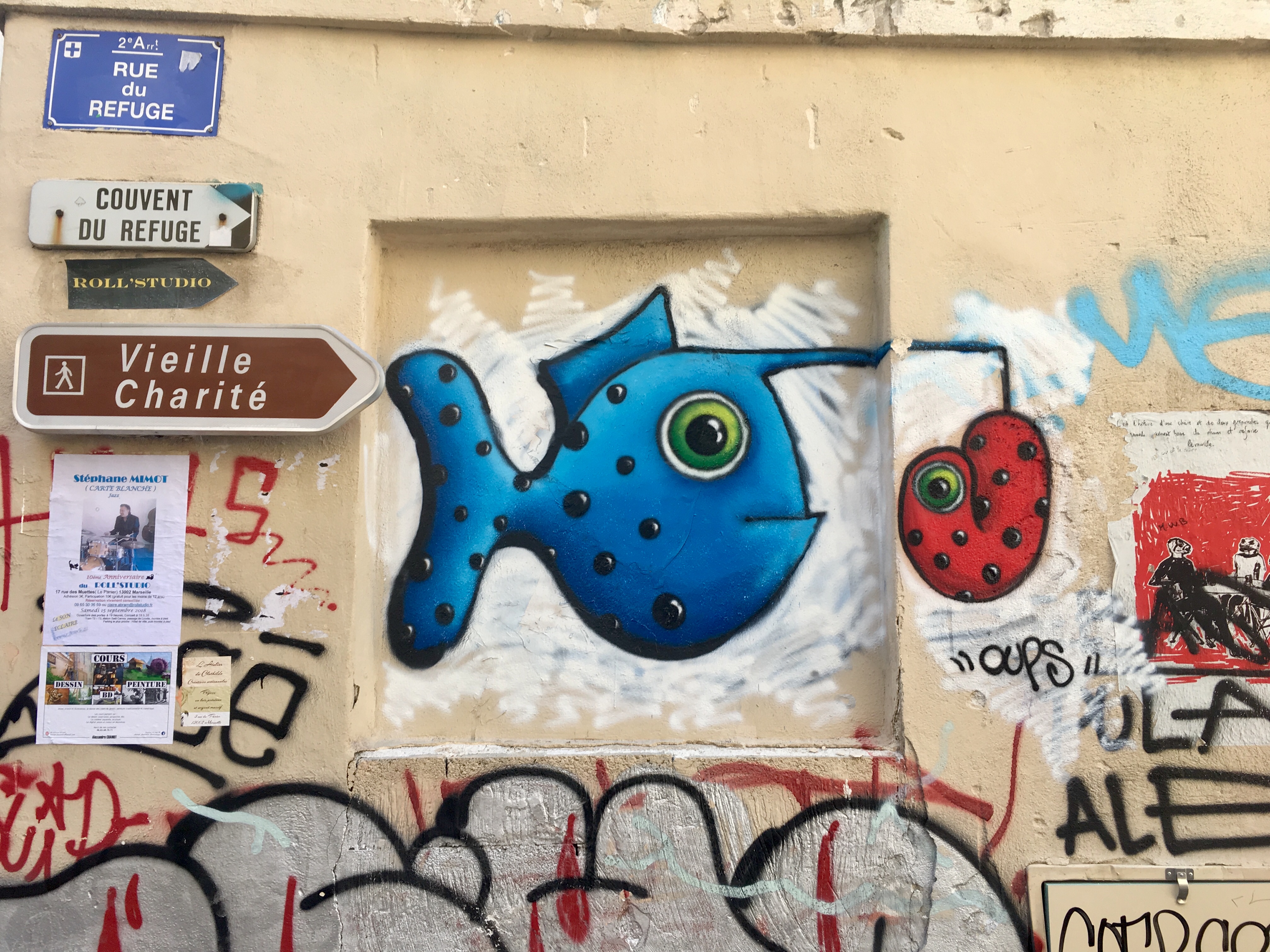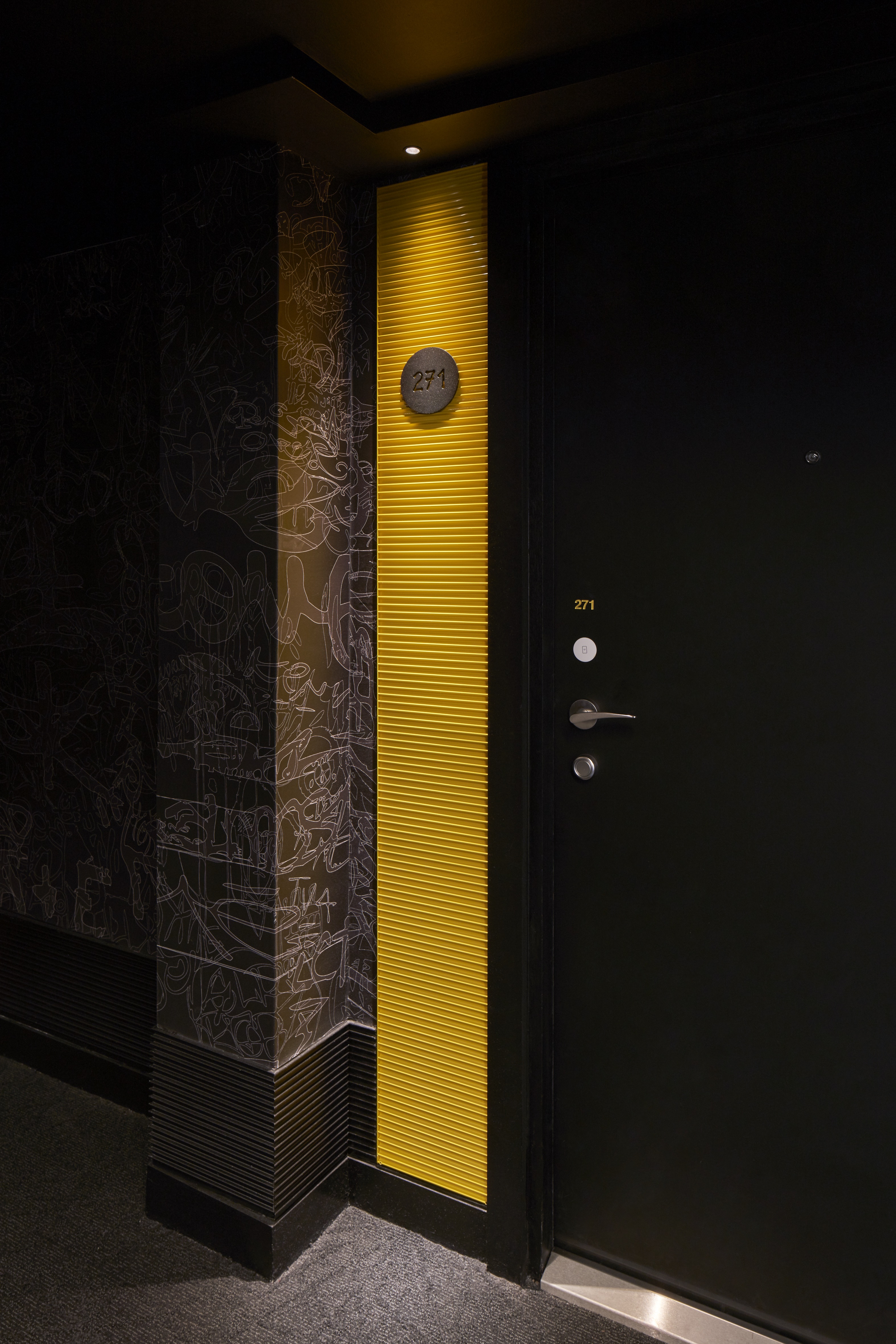 Les parties communes : Sur les murs se déclinent des tags réinterprétés dans une palette de gris et de noir, évoquant les ruelles étroites du vieux quartier du Panier à Marseille. Afin de ne pas dénaturer le minimalisme des murs, la signalétique et tous les éléments graphiques visuels, créés par le graphiste marseillais Adrien Bargin, sont indiqués au sol, par des projections lumineuses.