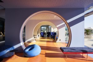 Le Tunnel Bar : il oscille entre le froid du bleu profond des profondeurs aquatiques, le bleu clair de la source qui jaillit et de la surface de l’eau, et la chaleur dynamique du jaune, de l’orange et du rose. Le visiteur passe ainsi par différents états sensoriels, qu’il arrive de l’intérieur de l’hôtel et se dirige vers la lumière, ou qu’il la quitte pour pénétrer dans les profondeurs du lieu. L’ensemble est inspiré de l’oeuvre de Vasarely et de ses formes géométriques hypnotiques, comme une longue galerie d’art psychédélique, ponctuée de pièces de design de référence comme le fauteuil Drum et le Tube Chair de Capellini, ou encore le fauteuil Shadowy de Moroso. Dès la sortie du tunnel, le visiteur se retrouve au niveau du restaurant.
