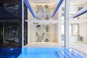 Le restaurant : il s’ouvre sur le bleu du ciel, de la mer et sur la lumière du soleil. Le sol en céramique est une continuité du Tunnel Bar, les bleus s’éclaircissent et tendent parfois vers le vert émeraude, comme la mer change de couleur selon le ciel, le blanc s’affirme, avec notamment les lampes Lapse de chez Flos. Le mobilier aux lignes et aux couleurs douces et pures évoquent la simplicité et la gaieté de la vie au bord de la mer.