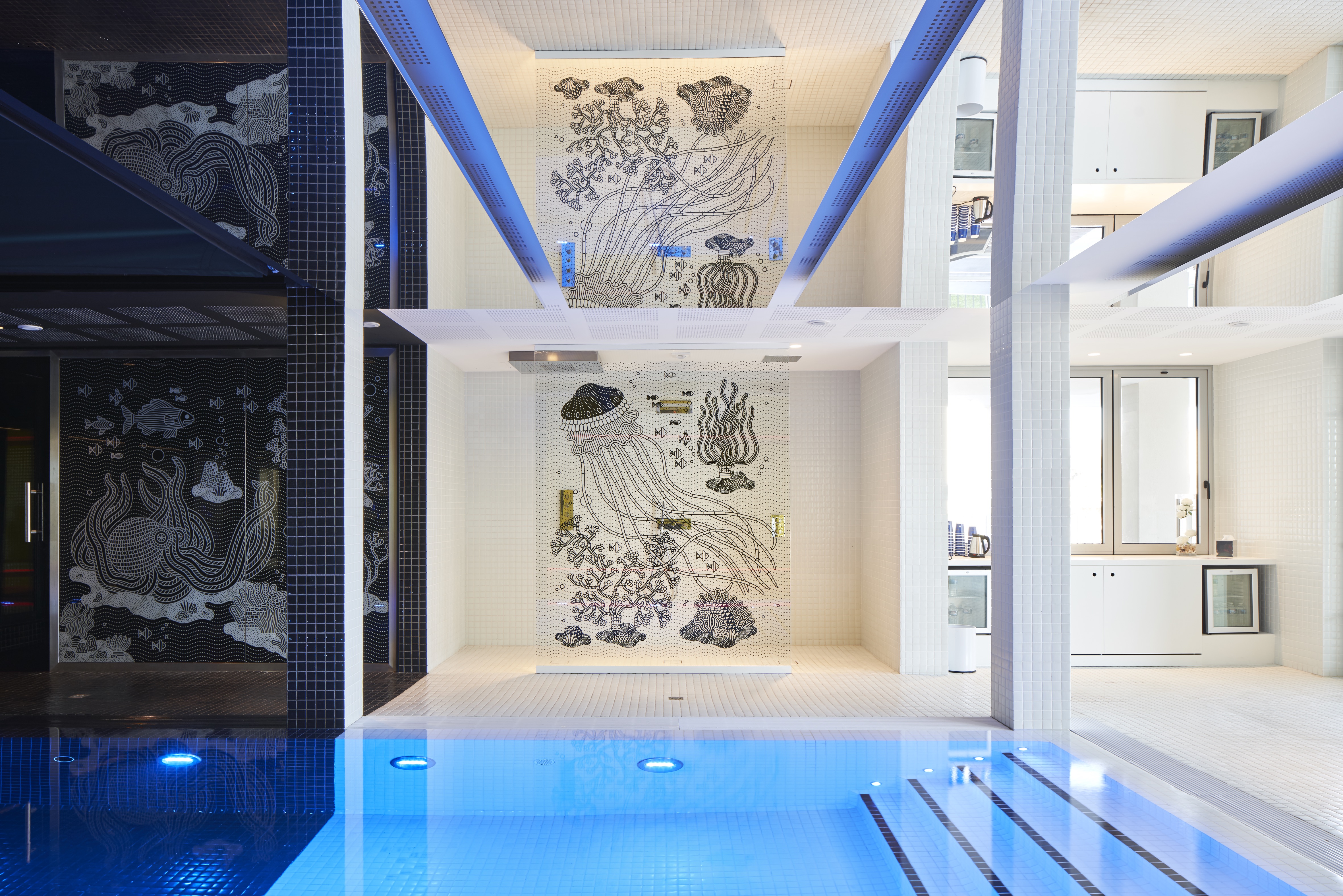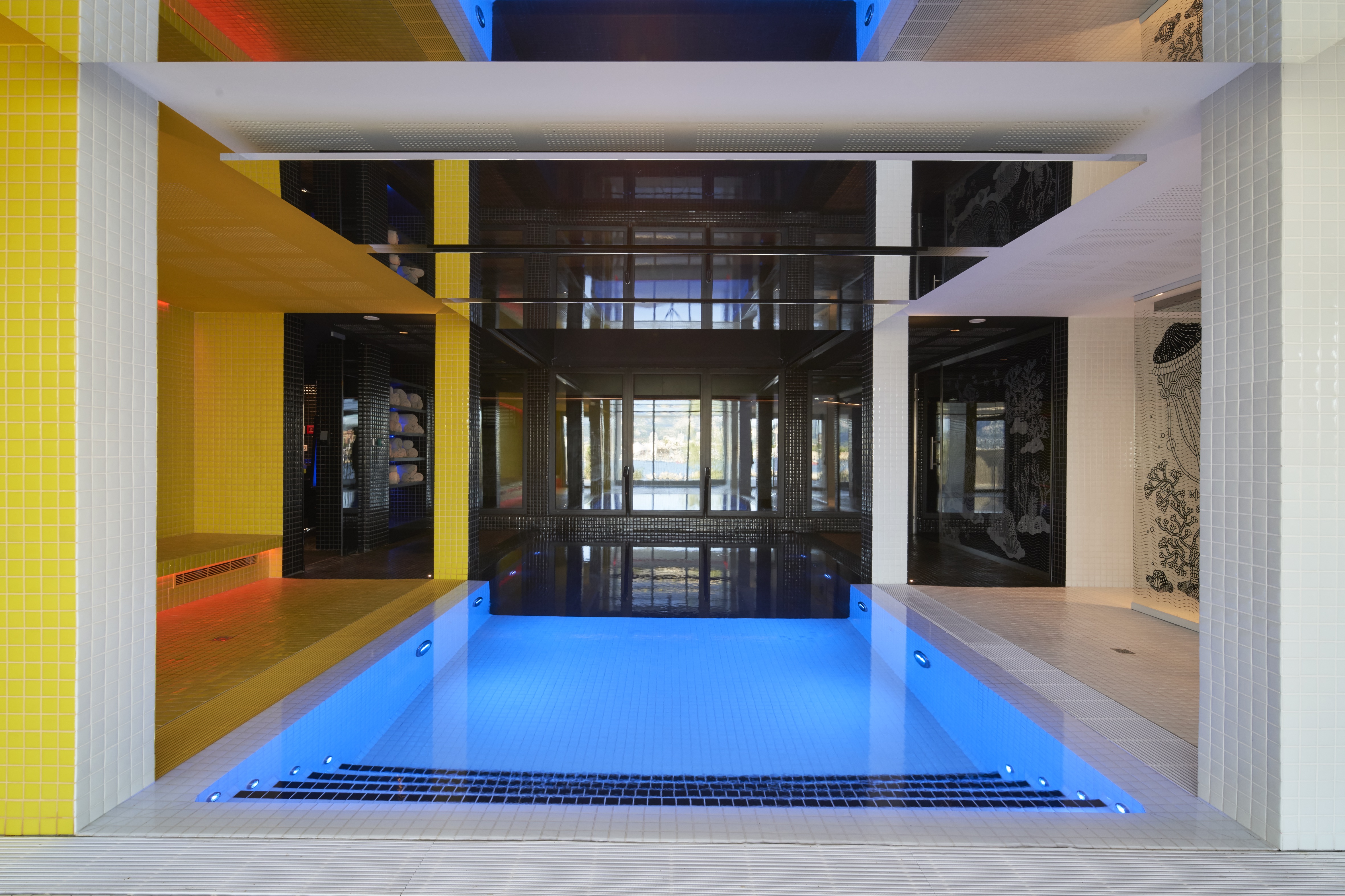 Le Spa : Situé au rez-de-chaussée, le spa se compose d’une piscine, en noir et blanc, qui est naturellement alimentée par la source du Roucas Blanc, d’un jacuzzi et d’un petit bassin extérieur inspiré d’une »boîte à sardines ». La partie noire d’un volume très vertical est légèrement éclairée par une verrière d’un bleu sombre, tandis que la partie blanche est située sous un miroir reflétant la mer toute proche. La zone de repos enveloppe le visiteur dans une énergie solaire, grâce à son sol, ses murs et son plafond entièrement jaunes. Sous la direction de LV Riviera Spa, l’espace cabine, accessible aussi à la clientèle extérieure, propose des soins et des protocoles de la marque Phytomer, experte en soins de la mer.